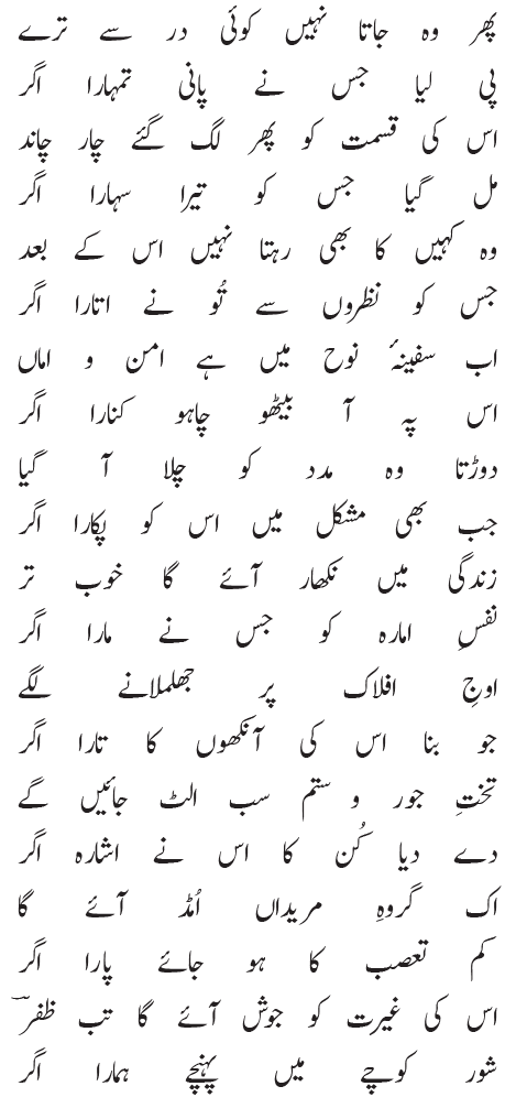 اس نظم کو بآواز سننے کے لیے یہاں کلک کیجیے: پھر وہ جاتا نہیں کوئی در سے ترے پی لیا جس نے پانی تمہارا اگر اس کی قسمت کو پھر لگ گئے چار چاند مل گیا جس کو تیرا سہارا اگر وہ کہیں کا بھی رہتا نہیں اس کے بعد جس کو نظروں سے تُو نے اتارا اگر اب سفینۂ نوح میں ہے امن و اماں اس پہ آ بیٹھو چاہو کنارا اگر دوڑتا وہ مدد کو چلا آ گیا جب بھی مشکل میں اس کو پکارا اگر زندگی میں نکھار آئے گا خوب تر نفسِ امارہ کو جس نے مارا اگر اوجِ افلاک پر جھلملانے لگے جو بنا اس کی آنکھوں کا تارا اگر تختِ جور و ستم سب الٹ جائیں گے دے دیا کُن کا اس نے اشارہ اگر اک گروہِ مریداں اُمڈ آئے گا کم تعصب کا ہو جائے پارا اگر اس کی غیرت کو جوش آئے گا تب ظفرؔ شور کوچے میں پہنچے ہمارا اگر