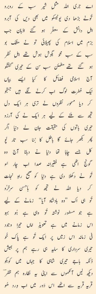 اے جری اللہ مثلِ شیر سب کے روبرو تُونے بڑھا دی یونیسکو میں بھی دیں کی آبرو اہلِ دانش کے معطّر ہو گئے اذہان جب بزم میں اسلام کی پھیلائی تو نے مشک بو سب کے سب محو بگوش ہوش تھے اہلِ نظر ہو گئے تھے مطمئن سب سن کے تیری گفتگو آج اسلامی فضائل کا کیا ایسے بیاں نیک فطرت لوگ اب کرنے لگے ہیں جستجو کر دیا مسحور نظروں نے تری ہر ایک دل تجھ سے ملنے کے لیے ہر ایک نے کی آرزو تیری باتوں کی حقیقت جان لے دنیا اگر پھر بکھر جائے گا باطل کا بُنا سب تار پُو کل جسے چاہا تھا دنیا نے دبانا آج وہ گونج اٹھی ہے فقیرانہ صدا اب چار سُو تُو نے دکھلا دی ہے دنیا کو صحیح راہِ نجات کر دیا اللہ نے تجھ کو باَحسن سرخرُو تُو ہی اک ‘‘وہ بادشاہ آیا’’ زمانے کے لیے ہے جو مسطور نوشتہ تُو وہی ہے ہُو بہو اس زمانے میں ہے تعویذِ اماں تیرا وجود فی زمانہ اس زمیں پر ایک تُو ہے پاک خُو تیری سرداری کا سایہ ہی رہے ہم پر ہمیش ڈنکہ باجے تیری شاہی کا جہاں میں کوبکو دیکھ لیں آنکھوں سے اپنی یہ نظارہ ہم ظفرؔ قریہ قریہ سے اٹھے اس دَور میں اب وِرد ھُو