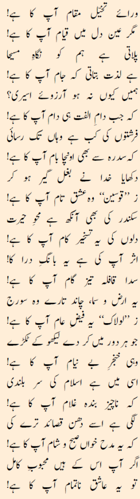 ورائے تخیّل مقام آپ کا ہے! مگر عین دل میں قیام آپ کا ہے! پلاتی ہے ہم کو نگاہِ مسیحا ہے لذت بتاتی کہ جام آپ کا ہے! ہمیں کیوں نہ ہو آرزوئے اسیری؟ کہ جب دامِ الفت ہی دام آپ کا ہے! فرشتوں کی کب ہے وہاں تک رسائی کہ سدرہ سے بھی اونچا بام آپ کا ہے! دکھایا خدا نے بغل گیر ہو کر ز ‘‘قوسین’’ وہ عشق تام آپ کا ہے! سکندر کی بھی آنکھ ہے محوِ حیرت دلوں کی یہ تسخیر کام آپ کا ہے! اثر آپ کی ہے یہ بانگِ درا کا! سدا قافلہ تیز گام آپ کا ہے! یہ ارض و سما، چاند تارے وہ سورج ز ‘‘لولاک’’ یہ فیضِ عام آپ کا ہے! جو ہر دور میں کر دے لیکھو کے ٹکڑے وہی خنجرِ بے نیام آپ کا ہے! اسی میں ہے اسلام کی سر بلندی کہ ناچیز بندہ غلام آپ کا ہے! لگی ہے اسے دھن قصائد ترے کی کہ یہ مدح خواں صبح و شام آپ کا ہے! اگر آپ اس کے ہیں محبوبِ کامل تو یہ عاشق ناتمام آپ کا ہے!