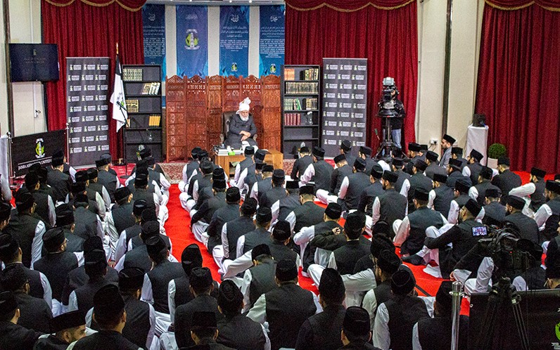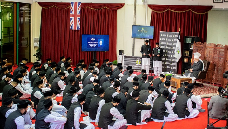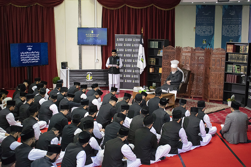 طلباء جامعہ احمدیہ برطانیہ کی اپنے آقا و امام حضرت مرزا مسرور احمد خلیفۃ المسیح الخامس ایّدہ اللہ تعالیٰ بنصرہ العزیز کے ساتھ ایک علمی نشست (15؍دسمبر 2019ء، بمقام آڈیٹوریم جامعہ احمدیہ یو کے) جنگِ بدر کے پسِ منظر اور حالات و واقعات پر مشتمل ٹھوس علمی پریزنٹیشنز، طلباء جامعہ کے سوالات پر حضورِ انو رکے بصیرت افروز جوابات @Jamia_UK (جامعہ احمدیہ ہیزلمئر، ہمپشئر یوکے، 15؍دسمبر 2019ء۔ نمائندگان الفضل انٹرنیشنل)سیّدنا و امامنا حضرت مرزا مسرور احمد خلیفۃ المسیح الخامس ایّدہ اللہ تعالیٰ الودود بنصرہ العزیز آج جامعہ احمدیہ برطانیہ میں رونق افروز ہوئے۔ آج حضور پُر نور کے اس وزٹ کے دوران طلباء جامعہ احمدیہ کو اپنے آقا کے ساتھ ایک علمی نشست میں شامل ہونے کا موقع ملا۔ یہ علمی نشست جامعہ احمدیہ میں تقریباً تین سال بعد منعقد ہو رہی تھی۔ اس نشست کی تیاری کے لیے طلباء و متعلقہ اساتذہ جامعہ احمدیہ گذشتہ کئی ہفتوں سے مصروفِ عمل تھے۔ جوں جوں کلاس کے انعقاد کا وقت قریب آتا گیا، تیاریوں میں تیزی دکھائی دینے لگی۔ چنانچہ کلاس سے ایک روز قبل رات بارہ بجے کے قریب بھی جامعہ احمدیہ یوکے کے کیمپس میں ایسی گہما گہمی تھی گویا نصف النہار کا وقت ہو۔ علمی پروگرامز میں حصہ لینے والے طلباء اساتذہ کی رہ نمائی میں مشق کر رہے تھے، ضیافت کی ڈیوٹی پر مامور طلبہ و اساتذہ حضورِ انور کی مہمان نوازی کرنے کی تیاریوں میں مگن نظر آتے تھے وعلیٰ ھٰذا القیاس۔ حضورِ انور کی جامعہ احمدیہ میں تشریف آوری حضورِ انور ایّدہ اللہ تعالیٰ بنصرہ العزیز اسلام آباد (ٹلفورڈ) سے روانہ ہو کر دوپہر بارہ بج کر 18 منٹ پر احاطہ جامعہ احمدیہ میں رونق افروز ہوئے جہاں پرنسپل جامعہ احمدیہ محترم صاحبزادہ مرزا ناصر انعام صاحب اور سٹاف و کارکنان جامعہ احمدیہ نے حضورِانور کا استقبال کیا۔ بارہ بج کر 20 منٹ پر حضورِ انور ایّدہ اللہ تعالیٰ بنصرہ العزیزطلباء جامعہ احمدیہ کی علمی نشست کو رونق بخشنے کے لیے جامعہ احمدیہ کے آڈیٹوریم میں تشریف لائے۔ حضورپُر نور کرسی پر رونق افروز ہوئے جبکہ حضرت خلیفۃ المسیح کے خدام، طلباء جامعہ احمدیہ حضورِ انور کے سامنے کلاس وار، منظم انداز میں قطاروں میں قالین پرمؤدب بیٹھے تھے۔ حضورِ انور نے اس موقعے پر پرنسپل صاحب سے جامعہ احمدیہ کے طلباء کی تعداد کے بارے میں استفسار فرمایا۔ حضرت خلیفۃ المسیح ایّدہ اللہ کے ساتھ علمی نشست تلاوتِ قرآنِ کریم سے نشست کا باقاعدہ آغاز ہوا جس کی سعادت عزیزم احسان احمد (درجہ ثانیہ) کو حاصل ہوئی۔ تلاوت کی جانے والی سورۃ الانفال کی آیات 8 تا 11 کا اردو ترجمہ عزیزم علیم احمد (درجہ خامسہ) نے پیش کیا۔ حضرت اقدس مسیح موعود علیہ الصلوٰۃ والسلام کے پاکیزہ منظوم کلام ’محاسنِ قرآنِ کریم‘ سے بعض اشعار کا انتخاب عزیزم عبدالحئی سرمد (درجہ ممہدہ) نے خوش الحانی سے پیش کرنے کی سعادت پائی۔ @Jamia_UK ’جنگِ بدر کا قصّہ مت بھولو‘ آج کی اس علمی نشست کے لیے حضورِِ اقدس ایّدہ اللہ تعالیٰ بنصرہ العزیز نے ازراہِ شفقت ’جنگِ بدر‘ کے عنوان کی منظوری عطا فرمائی تھی۔ چنانچہ اس موضوع پرطلباء جامعہ احمدیہ نے دو پریزنٹیشنز پیش کیں۔ جنگِ بدر کا پسِ منظر حضورِ انور نے اس نشست کی پہلی پریزنٹیشن پیش کرنے کے لیے عزیزان دانیال تصوراورمصعب رشید ڈوگر (درجہ رابعہ) کے نام پکارے۔ عزیزان نے اپنی پریزنٹیشن میں جنگ بدر کا پس منظر اورجہاد بالسیف کی اجازت ملنے سے پہلے کے حالات و واقعات کو بیان کیا۔ انہوں نے بتایا کہ مسلمانوں کو مدینہ کی طرف ہجرت کرجانے کے بعد بھی کفارِ مکہ کی طرف سے مسلسل خطرات کا سامنا تھا۔ اس پریزنٹیشن میں بتایا گیا کہ کفارِ مکہ کی شرّ انگیز کارروائیوں سے محفوظ رہنے کے لیے آنحضورﷺ نےبعض احتیاطی تدابیر اختیار کیں جن میں آس پاس کے قبائل کے ساتھ معاہدات اور خبررساں پارٹیوں کو روانہ کرنا شامل تھا۔ حضورﷺ نے مسلمانوں کے خلاف نفرت اور عداوت کی آگ پھیلانے والے کفارِ مکہ کے تجارتی قافلوں کی کارروائیوں کے سدِ باب کے لیے بھی ضروری اقدامات فرمائے۔ ط