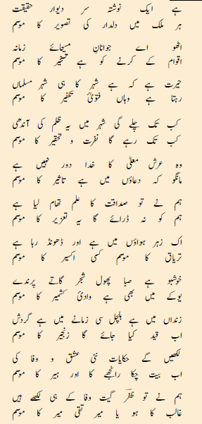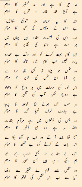نہ تیر کا ہے اور نہ شمشیر کا موسم ہے آج فقط خامہ و تحریر کا موسم اللہ کا یہ فرمان ملا ’’وسّع مکانک‘‘ ہے اس کے مکانات کی تعمیر کا موسم اب دیں کی فتوحات مقدر ہیں جہاں میں ہر سمت ہے تائید کی تقدیر کا موسم ہیں کام بہت کرنے کو اور وقت ہے محدود یارو نہیں اب کام میں تاخیر کا موسم وہ شمس جو چمکا تھا کبھی غارِ حرا سے ہے آیا اسی شمس کی تنویر کا موسم اس نور کی برسات میں ہر داغ کو دھولو ہے روح، نظر، قلب کی تطہیر کا موسم ہر سمت میں ہونے لگا توحید کا چرچا ہے چاروں طرف نعرۂ تکبیر کا موسم وہ جس کی نوشتوں میں ہے مرقوم بشارت واللہ یہ ہے وہ ہی آخیر کا موسم آنا تھا جسے آ کے وہ اب جا بھی چکا ہے اس بات کے کرنے کی ہے تشہیر کا موسم آباء نے ہمارے جو کبھی خواب بُنے تھے ہم دیکھ رہے ہیں اُسی تعبیر کا موسم وہ شخص جسے قوم نے تحقیر سے دیکھا آیا ہے اب اس شخص کی توقیر کا موسم ہے ایک نوشتہ سرِ دیوار حقیقت ہر ملک میں دلدار کی تصویر کا موسم اٹھو اے جوانانِ مسیحائے زمانہ اقوام کے کرنے کو ہے تسخیر کا موسم حیرت ہے کہ ہے شہر کا ہی شہر مسلماں رہتا ہے وہاں فتویٰٔ تکفیر کا موسم کب تک چلے گی شہر میں یہ ظلم کی آندھی کب تک رہے گا نفرت و تحقیر کا موسم وہ عرش معلی کا خدا دور نہیں ہے مانگو کہ دعاؤں میں ہے تاثیر کا موسم ہم نے تو صداقت کا علم تھام لیا ہے ہم کو نہ ڈرائے گا یہ تعزیر کا موسم اک زہر ہواؤں میں ہے اور ڈھونڈ رہا ہے تریاق کا موسم کسی اکسیر کا موسم خوشبو ہے صبا پھول شجر گاتے پرندے یوکے میں بھی ہے وادیٔ کشمیر کا موسم زنداں میں ہے ہلچل سی زمانے میں ہے گردش اب قید کیا جائے گا زنجیر کا موسم لکھیں گے حکایات نئی عشق و وفا کی اب بیت چکا رانجھے کا اور ہیر کا موسم ہم نے تو ظفؔر گیت وفا کے ہی لکھے ہیں غالب کا ہو یا میر تقی میر کا موسم
