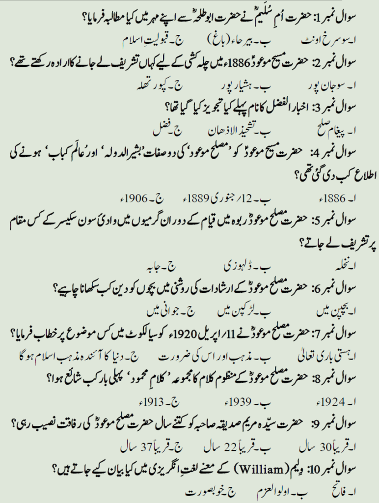 Loading… درست جوابات بتانے والے چند افراد کے اسماء الفضل انٹرنیشنل کے شمارہ 03؍مارچ 2020ء میں شائع کیے جائیں گے۔ان شاء اللہ) نوٹ: یہ سوالات الفضل انٹرنیشنل کے شمارہ 18؍ فروری 2020ء سے اخذ کیے گئے ہیں۔ شکریہ خوش خبری: اب آپ کوئز الفضل انٹرنیشنل آن لائن بھی حل کر سکتے ہیں۔ اس کے لیے ویب سائٹ alfazl.com کے صفحہ اول پر موجود ُکوئز’ کا بٹن دباکر جوابات سے دفتر الفضل انٹرنیشنل کو مطلع فرمایئے ……………………………………………………………………………… جوابات کوئز الفضل انٹرنیشنل نمبر5، 4؍فروری 2020ء 1۔غزوۂ ہوازن 2۔ سورۃ الحجرات 3۔ رعب 4۔ والدین 5۔ 50 درج ذیل افراد کی جانب سے بروقت درست جوابات موصول ہوئے: مظہر الحق (پاکستان)،ھبتہ الکلیم (اوفا، رشیا)، سعادت احمد (ماربرگ، جرمنی)، سعدیہ احمد (جرمنی)، شاہدہ نسرین (ناروے)، نجم السحر(برمنگھم نارتھ برطانیہ)، عائشہ زاہد (برمنگھم نارتھ برطانیہ)، جی ایم سرا (جرمنی)، مبارکہ خالق (بیلجیم)، امتہ القیوم انجم (کیلگر ی کینیڈا)، امتہ الرشید شیخ (کنگسٹن برطانیہ)، نادیہ خالق (پاکستان)، امتہ القدیر، صبیحہ کنول (کیلگری کینیڈا)، محمد ارشد لقمان (کینیڈا)، شاہینہ شائق (لندن)، رؤوف احمد(جرمنی)، شمشاد اختر(جرمنی)