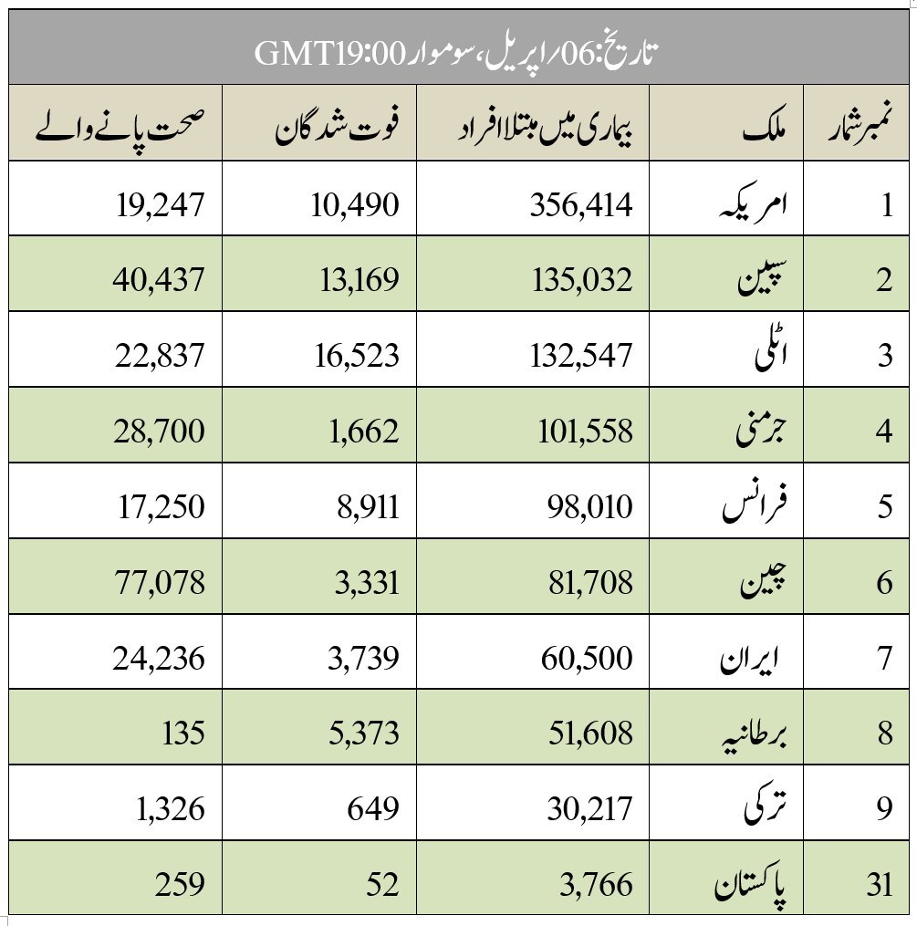 دسمبر2019ء میں ظاہر ہونے والی یہ وباء اس وقت دنیا کے 200سے زائد مما لک اور علاقوں میں پھیل چکی ہے۔ Worldometers.infoکی طرف سے جاری کئےگئے اعداد و شمار کے مطابق تمام دنیا میں اب تک کے مصدقہ کیسز کی تعداد 1,329,877؍ ہےاور اس وباء کے نتیجہ میں وفات پانے والے73,842 افراد ہیں جبکہ 277,640؍افراد Covid-19 میں مبتلا ہو کر صحت یاب ہوچکے ہیں۔ ذیل میں بعض ممالک کی ایک مختصر فہرست دی جا رہی ہے جو کہ اس وائرس سے زیادہ متاثر ہیں۔ (www.worldometers.info) (ویب سائٹ پر نظر آنے والایہ چارٹ اوپر دئے گئے وقت اور دن کے مطابق آپ کو تازہ ترین اعدادوشمار بتا رہا ہے) برطانیہ Boris Johnson کو انتہائی نگہداشت کے وارڈ میں منتقل کر دیا گیا برطانوی وزیراعظم Boris Johnson کو دس دن پہلے Covid-19 کی تشخیص ہوئی تھی اور وہ اپنی رہائش گاہ تک محدود ہو گئے تھے۔ انھیں کل رات کو بعض ٹیسٹ کے لئے ہسپتال لے جایا گیا۔ جبکہ آج ان کی طبیعت خراب ہونے کی وجہ سے انہیں انتہائی نگہداشت کے یونٹ میں منتقل کر دیا گیا ہے۔ (ہفنگٹن پوسٹ) کل بورس جانسن نے اپنی ٹویٹ میں ذکر کیا تھا کہ ان میں ابھی تک کورونا وائرس کی علامات موجود ہیں لیکن ان کا حوصلہ بلند ہے۔ https://twitter.com/BorisJohnson/status/1247137221167153153?s=20 سکاٹ لینڈ کی چیف میڈیکل آفیسر اپنے عہدے سے مستعفی سکاٹ لینڈ کی چیف میڈیکل آفیسر ڈاکٹر کیتھرین کالڈروُڈ ( Dr Catherine Calderwood) نے اپنے عہدے سے استعفیٰ دے دیا۔ موصوفہ نے ملک میں لاک ڈاؤن کے اعلان کے بعد دو مرتبہ اس اصول کی خلاف ورزی کی تھی۔ اخبار سکاٹش سَن نے جب ان کی تصاویر شائع کیں تو پولیس کی طرف سے انہیں وارننگ دی گئی۔ بعد ازاں اتوار کے روز انہوں نے اپنے عہدے سے استعفیٰ دینے کا فیصلہ کر لیا۔ ملکہ کا پیغام کس نے سنا؟ اعدادوشمار کے مطابق ملکۂ برطانیہ کا قوم سے خطاب قریبا24؍ ملین لوگوں نے سنا۔ یہ تعداد پچھلے خطاب سے دوگنا زیادہ ہے۔ ملکہ نے اپنے خطاب میں اس وبا سے نمٹنے کے لیے بے مثال کام کرنے پر برطانیہ کے طبی عملے کا شکریہ ادا کیا تھا اور لوگوں کو مضبوط اور متحد رہنے کا کہا تھا۔ مذکورہ تعداد میں آن لائن سننے والے شامل نہیں ہیں۔ (بی بی سی) برطانیہ میں Covid-19 سے ہونے والی ہلاکتوں کی تعداد 5,373ہوگئی ہے۔ (بی بی سی) آپ لندن میں رہتے ہیں؟ اگر آپ لندن میں رہتے ہیں تو میئر صادق خان کی ان باتوں کو ذہن نشین کر لیں۔ https://twitter.com/SadiqKhan/status/1247043668319617031?s=20 امریکہ امریکہ میں Covid-19 سے ہونے والی اموات10,000 سے تجاوز کرگئی ہیں۔ امریکہ میں اس وقت Covid-19 کے مصدقہ مریضوں کی تعداد 356,000سے زائد ہے اور 10,490؍اموات ہوئی ہیں۔ (بی بی سی) امریکی نیوی کمانڈر بھی Covid-19 کے مرض میں مبتلا امریکی بحری جہاز USS Theodore Roosevelt کے کمانڈرCapt. Brett Crozier نے انتظامیہ کو خبردار کیا تھا کہ جہاز کے عملہ میں Covid-19 کے کئی مریض موجود ہیں اور انھیں مدد کی ضرورت ہے۔ ان کو نا اہل قرار دے کر ان کی ذمہ داریوں سے ہٹا دیا گیا تھا۔ Capt. Crozier میں بھی Covid-19 کی علامات پائی گئی تھیں اور ان کا ٹیسٹ مثبت آیا ہے۔ (سی این این) نیویارک نیویارک میں اتوار کے روز Covid-19 سے 594؍افراد کی ہلاکت ہوئی جو کہ ہفتہ کے روز سے کم ہے۔ تاہم واشنگٹن ڈی سی، ڈیٹرائٹ اورNew Orleans میں کیسز کی تعداد میں اضافہ ہوا ہے۔ (بی بی سی) ایک چیتے کو بھی Covid-19 امریکہ کے ایک چڑیا گھر میں ایک چیتے کو جب خشک کھانسی کی شکایت ہوئی تو ٹیسٹ کرنے پر اس کا Covid-19 کا ٹیسٹ مثبت آیا۔ اس چیتے کا نام Nadia ہے، اورامریکہ میں جانوروں میں کورونا وائرس کا یہ پہلا معلوم کیس ہے۔ (سی این این) یورپ اٹلی اتوار کے روز اٹلی میں ہونےوالی اموات دو ہفتے میں کسی بھی روز ہونے والی اموات سے کم تھیں۔ جبکہ گذشتہ 24؍ گھنٹوں میں 636؍ اموات ہوئی ہیں۔ انتظامیہ اس بارے میں پر امید ہے کہ نئے ہونے والے کیسز میں کمی کا رجحان ہے۔ ابھی تک اٹلی میں Covid-19سے 16,523؍ اموات ہوئی ہیں۔ (بی بی سی) فرانس فرانس میں گزشتہ24گھنٹوں کے دوران 833؍اموات ہوئی ہیں جو فرانس میں Covid-19میں ایک دن میں ہونے والی سب سے زیادہ اموات ہیں۔ (بی بی سی) سپین حکومت ملک بھر میں دس لاکھ ٹیسٹ کرنے والی کٹس تقسیم کرے گی۔ اور ایسے لوگوں کو جن میں علامات پائی جائیں گی، 