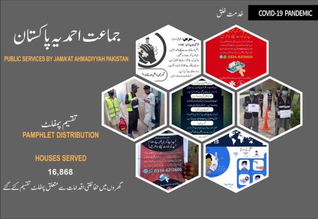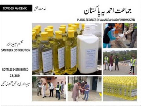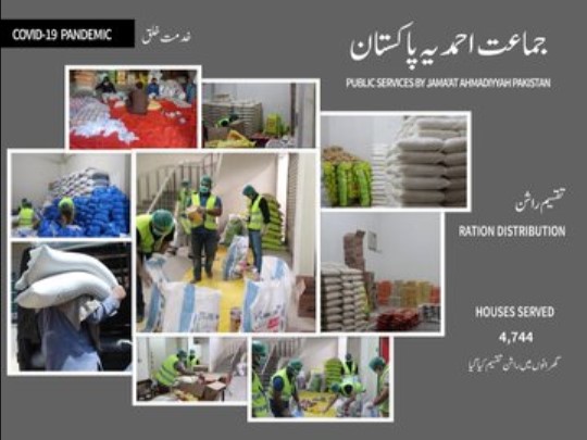 اب تک کروڑوں روپے کا راشن و دیگر امدادی اشیاء کی تقسیم ۔گھر گھر آگاہی مہم جاری احمدی نوجوان بڑھ چڑھ کے وزیر اعظم کے ریلیف پروگرام میں شرکت کر رہے ہیں پہلی قسط کے طور پر تیس لاکھ روپے وزیر اعظم کے کورونا ریلیف فنڈ میں جمع کروا دیے گئے ۔ترجمان جماعت احمدیہ Listen to 2020-04-10_27-29(Press Release) byAl Fazl International on hearthis.at ربوہ (پ ر) کورونا وائرس کی صورت حال سے عوام کو درپیش مسائل کے حل کے لیے جماعت احمدیہ اپنی درخشاں روایت کے مطابق بنی نوع انسان کی بے لوث ہمدردی کے جذبہ سے ہم وطنوں کی خدمت کر رہی ہے۔ اب تک کے کاموں کی کچھ جھلکیاں پیش ہیں۔ ٭ پاکستان بھر میں7228ضرورت مند گھروں میں راشن پیکس اور نقدرقوم کی تقسیم کر دی گئی ہے۔ ٭ ہینڈ سینیٹائزر کی23380 بوتلیں تقسیم کی گئیں۔ ٭ فیس ماسک 3500اور صابن 5000کی تعداد میں تقسیم کیا گیا۔ ٭ آگاہی مہم کے سلسلہ میں15706گھروں سے رابطہ کیا گیااور16868گھروں میں معلوماتی پمفلٹ تقسیم کیے گئے ۔ ٭ ربوہ شہر کی تمام رہائشی کالونیوں اور سڑکوں بشمول مسیحی بستی اور گرجا گھروں کو کلورین ملے پانی سے دھویا جا رہا ہے۔ ٭ احمدی نوجوان وزیر اعظم کی اعلان کردہ ریلیف فورس میں بڑھ چڑھ کر رجسٹر ہو رہے ہیں۔ ٭ وزیر اعظم کے قائم کردہ کوروناریلیف فنڈ میں ابتدائی طور پر30 لاکھ روپے کی رقم جمع کرائی گئی ہے۔ ترجمان جماعت احمدیہ پاکستان سلیم الدین کاکہنا ہے کہ جماعت احمدیہ کی ہمیشہ سے یہ روایت ہے کہ جب بھی ملک کوکسی مشکل کا سامنا ہوا، احمدی ملک کی خدمت کے لیے صف اوّل میں کھڑے ہوتے ہیں۔ ملک کے دفاع کی بات ہو ،یا وطن کی تعمیر و ترقی کا کام ہو ،زلزلہ کی مشکلات ہوںیا سیلاب کی آفت کا سامنا ہو، جماعت احمدیہ کو ہر موقع پر ملک کے لیے اپنی خدمات پیش کرنے کاموقع ملا ہے۔ترجمان نے کہا کہ کورونا وائرس سے مقابلہ کے لیے امتحان کی اس گھڑی میں بھی جماعت احمدیہ پاکستان بلا امتیاز مذہب و ملت اپنے ہم وطنوں کی خدمت میں پیش پیش ہے۔جب بھی وطن عزیز کو ضرورت پڑی احمدی اپنی جان و مال سے بے لوث خدمت کے لیے حاضرہوئے ہیں۔ترجمان نے عوام سے اپیل کی ہے کہ ان نازک حالات میں تمام اختلافات بھلا کر ضرورت مندہم وطنوں کے لیے بھائی چارہ کے جذبہ کے ساتھ آگے بڑھیں اور اس بیماری کے خلاف حکومتی اقدامات پر عمل درآمد کریں۔ترجمان نے کہا کہ ہماری دعا ہے کہ اللہ تعالی بنی نوع انسان کو اس وبا سے جلدنجات دے###