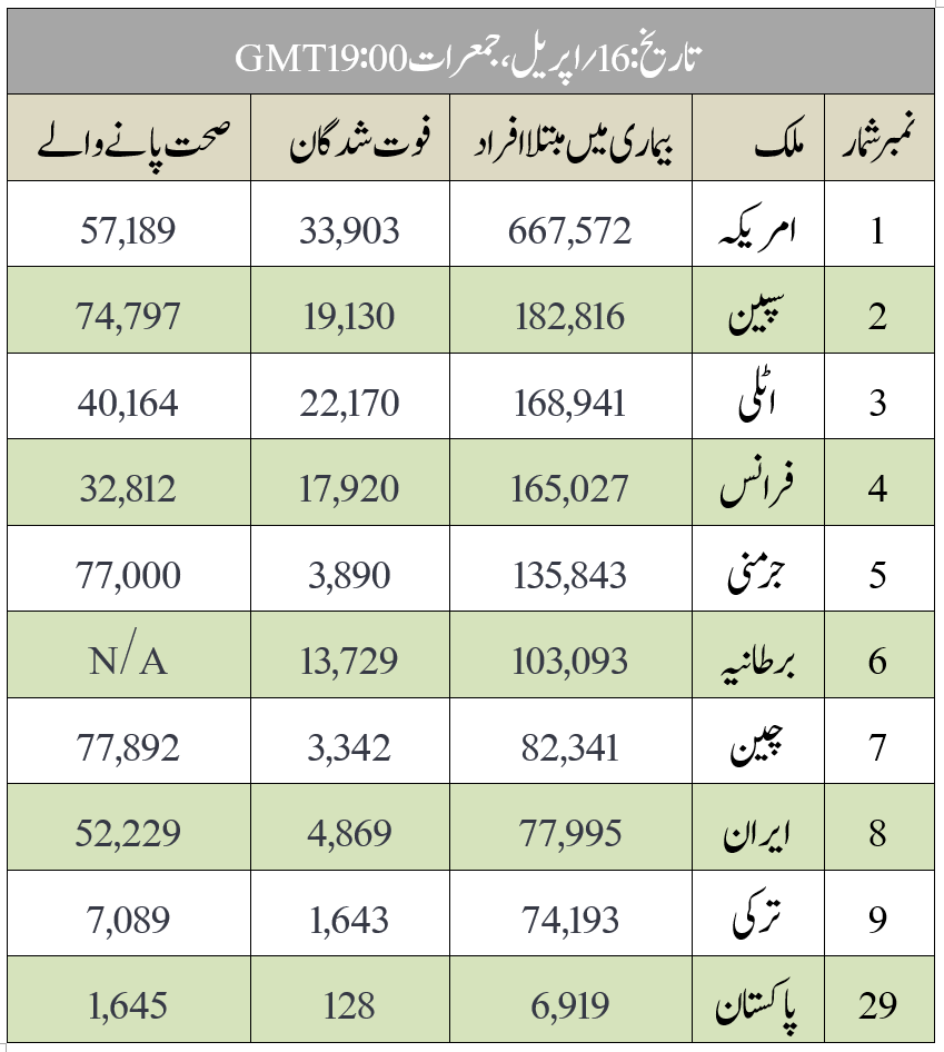 مجلس خدام الاحمدیہ یوکے۔#Prayforheroes WHO کیا ہے؟ اس کا کیا کام ہے؟ ویکسین کے بارے میں اقوام متحدہ کا کیا کہنا ہے؟ برطانیہ میں لاک ڈاؤن میں تین ہفتے کی توسیع باغ میں چہل قدمی سے 15ملین پاؤنڈ کا چندہ یورپ میں Covid-19سے جاں بحق ہونے والوں کی تعداد 90,000سے تجاوز کرگئی امریکہ میں مزید 21ملین لوگ بے روزگار کچھوے کو واک کروانے پر جرمانہ۔ شیروں کو کھلی آزادی دسمبر2019ء میں ظاہر ہونے والی یہ وباء اس وقت دنیا کے 210 مما لک اور علاقوں میں پھیل چکی ہے۔ Worldometers.infoکی طرف سے جاری کئےگئے اعداد و شمار کے مطابق تمام دنیا میں اب تک کے کنفرمڈ کیسز کی تعداد 2,164,967؍ہےاور اس وباء کے نتیجہ میں وفات پانے والے144,313؍اور 546,230؍افراد Covid-19 میں مبتلا ہو کر صحت یاب ہوچکے ہیں ذیل میں بعض ممالک کی ایک مختصر فہرست دی جا رہی ہے جو کہ اس وائرس سے زیادہ متاثر ہیں۔ (www.worldometers.info) (ویب سائٹ پر نظر آنے والایہ چارٹ اوپر دئے گئے وقت اور دن کے مطابق آپ کو تازہ ترین اعدادوشمار بتا رہا ہے۔) مجلس خدام الاحمدیہ برطانیہ Pray for Heroes مجلس خدام الاحمدیہ برطانیہ نےملک بھر کے NHS کے کارکنان کا شکریہ ادا کرنے اور ان کے حوصلہ بلند کرنے کی غرض سے آج دعا کی ایک مہم #PrayforHeroes کے عنوان سے شروع کی ہے۔ یہ مہم آج 7؍بجے برطانوی وقت کے مطابق چلائی جاچکی ہے۔ https://twitter.com/ukmuslimyouth/status/1250856938218369024?s=21 https://twitter.com/ukmuslimyouth/status/1250856938218369024?s=21 گذشتہ ایک ماہ کے دوران مجلس خدام الاحمدیہ نے مختلف مہمات کے ذریعہ NHS اور دیگر ضرورت مند افراد کی مدد کی ہے۔ ٭… 600 NHS کے کارکنان کی food packaging میں مدد کی گئی ٭… 3200 گھرانوں میں راشن اور ادویات پہنچائی گئیں ٭… ملک بھر میں 25 فوڈ بنکس قائم کیے گئے ٭… 20 لوکل کاؤنسلز اور 23 charities کی مختلف پیرایوں میں مدد کی گئی https://twitter.com/TrueIslamScot/status/1250821773605691394?s=20 https://twitter.com/TrueIslamScot/status/1250821773605691394?s=20 WHO اقوام متحدہ کی ایجنسی عالمی ادارۂ صحت کا قیام 1948ء میں ہوا تھا۔ اور یہ اپنے آپ کو عوامی صحت کا عالمی نگران کہتا ہے۔ اور اس کا مطمح نظرتمام لوگوں کے لئے صحت کی بہترین سہولیات کو میسر بنانا ہے۔ گذشتہ 11سالوں میں اس نے دنیا بھر میں 6وباؤں بشمول Ebola کی روک تھام کے لئے کام کیا ہے۔ اس ادارہ کے بعض اہم کام درج ذیل ہیں: ٭…کسی وباء کے متعلق عالمی طور پر خبردار کرنا ٭…تحقیقات کرنا اور نئی دواؤں اور ویکسین کی تیاری میں تیزی لانا ٭…وباء زدہ علاقوں میں تحقیقات کے لئے ماہرین بھیجنا کہ وہ پتہ لگائیں کہ کیاکیا جائے؟ اس سب کے باوجود یہ صرف ایک تجویزی ادارہ ہے جو حکومتوں کو تجاویز دیتا ہے کہ اپنے شہریوں کی صحت کو کیسے بہتر کرے اور وباؤں کی روک تھام کیسے کی جائے۔ لیکن یہ ان تجاویز کو لاگو نہیں کرسکتا۔ اس کا سالانہ بجٹ قریباً 2.2بلین ڈالر ہے۔ امریکہ نے گذشتہ سال اس مد میں 400ملین ڈالر کی مدد کی تھی۔ اس ادارۂ کے بجٹ میں کسی بھی کمی سے دنیا بھر میں Covid-19 کے ساتھ ساتھ، ملیریا، ٹی بی اور پولیو کے خلاف ہونے والی کوششوں کو شدید مشکلات کا سامنا ہو گا۔(بی بی سی) امریکہ نے WHOکی امداد بند کرنے کا اعلان کیا ہے۔ اس سے اس ادارہ کے 720ملین ڈالر تک کے فلاحی پروگراموں کو نقصان ہوگا۔ (الجزیرہ) اقوام متحدہ اقوام متحدہ کے سیکرٹری جنرل Antonio Guterres کا کہنا ہے کہ کورونا وائرس کی ویکسین ہی معمولات زندگی بحال کرسکتی ہے۔ ان کا کہنا ہے کہ محفوظ اور مؤثر ویکسین واحد ہتھیار ہے جو دنیا کو معمول پر لاسکتا ہے، یہ لاکھوں لوگ اور کھربوں ڈالر بچا سکتا ہے۔ ان کا کہنا تھا کہ کوشش ہے کہ 2020ء کے اختتام تک اس کی ویکسین تیار کرلی جائے۔ (VOA اردو) برطانیہ برطانیہ میں Covid-19سے جاں بحق ہونے والوں کی تعداد 13,729ہوگئی ہے۔ (بی بی سی) برطانوی حکومت کا کہنا ہے کہ Covid-19کے روزانہ ٹیسٹوں کی صلاحیت 35,000 روزانہ کی ہوگئی ہے۔ (بی بی سی) Dominic Raab کا کہنا ہے کہ سماجی دوری کے اقدامات سے فائدہ ہو رہا ہے۔ لیکن ابھی تک انفیکشن اس طرح کم نہیں ہو رہے جس طرح ہونے چاہئیں۔ اور لاک ڈاؤن کے انتظامات میں تبدیلی سے انفیکشن زیادہ ہونے کا خدشہ ہے۔ اس لئے موجودہ پابندیاں مزید تین ہفتے تک جاری رہیں گی۔ (بی بی سی) h