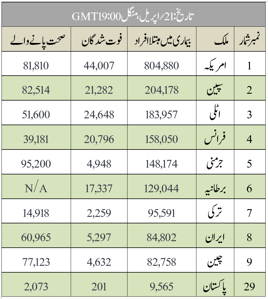 برطانیہ میں ویکسین کے تجربات جمعرات سے ہوں گے WHOکی مدد کون کرتا ہے؟ کیا کورونا چمگادڑوں سے شروع ہوا تھا؟ دنیا کے دس صحت مند ترین ممالک کون سے ہیں؟ پاکستان کی عوامی رائے کیا ہے؟ تیل کی منفی قیمتیں سیرالیون کے صدر خود ساختہ تنہائی میں تیندوا سڑک کنارے آرام کررہا ہے دسمبر2019ء میں ظاہر ہونے والی یہ وباء اس وقت دنیا کے 210 مما لک اور علاقوں میں پھیل چکی ہے۔ Worldometers.infoکی طرف سے جاری کئےگئے اعداد و شمار کے مطابق تمام دنیا میں اب تک کے کنفرمڈ کیسز کی تعداد 2,536,944؍ہےاور اس وباء کے نتیجہ میں وفات پانے والے175,771؍اور 686,215؍افراد Covid-19 میں مبتلا ہو کر صحت یاب ہوچکے ہیں۔ ذیل میں بعض ممالک کی ایک مختصر فہرست دی جا رہی ہے جو کہ اس وائرس سے زیادہ متاثر ہیں۔ (www.worldometers.info) (ویب سائٹ پر نظر آنے والایہ چارٹ اوپر دئے گئے وقت اور دن کے مطابق آپ کو تازہ ترین اعدادوشمار بتا رہا ہے۔) WHOکو امداد دینے والے TOP 10ممالک اور ادارے https://twitter.com/dharmoon_malhi/status/1252455265431105542?s=20 https://twitter.com/dharmoon_malhi/status/1252455265431105542?s=20 کورونا وائرس چمگادڑوں سے شروع ہوا عالمی ادارۂ صحت کا کہنا ہے کہ تمام موجودہ شواہد سے یہ بتاتے ہیں کہ کورونا وائرس گزشتہ سال چین میں چمگادڑوں سے شروع ہوا اور کسی بھی لیب میں تیار نہیں کیا گیا۔ (الجزیرہ) اقوام متحدہ اقوام متحدہ کا کہنا ہے کہ موجودہ معاشی بحران کی وجہ سے خوراک کی کمی کا شکار لوگوں کی تعداد دگنی ہوسکتی ہے اور 265ملین لوگ متأثر ہوسکتے ہیں۔ (الجزیرہ) طبی سہولیات اور صحت کے معیار کے مطابق دنیا کے دس پہلے ممالک 2019ء کے The Legatum Prosperity Indexکے مطابق یہ دنیا کے پہلے دس صحت مند ممالک ہیں۔ سنگاپور۔ جاپان۔ سوئٹزرلینڈ۔ جنوبی کوریا۔ ناروے۔ ہانگ کانگ۔ آئس لینڈ۔ ڈنمارک۔ ہالینڈ اور آسٹریا۔ آپ کا ملک کس نمبر پر ہے؟ https://twitter.com/ProsperityIndex/status/1250039322641915905?s=20 https://twitter.com/ProsperityIndex/status/1250039322641915905?s=20 دنیا بھر میں Covid-19کے مریضوں کی تعداد 25لاکھ سے تجاوز کرگئی ہے۔ گذشتہ 6دنوں میں پانچ لاکھ مریضوں کا اضافہ ہوا ہے۔ (ڈان) https://twitter.com/AFP/status/1252640790049894401?s=20 https://twitter.com/AFP/status/1252640790049894401?s=20 ایشیا پاکستان Gallupسروے کے مطابق پاکستان کے قریباً 65 فیصد افراد اس حق میں ہیں کہ موجودہ صورتحال میں نمازیں مساجد میں نہ ادا کی جائیں۔ (بی بی سی اردو) https://twitter.com/GallupPak/status/1252511444995891201?s=20 https://twitter.com/GallupPak/status/1252511444995891201?s=20 وزیراعظم کے مشیر ڈاکٹر فیصل سلطان نے بتایا ہے کہ وزیراعظم پاکستان عمران خان کا Covid-19کا ٹیسٹ ہوگا۔ گذشتہ دنوں انہوں نے فلاحی ادارے ایدھی فاؤنڈیشن کے سربراہ فیصل ایدھی سے ملاقات کی تھی۔ فیصل ایدھی کا کورونا وائرس کا ٹیسٹ مثبت آیا ہے۔ فیصل ایدھی، مشہور شخصیت عبدالستار ایدھی مرحوم کے صاحبزادے ہیں۔ (ڈان) پاکستان میں Covid-19سے شفایاب ہونے والوں کی تعداد 2,000سے تجاوز کرگئی ہے۔ جبکہ اب تک اس مرض سے 200سے زائد اموات ہوئی ہیں۔(ڈان) پاکستان میں سوموار کے روز ایک دن میں سب سے زیادہ17؍افراد Covid-19سے جاں بحق ہوئے۔ اور اسی روز ایک دن میں سب سے زیادہ705نئے کیسز رپورٹ ہوئے۔ (الجزیرہ) پاکستان سعودی عرب، امریکہ، ترکی، اٹلی،برطانیہ قزاقستان اور قطر کو کلوروکین کی گولیاں بھجوائے گا۔ (ڈان) پاکستان ذخیرہ اندوزی کرنے والوں کو تین سال قید اور ضبط شدہ مال پر 50فیصد جرمانہ کرے گا۔ ایسے ذخیرہ اندوزی کرنے والوں کی نشاندہی کرنے پر 10 فیصد انعام دیا جائے گا۔ (ڈان) https://twitter.com/Dr_FirdousPTI/status/1252442760088629248?s=20 https://twitter.com/Dr_FirdousPTI/status/1252442760088629248?s=20 افغانستان افغانستان کا صدارتی محل بھی کورونا وائرس سے متأثر ہوا ہے۔ تاہم افغان صدر اشرف غنی اور خاتون اول کا کورونا وائرس کا ٹیسٹ منفی آیا ہے۔ نیویارک ٹائم کے مطابق صدارتی محل کے قریباً 40ارکان کورونا وائرس سے متأثر ہوئے ہیں۔ (الجزیرہ) https://twitter.com/SediqSediqqi/status/1252497548172038144?s=20 https://twitter.com/SediqSediqqi/status/1252497548172038144?s=20 یورپ برطانیہ میں ایک ہفتے میں ریکارڈ اموات برطانیہ میں 10؍اپریل کو ختم ہونے والے ہفتے میں برطانیہ میں 18,500؍اموات ہوئیں۔ جو کہ 20سال میں پہلی بار ہوا ہے۔ یہ گذشتہ سال کے اسی وق