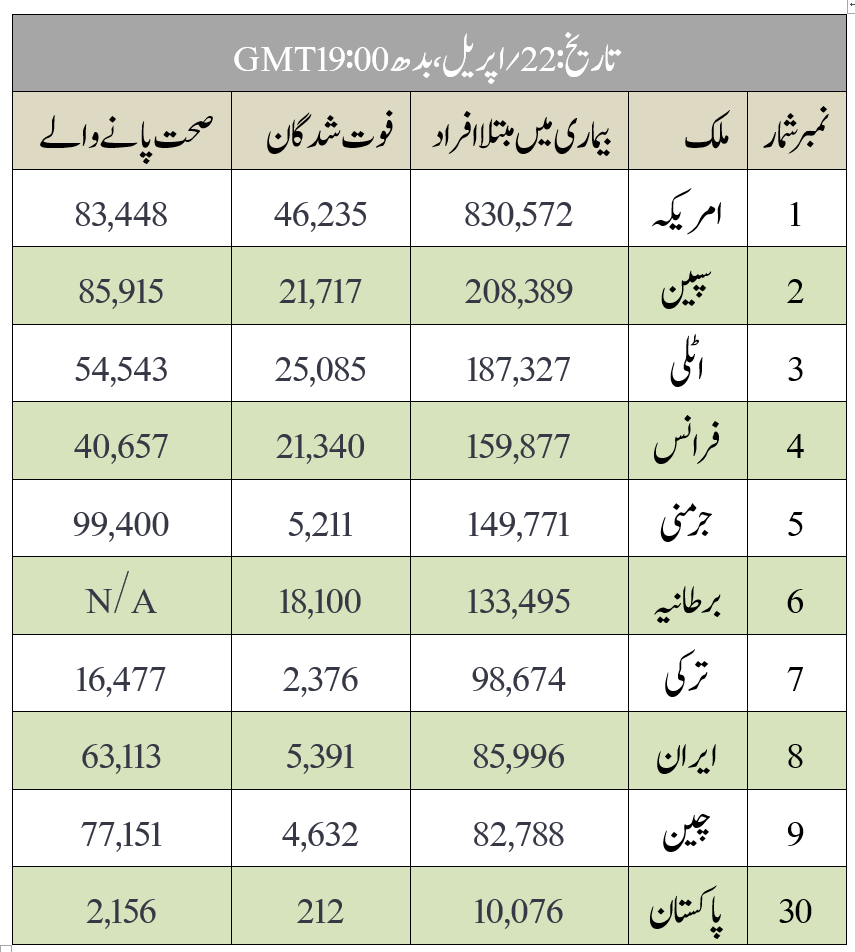 عالمی ادارۂ صحت نے حکومتوں کو کیا مشورہ دیا ہے؟ فضا میں کاربن ڈائی آکسائیڈ میں کمی تھائی لینڈ میں ایک ماہ کا بچہ صحت یاب برطانیہ میں طبی کارکنان گھروں سے باہر رہنے پر مجبور کیپٹن مور نے 28ملین پاؤنڈز اکٹھے کر لیے آنکھوں کے پانی میں کورونا وائرس امریکہ میں امیگریشن بند دسمبر2019ء میں ظاہر ہونے والی یہ وباء اس وقت دنیا کے 210 مما لک اور علاقوں میں پھیل چکی ہے۔ Worldometers.infoکی طرف سے جاری کئےگئے اعداد و شمار کے مطابق تمام دنیا میں اب تک کے کنفرمڈ کیسز کی تعداد 2,614,289؍ہےاور اس وباء کے نتیجہ میں وفات پانے والے182,453؍اور 714,305؍افراد Covid-19 میں مبتلا ہو کر صحت یاب ہوچکے ہیں۔ ذیل میں بعض ممالک کی ایک مختصر فہرست دی جا رہی ہے جو کہ اس وائرس سے زیادہ متاثر ہیں۔ (www.worldometers.info) (ویب سائٹ پر نظر آنے والایہ چارٹ اوپر دئے گئے وقت اور دن کے مطابق آپ کو تازہ ترین اعدادوشمار بتا رہا ہے۔) WHO عالمی ادارۂ صحت کا کہنا ہے کہ سگریٹ نوشی آپ کو Covid-19سے متأثر کرسکتی ہے۔ https://twitter.com/WHO/status/1252869346667327496?s=20 https://twitter.com/WHO/status/1252869346667327496?s=20 عالمی ادارۂ صحت نے تمام ممالک سے کہا ہے کہ وہ Covid-19سے بچاؤ کے لئےتمام بہترین طبی اقدامات کریں، کیسز کو ڈھونڈیں، ٹیسٹ کریں، انہیں الگ کرکے ان کا خیال رکھیں اور ان کے تمام رابطوں کو ڈھونڈ کر الگ کریں۔ https://twitter.com/WHO/status/1252909092848500736?s=20 https://twitter.com/WHO/status/1252909092848500736?s=20 WMO عالمی ادارہ موسمیات World Meteorological Organizationکے مطابق اس سال کورونا وائرس کی وباء کی وجہ سے پیدا ہونے والے اثرات کے نتیجہ میں کاربن ڈائی آکسائیڈ کے اخراج میں 6فیصد کی کمی متوقع ہے۔ (الجزیرہ) ایشیا پاکستان وزیراعظم پاکستان عمران خان کا کورونا وائرس کا ٹیسٹ منفی آیا ہے۔ (ڈان) https://twitter.com/Dr_FirdousPTI/status/1252996922287296512?s=20 https://twitter.com/Dr_FirdousPTI/status/1252996922287296512?s=20 پاکستان میں رہنے والے ڈاکٹروں اور ملک سے باہر رہنے والے ڈاکٹروں نے حکومت پاکستان کو ایک خط لکھا ہے جس میں کہا گیا ہے کہ وہ لاک ڈاؤن میں کی گئی نرمیوں پر نظرثانی کریں اور مسجد میں نماز باجماعت کی اجازت کو تین سے پانچ نمازیوں تک ہی محدود رکھیں۔ اس خط میں پاکستان کے تاجر طبقہ اور علماء کو بھی مخاطب کیا گیا ہے۔ ڈاکٹروں کا کہنا ہے کہ ان نرمیوں کی وجہ سے وائرس کے مزید پھیلنے کا خدشہ ہے۔ (دان) موجودہ صورتحال میں پاکستان میں Covid-19سے شرح اموات 2.1فیصد اور صحت یابی کی شرح 22.1ہے۔ (بی بی سی اردو) پاکستانی حکومت نے لاک ڈاؤن میں نرمی کرتے ہوئے سماجی دوری قائم رکھتے ہوئے مساجد میں نماز باجماعت کی اجازت دی ہے۔ (ڈان) https://twitter.com/Dawn_News/status/1252695094031003652?s=20 https://twitter.com/Dawn_News/status/1252695094031003652?s=20 پاکستان میں Covid-19سے اب تک 10,000سے زائد لوگ بیمار ہوچکے ہیں۔2,000سے زائد شفایاب اور200سے زائد جاں بحق ہوئے ہیں۔ (ڈان) اسلام آبا د میں مدرسہ باب الاسلام کے خطیب قائم علی شاہ کےوالد کا دو روز قبل انتقال ہوا تھا۔ ڈپٹی کمشنر کے مطابق ان کے والد کا کورونا وائرس کا ٹیسٹ لیا گیا تھا جو کہ مثبت آیا ہے۔ مزید ٹیسٹ کرنے پر ان کے قریبیوں میں سے سات کا ٹیسٹ مثبت آیا ہے۔ انتظامیہ نے مدرسے اور مسجد کو سیل کرنے کا فیصلہ کیا ہے۔ (VOAاردو) آجکل کراچی کیسا نظر آرہا ہے؟ https://twitter.com/NadeemfParacha/status/1252592655323840523?s=20 https://twitter.com/NadeemfParacha/status/1252592655323840523?s=20 بھارت محکمۂ صحت بھارت نے ٹیسٹ کے نتائج میں شکوک وشبہات کی وجہ سے اینٹی باڈیز ٹیسٹ کرنے روک دئے ہیں۔ بھارت میں Covid-19کے متأثرین کی تعداد20,000کے قریب ہے۔(ڈان) بھارت میں ممبئی کے 53اور چنائی کے 25صحافیوں کا کورونا وائرس کا ٹیسٹ مثبت آیا ہے۔ (VOAاردو) افغانستان افغان صدارتی دفتر کے ترجمان کے مطابق صدر اشرف غنی اور ان کی اہلیہ کا کورونا وائرس کا ٹیسٹ کیا گیا تھا جس کے نتائج منفی آئے ہیں۔ (VOAاردو) https://twitter.com/SediqSediqqi/status/1252497548172038144?s=20 https://twitter.com/SediqSediqqi/status/1252497548172038144?s=20 جاپان جاپان کے ایک یتیم خانے میں آٹھ نوزائیدہ بچوں کا Covid-19کا ٹیسٹ مثبت آیا ہے۔16؍اپریل کو اس ادارے کی ایک نرس کا ٹیسٹ مثبت آیا تھا۔ انتظامیہ کا کہنا ہے کہ بچوں کی حالت اچھی ہے اور ان کی ہسپتال میں دیکھ 