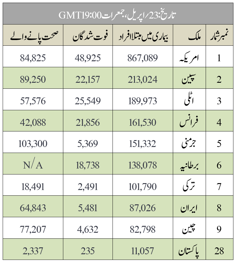آئرلینڈ میں مریضوں کی تعداد میں کمی چین نے کی WHO کی مدد فرانس میں سکول کھل رہے ہیں۔ والدین پر اپنے بچے سکول بھیجنے پر پاپندی نہیں اینٹی باڈیز ٹیسٹ سے نیویارک میں کیا پتہ چلا؟ پانچ ممالک کو قحط کا خطرہ بھارت میں سرکاری ملازمین کی تنخواہ میں اضافہ روک دیا گیا دو پالتو بلیوں کو کورونا وائرس ہوگیا دسمبر2019ء میں ظاہر ہونے والی یہ وباء اس وقت دنیا کے 210 مما لک اور علاقوں میں پھیل چکی ہے۔ Worldometers.infoکی طرف سے جاری کئےگئے اعداد و شمار کے مطابق تمام دنیا میں اب تک کے کنفرمڈ کیسز کی تعداد 2,699,460؍ہےاور اس وباء کے نتیجہ میں وفات پانے والے188,930؍اور 740,366؍افراد Covid-19 میں مبتلا ہو کر صحت یاب ہوچکے ہیں۔ ذیل میں بعض ممالک کی ایک مختصر فہرست دی جا رہی ہے جو کہ اس وائرس سے زیادہ متاثر ہیں۔ (www.worldometers.info) (ویب سائٹ پر نظر آنے والایہ چارٹ اوپر دئے گئے وقت اور دن کے مطابق آپ کو تازہ ترین اعدادوشمار بتا رہا ہے۔) WHO چین WHOکی کورونا وائرس کے خلاف جدوجہد میں مزید 30ملین ڈالرز کی مدد کرے گا۔ WHOکو کورونا وائرس کے خلاف 1بلین ڈالرز سے زائد کے فنڈز کی ضرورت ہے۔ (ڈان) https://twitter.com/SpokespersonCHN/status/1253221849556643840?s=20 https://twitter.com/SpokespersonCHN/status/1253221849556643840?s=20 YouTube مشہور ویڈیو ویب سائیٹ یوٹیوب کے CEOنے کہا ہے کہ وہ اپنے پلیٹ فارم سے ایسی تمام ویڈیوز ہٹا رہے ہیں جو کورونا وائرس کے متعلق عالمی ادارۂ صحت کی تجاویز کے خلاف ہیں۔ (ڈان) 5 ممالک قحط کا شکار ہوسکتے ہیں دنیا کے پانچ ممالک اس سال کورونا وائرس کی وجہ سے قحط کا شکار ہو سکتے ہیں۔ یمن، کانگو، وینزویلا، جنوبی سوڈان اور افغانستان۔ (بی بی سی) یورپ عالمی ادارۂ صحت کا کہنا ہے کہ یورپ میں کورونا وائرس سے ہونے والی اموات میں سے قریباً آدھی اموات کیئر ہومز میں ہوئی ہیں۔ (بی بی سی) https://twitter.com/BBCWorld/status/1253299606110208000?s=20 https://twitter.com/BBCWorld/status/1253299606110208000?s=20 برطانیہ سیکرٹری صحت Matt Hancockکا کہنا ہے کہ Covid-19کی روزانہ ٹیسٹنگ کی صلاحیت51,000ہوگئی ہے۔ ان کا کہنا ہے کہ کورونا وائرس کے انفیکشنز کو ٹریس کرنے کے لئے 18,000لوگ بھرتی کئے جارہے ہیں۔ (بی بی سی) برطانیہ میں Covid-19سے مزید 616؍اموات ہوئی ہیں۔ https://twitter.com/DHSCgovuk/status/1253321773480697856?s=20 https://twitter.com/DHSCgovuk/status/1253321773480697856?s=20 آئرلینڈ آئرلینڈ میں روزانہ ہسپتالوں میں داخل ہونے والے مریضوں میں 60فیصد کی کمی ہوئی ہے۔ (الجزیرہ) اٹلی اٹلی میں Covid-19 سے 464؍افراد جاں بحق ہوئے ہیں۔ خوش آئند بات یہ ہے کہ روزانہ ہونے والے کیسز کی شرح میں کمی دیکھنے میں آئی ہے۔ (الجزیرہ) سپین سپین میں 440مزید اموات کے ساتھ Covid-19سے ہونے والی ہلاکتوں کی تعداد 22,157ہوگئی ہے۔ ( بی بی سی اردو) ہالینڈ ہالینڈ میں Covid-19کے مریضوں کی تعداد 35,000سے تجاوز کرگئی ہے اور اب تک 4,000سے زائد اموات ہوئی ہیں۔ (ڈان) فرانس فرانس میں 11؍مئی سے سکول دوبارہ کھل رہے ہیں۔ فرانسیسی صدر Emanuel Macroکا کہنا ہے کہ جو والدین اپنے بچوں کو سکول نہ بھیجنا چاہیں ان پر کوئی دباؤ نہیں ہوگا۔ (france24) https://twitter.com/BreakingF24/status/1253301608995098624?s=20 https://twitter.com/BreakingF24/status/1253301608995098624?s=20 برسلز کے ایک ڈاکٹر نے ایک بس کو موبائل ٹیسٹ سنٹر میں تبدیل کیا ہے۔ یہ بس مختلف کیر ہومز میں جاتی ہے اور کیر ہومز والوں کے Covid-19 کے ٹیسٹ اس بس میں کیے جارہے ہیں۔ (ڈان) https://twitter.com/AFP/status/1253239688376139776?s=20 https://twitter.com/AFP/status/1253239688376139776?s=20 ایشیا پاکستان پاکستان میں رمضان المبارک کا چاند نظر نہیں آیا۔ پہلا روزہ ہفتے کو ہوگا۔ (ڈان) https://twitter.com/Dawn_News/status/1253344927351803904?s=20 https://twitter.com/Dawn_News/status/1253344927351803904?s=20 وزیراعظم پاکستان نے کہا ہے کہ پوری کوشش کی جارہی ہے کہ غیر ممالک میں پھنسے پاکستانیوں کو واپس لایا جاسکے۔ (ڈان) انڈونیشیا وزارت ٹرانسپورٹ کا کہنا ہے کہ کورونا وائرس کے پھیلاؤ کو روکنے کے لئے جمعہ کے روز سے اندرون ملک تمام فضائی اور سمندری سفر پر پابندی لگائی جارہی ہے۔ یہ پابندی یکم جون تک جاری رہے گی۔ سمندری سفر پر پابندی 8جون تک رہے گی۔ (ڈان) بھارت بھارت نے کورونا وائرس کی صورتحال کی وجہ سے 11ملین سرکاری ملازمین اور پنشن والے افراد کی تنخواہ میں ا