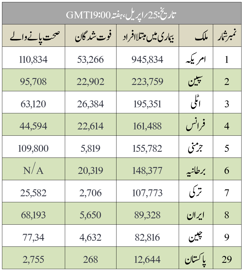 لوگوں کو Immunity Passportمت دیں ویتنام میں Covid-19سے کوئی ہلاکت نہیں ہوئی بھارت میں لاک ڈاؤن میں نرمی ضلع چنیوٹ میں کورونا وائرس ختم کورونا سے ڈیڑھ ارب طالب علم متأثر نیویارک میں لوگوں نے جراثیم کش پراڈکٹس پی لیں کشمیر کے گل لالہ بھی اداس ہیں دسمبر2019ء میں ظاہر ہونے والی یہ وباء اس وقت دنیا کے 210؍ممالک اور علاقوں میں پھیل چکی ہے۔ Worldometers.info کی طرف سے جاری کئے گئے اعداد و شمار کے مطابق تمام دنیا میں اب تک کے کنفرمڈ کیسز کی تعداد 2,896,964؍ہےاور اس وباء کے نتیجہ میں وفات پانے والے201,749؍اور 825,402؍افراد Covid-19 میں مبتلا ہو کر صحت یاب ہوچکے ہیں ذیل میں بعض ممالک کی ایک مختصر فہرست دی جا رہی ہے جو کہ اس وائرس سے زیادہ متاثر ہیں۔ (www.worldometers.info) (ویب سائٹ پر نظر آنے والایہ چارٹ اوپر دئے گئے وقت اور دن کے مطابق آپ کو تازہ ترین اعدادوشمار بتا رہا ہے۔) WHO عالمی ادارہ ٔصحت نے حکومتوں کو خبردار کیا ہے کہ وہ لاک ڈاؤن میں نرمی کرنے کے لئے نام نہاد IMMUNITY PASSPORTS یا RISK FREE CERTIFICATE جاری نہ کریں۔ ادارہ کا کہنا ہے کہ اس بارے میں ابھی کوئی شواہد نہیں ہیں کہ جو لوگ ایک بار اس وائرس سے متأثر ہو کر صحت یاب ہوگئے ہیں ان کو انفیکشن دوبارہ نہیں ہوگا۔ بلکہ خطرہ ہے کے اس طرح کرنے سے انفیکشن زیادہ پھیلے۔ (بی بی سی) https://twitter.com/BBCWorld/status/1254043646598488064?s=20 https://twitter.com/BBCWorld/status/1254043646598488064?s=20 UNESCO یونیسکو کی ایک عہدے دار نے بتایا ہے کہ لاک ڈاؤن کی وجہ سے دنیا بھر میں سکولوں، کالجوں اور یونیورسٹیوں کے ڈیڑھ ارب سے زائد طالب علم متأثر ہوئے ہیں۔ جن میں قریباً 74کروڑ لڑکیاں شامل ہیں۔ ان میں سے 11 کروڑ سے زائد لڑکیوں کا تعلق دنیا کے پس ماندہ ملکوں سے ہے، جہاں لڑکیوں کا سکول جانا ویسے ہی ایک بڑا مسئلہ ہے۔ (VOAاردو) یورپ برطانیہ برطانیہ میں Covid-19سے ہسپتالوں میں مزید 813؍مریض جاں بحق ہوئے ہیں اور کل تعداد 20,000سے تجاوز کر گئی ہے۔ اٹلی، سپین، فرانس اور امریکہ کے بعد برطانیہ پانچواں ملک ہے جس میں Covid-19 سے 20,000 سے زائد اموات ہوئی ہیں۔ ان میں سے 1,231؍اموات سکاٹ لینڈ میں اور 774؍اموات ویلز میں ریکارڈ کی گئی ہیں۔ (بی بی سی) https://twitter.com/DHSCgovuk/status/1254052435577970688?s=20 https://twitter.com/DHSCgovuk/status/1254052435577970688?s=20 ہوم سیکرٹری پریتی پٹیل نے بتایا ہے کہ، کاروں سے متعلق جرائم، چوری اور دکانوں سے اشیاء اٹھانے کے جرائم میں کمی ہوئی ہے۔ لیکن آن لائن فراڈ کے ذریعے لوگوں کو 2.4ملین پاؤنڈز کا نقصان ہوا ہے۔ اسی طرح جرائم پیشہ لوگ کورونا وائرس سے متعلق جعلی اشیاء بھی فروخت کررہے ہیں۔ (بی بی سی) برطانیہ کے سیکرٹری صحت Matt Hancock نے ایک تصویر شیئر کی ہے جس میں انہوں نے کورونا وائرس سے صحت یاب ہونے والوں کے خون سے اس مرض میں مبتلا مریضوں کا علاج کرنے کے لئے ایک تجربے میں حصہ لیا۔ وہ خود بھی اس مرض میں مبتلا رہے ہیں۔ اور اس کام کے لئے انہوں نے اپنا پلازمہ عطیہ کیا ہے۔ان کا کہنا ہے کہ یہ ایک اہم تجربہ ہے۔ (بی بی سی اردو) https://twitter.com/MattHancock/status/1254002002817884162?s=20 https://twitter.com/MattHancock/status/1254002002817884162?s=20 30؍اپریل سے 4؍مئی کے دوران برطانیہ پاکستان میں پھنسے ہوئے 5,000 سے زائد برطانوی شہریوں کو9 چارٹرڈ فلائٹس کے ذریعے واپس برطانیہ لے کر جائے گا۔ (ڈان) برطانیہ کی مسلم کونسل کے سیکرٹری ہارون خان کا کہنا ہے کہ ہو سکتا ہے کہ کورونا وائرس کی وباء کے بعد بعض مسجد مستقل طور پر بند ہو جائیں۔ ان کا کہنا تھا کہ بہت سی مساجد اپنے معمولات کے چلانے کے لئے نمازیوں کی طرف سے دئے گئے عطیات پر انحصار کرتی ہیں اور اس وباء اور لاک ڈاؤن کی وجہ سے یہ ذریعہ اچانک ختم ہوگیا ہے۔ (sky news) اٹلی اٹلی میں روزانہ ہونے والی اموات میں کمی دیکھنے میں آئی ہے اور گذشتہ روز 415؍افراد جاں بحق ہوئے ہیں۔ مجموعی تعداد 26,000سے زائد ہے۔ (بی بی سی) اٹلی کی ڈاکٹروں کی ایسوسی ایشن کے مطابق اٹلی میں Covid-19سے کم از کم 150؍ڈاکٹرز جاں بحق ہوئے ہیں۔ جبکہ کل مریضوں میں سے 10فیصد کا تعلق ہیلتھ کیئر کے کارکنا ن سے ہے۔ (سی این این) اٹلی میں چند فیکٹریوں میں سخت حفاظتی انتظامات کے ساتھ کام دوبارہ شروع ہوگیا ہے۔ عملے کے ہر رکن کے ل