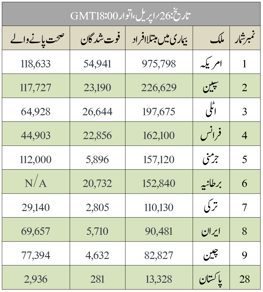 سپین میں 14سال سے کم عمر بچوں کو گھر سے باہر نکلنے کی اجازت اٹلی اور سپین میں ہلاکتوں کی تعداد میں کافی کمی ووہان میں کورونا وائرس کا کوئی بھی مریض ہسپتال میں زیر علاج نہیں امریکہ نے کورونا وائرس کی مزید 6علامات کا کیا اعلان پہاڑ پر پاکستان کے جھنڈے کی شبیہہ گھر جانے کی قیمت 28ٹن پیاز دسمبر2019ء میں ظاہر ہونے والی یہ وباء اس وقت دنیا کے 210 مما لک اور علاقوں میں پھیل چکی ہے۔ Worldometers.infoکی طرف سے جاری کئےگئے اعداد و شمار کے مطابق تمام دنیا میں اب تک کے کنفرمڈ کیسز کی تعداد 2,973,132؍ہےاور اس وباء کے نتیجہ میں وفات پانے والے206,008؍اور 873,878؍افراد Covid-19 میں مبتلا ہو کر صحت یاب ہوچکے ہیں ذیل میں بعض ممالک کی ایک مختصر فہرست دی جا رہی ہے جو کہ اس وائرس سے زیادہ متاثر ہیں۔ (www.worldometers.info) (ویب سائٹ پر نظر آنے والایہ چارٹ اوپر دئے گئے وقت اور دن کے مطابق آپ کو تازہ ترین اعدادوشمار بتا رہا ہے۔) John Hopkins University کے مطابق دنیا بھر میں Covid-19سے ہونے والی ہلاکتوں کی تعداد دو لاکھ سے تجاوز کرگئی ہے۔ (سی این این) https://twitter.com/Reuters/status/1254428724310806528?s=20 https://twitter.com/Reuters/status/1254428724310806528?s=20 ممالک جن میں کورونا وائرس تیزی سے پھیل رہا ہے گذشتہ کچھ ہفتوں سے یورپ اور امریکہ میں کورونا وائرس کی کافی شدت دیکھنے میں آئی۔ ان کے علاوہ کچھ اور ممالک بھی ہیں جہاں او وائرس کی کافی شدت ہے۔ Ecuador میں اس وقت Covid-19 کے 22,791 مصدقہ کیسز ہیں۔ اس وقت وہاں ہلاکتوں کی تعداد 900 سے کم ہے۔ انتظامیہ کا کہنا ہے کہ یہ تعداد ہزاروں میں ہو سکتی ہے۔ لوگوں کا کہنا ہے کہ ان کو ان کے وفات یافتگان کو دفنانے میں مشکلات پیش آرہی ہیں۔ برازیل میں Covid-19کے مصدقہ مریضوں کی تعداد 55,224 ہے اور 3,762 ہلاکتیں ہوچکی ہیں۔ یہ لاطینی امریکہ کا سب سے متأثرہ ملک ہے۔ ترکی میں پہلا کیس 11؍مارچ کو رجسٹر ہوا تھا اور اب یہاں 107,773 مصدقہ کیسز ہیں ۔ اور یہ دنیا میں اس وقت ساتویں نمبر پر ہے۔ یہاں 2,706 ہلاکتیں ہوئی ہیں۔ روس میں 28؍مارچ کو Covid-19 کے مریضوں کی تعداد قریباً 1,000 تھی جو اب 74,588ہوگئی ہے۔ اور یہاں 681 ہلاکتیں ہوئی ہیں۔ (بی بی سی) 16 دن میں ایک لاکھ اموات Covid-19 سے ہونے والی پہلی ہلاکت 11؍جنوری کو ووہان، چین میں ریکارڈ کی گئی۔ اس کے 90؍دن بعد ان اموات کی تعداد 100,000 ہوگئی۔ جبکہ اگلی 100,000؍اموات صرف 16دن میں ہوئیں۔ (بی بی سی) یورپ ایک جھوٹی خبر ۔ اور سچ کیا ہے؟ ڈیپارٹمنٹ آف ہیلتھ اینڈ سوشل کیئر نے ایک ٹویٹ کے ذریعہ بتایا ہے کہ سوشل میڈیا پر جو یہ خبر گردش کررہی ہے کہ برطانیہ میں ویکسین کے ٹرائل کا پہلا رضاکار جاں بحق ہوگیا ہے۔ یہ خبر سراسر غلط ہے۔ ادراے نے لوگوں کو نصیحت کی ہے کہ ایسی کوئی بھی خبر شیئر کرنے سے پہلے اس کی تصدیق کر لیا کریں۔ https://twitter.com/DHSCgovuk/status/1254406873928908802?s=20 https://twitter.com/DHSCgovuk/status/1254406873928908802?s=20 برطانیہ برطانیہ میں Covid-19سے ہسپتالوں میں مزید413؍اموات ہوئی ہیں۔ (بی بی سی) https://twitter.com/DHSCgovuk/status/1254439544507826179?s=20 https://twitter.com/DHSCgovuk/status/1254439544507826179?s=20 برطانوی وزیراعظم Boris Johnson سوموار سے اپنی ذمہ داریاں دوبارہ سنبھالیں گے۔ وہ Covid-19سے بیمار ہوئے تھے اور دو ہفتے پہلے، انتہائی نگہداشت میں رہنے کے بعد، ہسپتال سے فارغ ہوئے تھے۔ (بی بی سی) سپین سپین میں 6ہفتے تک گھروں میں بند رہنے کے بعد بالآخر لاک ڈاؤن میں نرمی کرتے ہوئے 14سال سے کم عمر بچوں کو گھر سے باہر نکلنے اور کھیلنے کی اجازت دے دی گئی ہے۔ (ڈان) https://twitter.com/AFPphoto/status/1254436322560872448?s=20 https://twitter.com/AFPphoto/status/1254436322560872448?s=20 سپین میں گزشتہ24گھنٹوں کے دوران 20؍مارچ کے بعد کسی بھی ایک روز میں سب سے کم 288؍اموات ہوئی ہیں۔ سپین میں ہلاکتوں کی کل تعداد23,190ہے۔ (بی بی سی) اٹلی اٹلی میں گذشتہ 24گھنٹے کے دوران 260؍افراد Covid-19سے جاں بحق ہوئے۔ یہ 14؍مارچ کے بعد کسی بھی ایک روز میں ہونے والی سب سے کم اموات ہیں۔ https://twitter.com/AFP/status/1254441239413436417?s=20 https://twitter.com/AFP/status/1254441239413436417?s=20 اٹلی کے وزیراعظم Giuseppe Conteکا کہنا ہے کہ اٹلی لاک ڈاؤن میں نرمی کرتے ہوئے4مئی سے سخت حفاظتی انتظامات کے ساتھ مینوفیکچرنگ کے شعبہ کو کھول رہا ہے ۔ جبکہ سکول ست