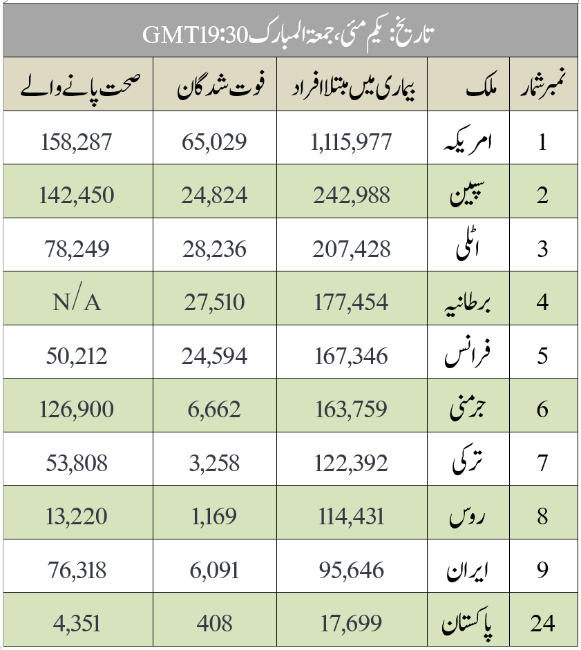 دنیا بھر میں دس لاکھ سے زائد لوگ صحت یاب یورپی ریاستوں میں لاک ڈاؤن میں نرمی بچوں کی ویکسین کی ترسیل میں تعطل برطانیہ میں اقلیتیں کورونا وائرس سے زیادہ متأثر روسی وزیراعظم کورونا سے متأثز پاکستان میں دس بلین درخت بھارت میں لاک ڈاؤن میں توسیع افریقہ کی صورتحال جرمنی میں ٹینس ٹورنامنٹ دسمبر2019ء میں ظاہر ہونے والی یہ وباء اس وقت دنیا کے 210 مما لک اور علاقوں میں پھیل چکی ہے۔ Worldometers.infoکی طرف سے جاری کئےگئے اعداد و شمار کے مطابق تمام دنیا میں اب تک کے کنفرمڈ کیسز کی تعداد 3,380,242؍ہےاور اس وباء کے نتیجہ میں وفات پانے والے238,477؍اور 1,072,887؍افراد Covid-19 میں مبتلا ہو کر صحت یاب ہوچکے ہیں ذیل میں بعض ممالک کی ایک مختصر فہرست دی جا رہی ہے جو کہ اس وائرس سے زیادہ متاثر ہیں۔ (www.worldometers.info) (ویب سائٹ پر نظر آنے والایہ چارٹ اوپر دئے گئے وقت اور دن کے مطابق آپ کو تازہ ترین اعدادوشمار بتا رہا ہے۔) UN اقوام متحدہ کا کہنا ہے کہ کورونا وائرس کی وجہ سے خراب ہونے والے حالات کی وجہ سے مختلف ویکسین کی ترسیل تعطل کا شکار ہے ۔ جس کی وجہ سے درجنوں ممالک میں لاکھوں بچوں کو بروقت یہ ویکسین مہیا نہ ہو سکے گی۔ (بی بی سی) https://twitter.com/BBCWorld/status/1256212580554747905?s=20 https://twitter.com/BBCWorld/status/1256212580554747905?s=20 WHO عالمی ادارۂ صحت کا کہنا ہے کہ وہ امید کرتے ہیں کہ چین ان کو نئے کورونا وائرس کے جانوروں سے پھیلنے کے بارے میں تحقیقات میں مدعو کرے گا۔ (الجزیرہ) https://twitter.com/AFP/status/1256207097374572544 https://twitter.com/AFP/status/1256207097374572544 John Hopkins Universityکے اعداد و شمار کے مطابق دنیا بھر میں Covid-19سے صحت یاب ہونے والوں کی تعداد دس لاکھ سے زائد ہوگئی ہے۔ (الجزیرہ) وہ ممالک جن میں سب سے زیادہ لوگ صحت یاب ہوئے ہیں بالترتیب یوں ہیں۔ امریکہ، جرمنی، سپین، جین اور اٹلی۔ (بی بی سی اردو) یورپ عالمی ادارۂ صحت کے ریجنل سربراہ نے بتایا ہے کہ کورونا وائرس کی وباء سے نمٹنے کے لئے یورپ کی 44ریاستوں نے کلی یاجزوی لاک ڈاؤن اور پابندیاں لگائی تھیں۔ اب ان میں سے11ریاستوں نے کسی حد تک ان میں نرمی کرنی شروع کی ہے۔ اور 11مزید ممالک آنے والے کچھ دنوں میں ان پابندیوں میں کچھ نرمی کرنے کا ارادہ رکھتے ہیں۔ (الجزیرہ) برطانیہ برطانوی وزیراعظم Boris Johnson نے پریس بریفنگ کے دوران کہا ہے کہ برطانیہ کورونا وائرس کی انتہاء سے گزر چکا ہے۔ان کا کہنا تھا کہ وہ اگلے ہفتے لاک ڈاؤن کو ختم کرنے کا لائحہ عمل تیار کر لیں گے۔ (ڈان) https://twitter.com/CGTNEurope/status/1255909688371220482?s=20 https://twitter.com/CGTNEurope/status/1255909688371220482?s=20 ایک نئی تحقیق سے معلوم ہوا ہے کہ انگلینڈ اور ویلز میں سیاہ فام افریقی نژاد برطانوی شہریوں میں کورونا وائرس سے ہلاک ہونے والوں کی شرح سفید فام برطانوی شہریوں سے تین گنا زیادہ ہے۔ اور یہ بیماری ان علاقوں میں زیادہ پھیلی ہے جہاں نسلی اقلیتوں کے لوگ زیادہ رہتے ہیں۔ (بی بی سی اردو) روس روس کے وزیراعظم Mikhail Mishustinکا کورونا وائرس کا ٹیسٹ مثبت آیا ہے اور انہوں نے اپنے آپ کو الگ تھلگ کرلیا ہے۔ فرسٹ ڈپٹی وزیراعظم Andrey Belousovقائم مقام وزیراعظم کی ذمہ داریاں سنبھالیں گے۔ (الجزیرہ) روس میں مسلسل تیسرے روز بھی Covid-19کے مریضوں میں ریکارڈ اضافہ ہوا ہے۔ گذشتہ 24گھنٹوں میں 7,933نئے کیسز رپورٹ ہوئے۔ روس میں کل کیسز کی تعداد 114,431ہوگئی ہے۔ (الجزیرہ) https://twitter.com/Reuters/status/1256203205802897408?s=20 https://twitter.com/Reuters/status/1256203205802897408?s=20 اٹلی اٹلی میں Covid-19سے روزانہ ہونے والی اموات اور نئے کیسز میں کمی ہوئی ہے۔ امریکہ امریکی صدر ڈونلڈ ٹرمپ نے کہا ہے کہ وہ اس بارے میں پراعتماد ہیں کہ کورونا وائرس ووہان کی وائرس لیبارٹری سے شروع ہوا ہے۔ ان کا کہنا تھا کہ انھوں نے اس بارے میں ثبوت دیکھے ہیں۔ (بی بی سی اردو) https://twitter.com/cspan/status/1255973093614522369?s=20 https://twitter.com/cspan/status/1255973093614522369?s=20 ایشیا پاکستان سپیکر قومی اسمبلی اسد قیصر کا کورونا وائرس کا ٹیسٹ مثبت آیا ہے اور انھوں نے اپنے آپ کو گھر پر قرنطینہ کرلیا ہے۔ (ڈان) https://twitter.com/AsadQaiserPTI/status/1255915045185294345?s=20 https://twitter.com/AsadQaiserPTI/status/1255915045185294345?s=20 پاکستان میں Covid-19سے صحت یاب ہونے والو