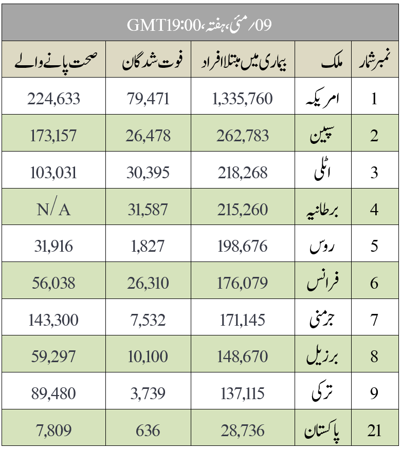 تیرہ لاکھ سے زائد مریض صحت یاب برطانیہ آنے والے مسافروں کو قرنطینہ کرنا ہوگا روس میں مریضوں کی بڑھتی ہوئی تعداد پاکستان میں لاک ڈاؤن میں نرمی اور نئے کیسز میں اضافہ امریکہ کی چین اور روس پر الزام تراشی کویت میں کرفیو ہانگ کانگ میں کورونا کے لئے تین دوائیوں سے کامیاب علاج ہیومینٹی فرسٹ سویڈن کے تحت حالیہ خدمات دسمبر2019ء میں ظاہر ہونے والی یہ وباء اس وقت دنیا کے 210 مما لک اور علاقوں میں پھیل چکی ہے۔ Worldometers.infoکی طرف سے جاری کئےگئے اعداد و شمار کے مطابق تمام دنیا میں اب تک کے کنفرمڈ کیسز کی تعداد 4,073,592؍ہےاور اس وباء کے نتیجہ میں وفات پانے والے278,911؍اور 1,417,305؍افراد Covid-19 میں مبتلا ہو کر صحت یاب ہوچکے ہیں ذیل میں بعض ممالک کی ایک مختصر فہرست دی جا رہی ہے جو کہ اس وائرس سے زیادہ متاثر ہیں۔ (www.worldometers.info) (ویب سائٹ پر نظر آنے والایہ چارٹ اوپر دئے گئے وقت اور دن کے مطابق آپ کو تازہ ترین اعدادوشمار بتا رہا ہے۔) دنیا بھر میں کورونا وائرس سے صحت یاب ہونے والوں کی تعداد 1,300,000سے تجاوز کر گئی ہے۔ (الجزیرہ) یورپ برطانیہ فضائی کمپنیوں کا کہنا ہے کہ ان کو برطانوی حکومت کی طرف سے کہا گیا ہے کہ آئرلینڈ کے علاوہ ممالک سے جو بھی مسافر یوکے آئے گا اسے 14 دن کے لئے قرنطینہ کیا جائے گا۔ (بی بی سی) اٹلی اٹلی میں جمعہ کے روز Covid-19سے ہونے والی 243؍اموات کے بعد مجموعی تعداد30,201ہوگئی ہے۔ (بی بی سی اردو) https://twitter.com/BBCBreaking/status/1258791081262698499?s=20 https://twitter.com/BBCBreaking/status/1258791081262698499?s=20 ائر فرانس کا کہنا ہے کہ وہ سوموار کے روز سے مسافروں کا ٹمپریچر چیک کرے گی اور تمام پروازوں کے دوران مسافروں کو ماسک پہننے ہوں گے۔ (بی بی سی) سپین سپین کے ایک قصبہ کے ساحل پر جانے کے لئے اب ایک ایپ کی مدد سے ایڈوانس بکنگ کروانی پڑے گی۔ موجودہ وبائی صورتحال کی وجہ سے اب اس علاقہ میں 10,000کی بجائے ایک دن میں صرف 5,000لوگوں کو ساحل پر آنے کی اجازت ملے گی۔ (سی این این) روس روس میں گذشتہ 24؍گھنٹوں میں کورونا وائرس کے 10,817 نئے کیسز رپورٹ ہوئے ہیں اور کل تعدادا 198,676ہوگئی ہے۔ (الجزیرہ) ایشیا پاکستان پاکستان میں جمعہ کے روز 24گھنٹوں میں کورونا وائرس کے ایک دن میں سب سے زیادہ 2,000 سے زائد نئے کیسز ریکارڈ کئے گئے۔ (ڈان) پاکستان میں آج سے لاک ڈاؤن میں نرمی کی جارہی ہے۔ پاکستان کے مصدقہ کیسز 28,000سے زائد ہیں۔623؍اموات ہوچکی ہیں۔ اور ساڑھے سات ہزار سے زائد مریض صحت یاب ہوچکے ہیں۔ (ڈان) 12مئی کو ہونے والے سینٹ کے سیشن سے پہلے تمام سینیٹرز کا Covid-19کا ٹیسٹ ہوگا۔ (ڈان) YouTubeکے سی ای او نے پاکستان کے وزیر اعظم کو ایک خط لکھا ہے اور کہا ہے کہ وہ کورونا وائرس کی وباء کے بارے میں آگاہی کے لئے پاکستان کو اشتہارات میں 5ملین ڈالرز کی گرانٹ سے مدد کرے گا۔ (ڈان) چین چینی صدرXi Jinpingنے شمالی کوریا کے صدر کو ایک پیغام کے ذریعے کورونا وائرس کے خلاف مدد کی پیشکش کی ہے۔ شمالی کوریا کا کہنا ہے کہ ان کے ملک میں کورونا وائرس کا کوئی کیس نہیں ہے۔ (بی بی سی) https://twitter.com/globaltimesnews/status/1259004073946214400?s=20 https://twitter.com/globaltimesnews/status/1259004073946214400?s=20 جنوبی کوریا جنوبی کوریا میں لاک ڈاؤن میں نرمی کرتے ہوئے کلب اور بار بھی کھول دئے گئے تھے۔ لیکن دارالحکومت Seolکے ایک نائٹ کلب جانے والے شخص سے منسلک 17نئے کیسز کے بعد شہر کے 2,100سے زائد نائٹ کلب اور بار وغیرہ بند کردئے گئے ہیں۔ (الجزیرہ) تائیوان تائیوان میں پروفیشنل بیس بال لیگ جمعہ کے روز سے تماشائیوں کے سامنے دوبارہ شروع کردی گئی ہے۔ (سی این این) https://twitter.com/AFP/status/1259057215408951296?s=20 https://twitter.com/AFP/status/1259057215408951296?s=20 جاپان لاک ڈاؤن ہے اور لوگ Aquariumنہیں آرہے۔ چلیں ہم خود ہی ایک دوسرے سے مل لیتے ہیں۔ جاپان کے ایک ایسے ہی Aquariumکی انتظامیہ نے جانوروں کی ایک دوسرے سے ملاقات کا سلسلہ شروع کیا ہوا ہے۔ https://twitter.com/AFP/status/1258893730020499463?s=20 https://twitter.com/AFP/status/1258893730020499463?s=20 امریکہ امریکہ کے ادارے CDCکے مطابق امریکہ میں کورونا وائرس سے ہلاک ہونے والوں کی تعداد 75,477ہوگئی ہے۔ (ڈان) امریکہ نے چین اور روس پر الزام لگایا ہے کہ وہ کورونا وائرس کے 