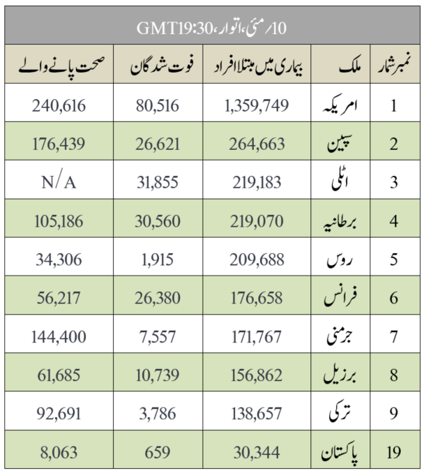 دسمبر2019ء میں ظاہر ہونے والی یہ وباء اس وقت دنیا کے 210 مما لک اور علاقوں میں پھیل چکی ہے۔ Worldometers.infoکی طرف سے جاری کئےگئے اعداد و شمار کے مطابق تمام دنیا میں اب تک کے کنفرمڈ کیسز کی تعداد 4,159,914؍ہےاور اس وباء کے نتیجہ میں وفات پانے والے 282,918؍اور 1,467,344؍افراد Covid-19 میں مبتلا ہو کر صحت یاب ہوچکے ہیں۔ ذیل میں بعض ممالک کی ایک مختصر فہرست دی جا رہی ہے جو کہ اس وائرس سے زیادہ متاثر ہیں۔ (www.worldometers.info) (ویب سائٹ پر نظر آنے والایہ چارٹ اوپر دئے گئے وقت اور دن کے مطابق آپ کو تازہ ترین اعدادوشمار بتا رہا ہے۔) دنیا بھر میں کورونا وائرس کے مریضوں کی تعداد 4,000,000سے تجاوز کر گئی ہے۔ دنیا کے اکثر شدید متأثر ممالک بھی لاک ڈاؤن میں مختلف قسم کی نرمیاں کررہے ہیں۔ https://twitter.com/AFP/status/1259371340743786498?s=20 https://twitter.com/AFP/status/1259371340743786498?s=20 یورپ یورپی کمیشن نے تمام رکن ممالک کو کورونا وائرس کے باعث عائد سفری پابندیوں کو برقرار رکھنے پر زور دیتے ہوئے کہا ہے کہ یونین کی حدود میں غیر ضروری سفر پر عائد پابندی برقرار رکھیں۔ اس کے علاوہ غیر رکن ممالک کے شہریوں پر سفری پابندیاں برقرار رکھتے ہوئے یونین کی سرحد بیرونی نقل وحرکت کے لئے 15؍جون تک بند رہنی چاہیے۔ (ڈان اردو) برطانیہ برطانیہ میں سائنسی شعبے سے متعلق مشیر نے خبردار کیا ہے کہ اگر لاک ڈاؤن میں جلد بازی میں نرمی کی گئی تو رواں برس کے آخر تک ملک میں اموات کی تعداد ایک لاکھ سے بڑھ سکتی ہے۔ (بی بی سی اردو) برطانوی حکومت نے یہ قبول کیا ہے کہ برطانیہ کی لیبارٹریز میں ہونے والے مسئلے کی وجہ سے انہوں نے گذشتہ ہفتے قریباً 50,000 نمونے چیک کروانے کے لئے امریکہ بھجوائے تھے۔ (بی بی سی) سپین وزارت صحت کے مطابق سپین میں گذشتہ 24گھنٹوں میں Covid-19سے 143؍افراد جاں بحق ہوئے ہیں۔ یہ قریبا گزشتہ دو ماہ میں ایک دن میں ہونے والی سب سے کم اموات ہیں۔ (بی بی سی) جرمنی جرمنی میں لاک ڈاؤن میں مختلف نرمیوں کے بعدRobert Koch Instituteکے مطابق ایک شخص سے دوسرے شخص کو انفیکشن کی منتقلی کی شرح 1.1فیصد ہوگئی ہے۔ (بی بی سی) روس روس میں گذشتہ 24گھنٹوں میں کورونا وائرس کے 11,012نئے کیسز رپورٹ ہوئے ہیں۔ روس میں کورونا وائرس کے کیسز کی مجموعی تعداد209,688 ہوگئی ہے۔ (ڈان) ماسکو کے ایک ہسپتال میں، جس میں کورونا وائرس کے مریضوں کا علاج ہورہا تھا، آگ لگنے سے ایک شخص کی ہلاکت ہوئی ہے۔ 200سے زائد مریضوں کو دوسری جگہ منتقل کیا گیا۔ بروقت کارروائی سے آگ پر جلد قابو پالیا گیا۔ (سی این این) ایشیا چین چین کے شہر ووہان میں 3؍اپریل کے بعد کورونا وائرس کا ایک کیس رپورٹ ہوا ہے۔ (ڈان) پاکستان پاکستان میں کورونا وائرس کے مصدقہ مریضوں کی تعداد 30,000سے تجاوز کرگئی ہے۔ John Hopkins Universityکے مطابق پاکستان ان پہلے 20ممالک میں شامل ہوگیا ہے جو کورونا وائرس سے بری طرح متأثر ہیں۔ (ڈان) ترکی ترکی میں کورونا وائرس کے مریضوں کے رابطوں کا پتہ لگانے کے لئے ٹریس کرنے والوں کی 6,000ٹیمیں 24گھنٹے کام میں مصروف ہیں۔ (ڈان) https://twitter.com/AFP/status/1259388956468285440?s=20 https://twitter.com/AFP/status/1259388956468285440?s=20 امریکہ Dr. Anthony Fauciاور وائٹ ہاؤس کی کورونا وائرس ٹاسک فورس کے دو ممبران نے اپنے آپ کو قرنطینہ کیا ہے۔ وہ ایک ایسے شخص کے ساتھ رابطے میں آئے تھے جس کا کورونا وائرس کا ٹیسٹ مثبت آیا تھا۔Dr. Fauciکا ٹیسٹ منفی آیا ہے۔ (بی بی سی) امریکہ کے بیماریوں کے روک تھام کے ادارے کے ڈائریکٹر Robert Redfieldاوردوائیوں اور خوراک کے ادارے کے کمشنر Stephen Hahnدونوں نے اپنے آپ کو دو ہفتے کے لئے قرنطینہ کیا ہے۔ یہ دونوں ایسے اشخاص کے ساتھ رابطے میں آئے تھے جن کا ٹیسٹ مثبت آیا تھا۔ (الجزیرہ) امریکہ کے قریباً 7,500کیئر ہومز میں کورونا وائرس سے 143,000لوگ متأثر ہوئے ہیں۔ ان کیئر ہومز میں کم از کم 25,600؍افراد اس وائرس سے جاں بحق ہوئے ہیں۔ (الجزیرہ) برازیل وزارت صحت کے مطابق برازیل میں کورونا وائرس سے ہونے والی اموات کی تعداد دس ہزار سے تجاوز کرکے 10,627ہوگئی ہے۔ (الجزیرہ) میکسیکو ہفتے کے روز میکسیکو میں کورونا وائرس کے 1,938نئے کیسز سامنے آئے اور 193ہلاکتیں ہوئیں۔ خبر رساں ادارےReuters