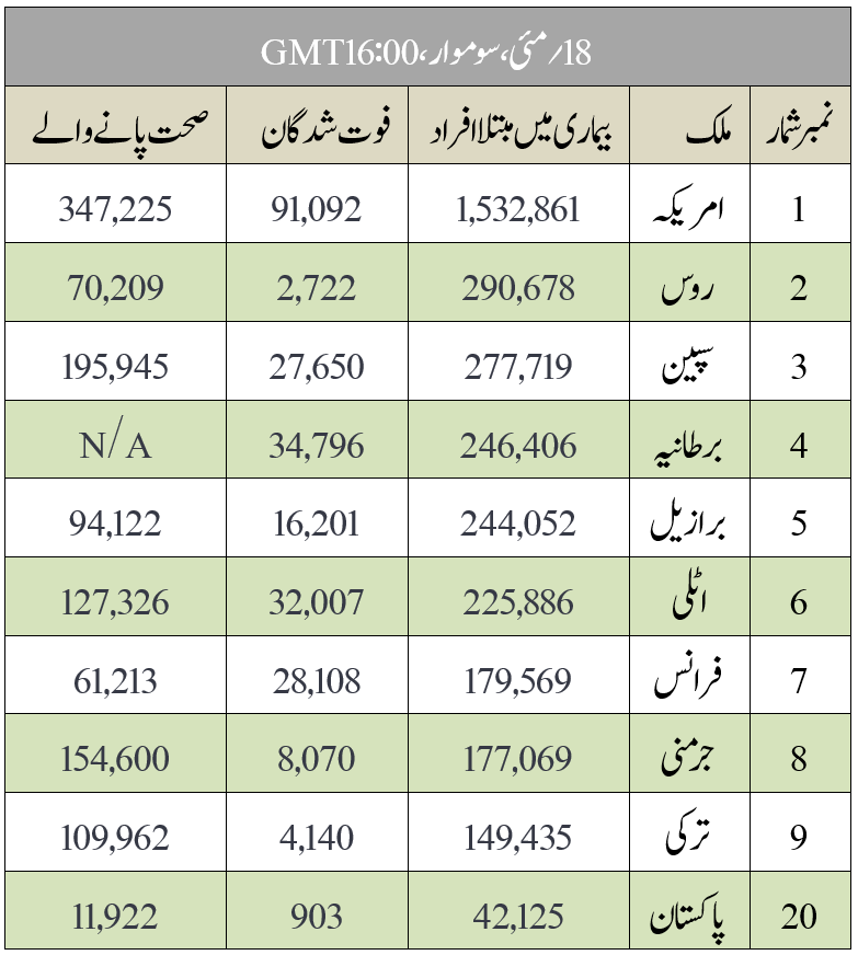چین عالمی ادارۂ صحت کو دو بلین ڈالرز دے گا فرانس میں سات سکول بند جرمنی میں مہاجر کیمپ میں کورونا روس میں نئے انفیکشنز میں کمی 100ملکوں کی طرف سے پیش کی گئی قرارداد مصر میں عید پر ٹرانسپورٹ بند رہے گی پاکستانی بچی کا اعزاز برازیل کا شہر مشکلات کا شکار فٹ بال اور کار ریسنگ شروع دسمبر2019ء میں ظاہر ہونے والی یہ وباء اس وقت دنیا کے 210 مما لک اور علاقوں میں پھیل چکی ہے۔ Worldometers.infoکی طرف سے جاری کئےگئے اعداد و شمار کے مطابق تمام دنیا میں اب تک کے کنفرمڈ کیسز کی تعداد 4,840,754؍ہےاور اس وباء کے نتیجہ میں وفات پانے والے317,363؍اور 1,875,031؍افراد Covid-19 میں مبتلا ہو کر صحت یاب ہوچکے ہیں ذیل میں بعض ممالک کی ایک مختصر فہرست دی جا رہی ہے جو کہ اس وائرس سے زیادہ متاثر ہیں۔ (www.worldometers.info) (ویب سائٹ پر نظر آنے والایہ چارٹ اوپر دئے گئے وقت اور دن کے مطابق آپ کو تازہ ترین اعدادوشمار بتا رہا ہے۔) WHO عالمی ادارۂ صحت کے سربراہ Antonio Guterres کا کہنا ہے کہ دنیا کے بعض ممالک کی طرف سے عالمی ادارۂ صحت کی ہدایات پر عمل نہ کرنے کی وجہ سے دنیا کو بہت بڑی قیمت چکانی پڑ رہی ہے۔ (ڈان) https://twitter.com/AFP/status/1262334296817307648?s=20 https://twitter.com/AFP/status/1262334296817307648?s=20 دنیا کے 100سے زیادہ ممالک نے ایک قرار داد تیار کی ہے جس میں کورونا وائرس کی وباء کے بارے میں آزادانہ تحقیقات کا مطالبہ کیا گیا ہے۔ یہ قرارداد عالمی ادارۂ صحت کی میٹنگ میں پیش کی جائے گی۔ (سی این این) یورپ برطانیہ صحت اور سوشل کیئر کے ادارے کے مطابق برطانیہ نے بھی سونگھنے کی حس کے ختم ہونے کو کورونا وائرس کی علامات میں شامل کردیا ہے۔ (سی این این) فرانس فرانس کے ایک شہر میں ایک بچے میں کورونا وائرس کی تشخیص ہونے کے بعد علاقے کے سات سکول بند کردئے گئے ہیں۔ (بی بی سی اردو) فرانس کا دیو قامت ہاتھی بھی لاک ڈاؤن سے باہر آگیا ہے اور لوگوں کو تفریح مہیا کررہا ہے ہے۔ دیکھئے اس وڈیو میں۔ https://twitter.com/Reuters/status/1262347199163314180?s=20 https://twitter.com/Reuters/status/1262347199163314180?s=20 جرمنی جرمنی کے ایک مہاجر کیمپ میں 130لوگوں میں کورونا وائرس کی تصدیق ہوئی ہے۔ (الجزیرہ) روس روس میں مسلسل تیسرے روز بھی نئے انفیکشنز کی تعداد10,000سے کم رہی۔ اس سے قبل مسلسل کئی روز تک یہ تعداد 10,000سے زیادہ تھی۔ روس اس وقت دنیا کا دوسرا بڑا متأثرہ ملک ہے۔ (ڈان) ایشیا چین چین کے صدر Xi Jinpingنے عالمی ادارۂ صحت کی میٹنگ سے خطاب کرتے ہوئے کہا ہے کہ چین نے اس بارے میں مکمل شفافیت سے کام لیا ہے اور اگلے دو سالوں میں عالمی ادارۂ صحت کے لئے دو بلین امریکی ڈالرز کی مدد کا وعدہ کیا ہے۔ (سی این این) پاکستان پاکستان کی سپریم کورٹ نے حکومت کو ہدایت کی ہے کہ وہ ہفتہ اور اتوار کے روز کاروباروں پر لگائی گئی پابندی کو ختم کردے۔ (الجزیرہ) بھارت بھارت میں ملک گیر لاک ڈاؤن کی مدت میں 31مئی تک کی توسیع کردی گئی ہے۔ (ڈان) بھارت میں کورونا وائرس کے مریضوں میں ایک دن میں 5,000سے زائد کا اضافہ ہوا ہے اور کل ہلاکتیں 3,000سے تجاوز کرگئی ہیں۔ (سی این این) امریکہ امریکی صدر ڈونلڈ ٹرمب نے دس سالہ پاکستانی امریکی بچی لیلیٰ خان کو کورونا وائرس کے ہیرو کے طور پر اعزاز سے نوازا ہے۔ لیلیٰ خان نے طبی کارکنان اور فائر فائٹرز کے لئے cookiesکے 100باکس عطیہ کئے تھے۔ (ڈان) https://twitter.com/Dawn_News/status/1262304112399564801?s=20 https://twitter.com/Dawn_News/status/1262304112399564801?s=20 نیویارک کے میئر نے ایک پریس کانفرنس کے دوران ہی کورونا وائرس کے ٹیسٹ کے لئے اپنا نمونہ جمع کروایا۔ (بی بی سی اردو) https://twitter.com/NYGovCuomo/status/1262068895084498944?s=20 https://twitter.com/NYGovCuomo/status/1262068895084498944?s=20 Apple اس ہفتے سے امریکہ میں اپنے 25سٹور کھول رہا ہے۔ https://twitter.com/Reuters/status/1262344683088470018?s=20 https://twitter.com/Reuters/status/1262344683088470018?s=20 برازیل Sa Pauloکے میئر کا کہنا ہے کہ کورونا وائرس کی وجہ سے ان کے شہر کا طبی نظام شدید مشکلات کا شکار ہے۔ (بی بی سی) https://twitter.com/bbcworldservice/status/1262375168757968896?s=20 https://twitter.com/bbcworldservice/status/1262375168757968896?s=20 کویت قطر کے بعد کویت نے بھی عوامی مقامات پر فیس ماسک پہننے کی ہدایت کی خلاف ورزی کرنے پر تین ماہ تک قید اور16,200 ڈالرز تک جرمانے 