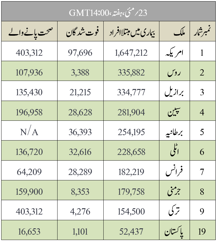 لاطینی امریکہ وباء کا نیا مرکز بھارت اور برازیل میں کیسز میں تشویش ناک اضافہ بعض ممالک میں مذہبی اجتماعات کی اجازت چین میں کوئی نیا کیس نہیں سو سالہ کارکمپنی Hertz دیوالیہ بعض ممالک میں آج عید الفطر منائی گئی میکسیکو کی فٹ بال لیگ منسوخ فیس بک گھر سے کام کرنے کی اجازت دے گی Worldometers.infoکی طرف سے جاری کئےگئے اعداد و شمار کے مطابق تمام دنیا میں اب تک کے کنفرمڈ کیسز کی تعداد 5,339,096؍ہےاور اس وباء کے نتیجہ میں وفات پانے والے340,696؍اور 2,178,850؍افراد Covid-19 میں مبتلا ہو کر صحت یاب ہوچکے ہیں ۔ ذیل میں بعض ممالک کی ایک مختصر فہرست دی جا رہی ہے جو کہ اس وائرس سے زیادہ متاثر ہیں۔ https://www.worldometers.info/coronavirus/ (ویب سائٹ پر نظر آنے والایہ چارٹ اوپر دئے گئے وقت اور دن کے مطابق آپ کو تازہ ترین اعدادوشمار بتا رہا ہے۔) WHO عالمی ادارۂ صحت کا کہنا ہے کہ کورونا وائرس کی وباء سے موذی امراض سے بچاؤ کی ویکسین بچوں تک پہنچانے اور لگانے میں تعطل ہوا ہے جس کی وجہ سے قریباً 80ملین بچوں کو ان بیماریوں کے لگنے کا خطرہ ہے۔ (الجزیرہ) عالمی ادارۂ صحت نے لاطینی امریکہ کو کورونا وائرس کا نیا مرکز قرار دیا ہے۔ (ڈان اردو) https://twitter.com/AFP/status/1264098291509149696?s=20 https://twitter.com/AFP/status/1264098291509149696?s=20 یورپ برطانیہ برطانوی وزیراعظم کو اس بات پر شدید تنقید کا سامنا ہے کہ ان کے ایک معاون Dominic Cummings نے لاک ڈاؤن کی خلاف ورزی کی اور کورونا وائرس کی علامات کے ساتھ 260میل کا سفر کیا۔ حکومت کا کہنا ہے کہ ان کے اس سفر سے کوئی خلاف ورزی نہیں ہوئی۔ (سی این این) برطانیہ میں سکول 20؍مارچ سے بند ہیں۔ اب برطانوی حکومت کا ارادہ ہے کہ یکم جون سے سکولوں کو تدریجاً کھول دیا جائے۔ گورنمنٹ کی اس تجویز کو اساتذہ کی یونین کی طرف سے سخت مخالفت کا سامنا ہے۔ ان کا کہنا ہے کہ یہ ہر کسی کے لئے خطرات کا باعث ہوسکتا ہے اور اس سے انفیکشن کے پھیلنے میں اضافہ ہوگا۔ (ڈان) جرمنی جرمنی کے صدر فرانک والٹر نے ماہ رمضان کے دوران ملک میں لاک ڈاؤن کے اقدامات پر عمل پیرا ہونے پر مسلمانوں کی تعریف کی ہے انھوں نے مسلمانوں کی مذہبی اقلیت کے خلاف نفرت کی مہم ختم کرنے کا بھی مطالبہ کیا ہے۔ (DW اردو) فرانس فرانس میں بھی دو ماہ کے بعد ہفتے کے روز سے مذہبی اجتماعات کی اجازت دے دی گئی ہے۔ (بی بی سی) ایشیا چین چین میں جب سے کورونا وائرس کی وباء شروع ہوئی ہے گورنمنٹ ہیلتھ کمیشن نے بتایا ہے کہ گزشتہ 24گھنٹوں میں کورونا وائرس کا کوئی نیا کیس رپورٹ نہیں ہوا۔ (ڈان) بھارت بھارت میں ایک دن میں کورونا وائرس کے ریکارڈ 6,654نئے کیسز ریکارڈ ہوئے ہیں۔ (بی بی سی اردو) https://twitter.com/khaleejtimes/status/1264062742622810113?s=20 https://twitter.com/khaleejtimes/status/1264062742622810113?s=20 ایران ایران میں عجائب گھروں اور تاریخی مقامات کو اتوار کے روز سے کھولا جا رہا ہے۔ ایران میں عید الفطر بھی اتوار کو منائی جارہی ہے۔ (ڈان) امریکہ امریکی صدر ڈونلڈ ٹرمپ کا کہنا ہے کہ مساجد اور چرچ ضروریات میں شمار ہوتے ہیں اس لئے ان کو جلد از جلد کھول دیا جائے۔ (بی بی سی) https://twitter.com/BBCWorld/status/1263969915796627456?s=20 https://twitter.com/BBCWorld/status/1263969915796627456?s=20 امریکہ کے ایک حجام نے کورونا وائرس سے متأثر ہوتے ہوئے اس ماہ میں آٹھ دن کام کیا اور اس کی وجہ سے اب91مزید لوگوں کو کورونا وائرس ہونے کا خدشہ ہے۔ (سی این این) برازیل برازیل میں کورونا وائرس کے کیسز کی تعداد330,890ہوگئی ہے اور اب یہ دنیا کا دوسرا بڑا متأثرہ ملک بن گیا ہے۔ (ڈان) پیرو پیرو میں ملک گیر لاک ڈاؤن کو جون کے آخر تک بڑھا دیا گیا ہے۔ پیرو میں لاک ڈاؤن میں پانچویں بار اضافہ کیا گیا ہے۔ (الجزیرہ) افریقہ مشرقی اور مغربی افریقہ کے بعض ممالک میں عیدالفطر آج منائی جارہی ہے۔ ان ممالک میں صومالیہ، نائیجر، سینیگال، مالی، گیمبیا وغیرہ شامل ہیں۔ (africanews) https://twitter.com/MayaMoha2/status/1264086180443938816?s=20 https://twitter.com/MayaMoha2/status/1264086180443938816?s=20 کینین صدر کا کہنا ہے کہ موجودہ طبی استعداد کو بڑھانے کے لئے مزید 5,000طبی کارکنان بھرتی کئے جائیں گے۔ (africanews) گھانا میں کورونا وائرس کے مریضوں کی تعداد ساڑھے چھ ہزار سے تجاوز کرگئی ہے ا