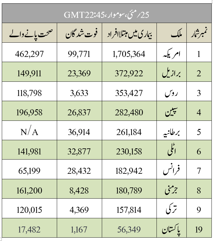 یورپ میں پابندیوں میں نرمیاں جاری جرمنی میں مریضوں میں کمی بھارت میں پروازیں شروع جاپان میں ایمرجنسی ختم ہنگری نے وباؤں کے لئے کئی بلین ڈالرز مختص کئے سیرالیون میں ایک دن میں سو سے زائد مریض امریکہ کی برازیل پر پابندی ماریشس میں 28دن بعد دو نئے کیس سپین میں سیاحت کے لئے بکنگ کروا لیں دو باسکٹ بال لیگ منسوخ Worldometers.infoکی طرف سے جاری کئےگئے اعداد و شمار کے مطابق تمام دنیا میں اب تک کے کنفرمڈ کیسز کی تعداد 5,578,750؍ہےاور اس وباء کے نتیجہ میں وفات پانے والے347,404؍اور 2,356,542؍افراد Covid-19 میں مبتلا ہو کر صحت یاب ہوچکے ہیں ۔ ذیل میں بعض ممالک کی ایک مختصر فہرست دی جا رہی ہے جو کہ اس وائرس سے زیادہ متاثر ہیں۔ (www.worldometers.info) (ویب سائٹ پر نظر آنے والایہ چارٹ اوپر دئے گئے وقت اور دن کے مطابق آپ کو تازہ ترین اعدادوشمار بتا رہا ہے۔) یورپ اٹلی میں اکثر جگہوں پر جم اور سوئمنگ پول کھول دئے گئے ہیں۔ میڈرڈ اور بارسلونا میں لاک ڈاؤن میں نرمی کی گئی ہے۔ سپین کے بعض علاقوں میں ساحل بھی کھولے کئے ہیں۔ یونان میں تمام جزیروں کے لئے فیری سروس بحال کردی گئی ہے۔ یوکرین کے دارالحکومت میں میٹرو سروس بحال کردی گئی ہے۔ ( بی بی سی) کورونا وائرس کی وجہ سے یورپ کے باسکٹ بال لیگ کے دو بڑے مقابلے EuroLeague اور EuroCup بغیر کسی کو فاتح قرار دئے منسوخ کردئے گئے ہیں۔ ان لیگوں کا نیا سیزن ستمبر اور اکتوبر میں شروع ہوگا۔ (الجزیرہ) برطانیہ برطانیہ نے اعلیٰ درجہ کے کھلاڑیوں کے لئے نئی ہدایات شائع کی ہیں۔ فٹ بال پریمیئر لیگ کے کھلاڑی19مئی سے non training ٹریننگ کررہے ہیں۔ بدھ کے روز میٹنگ میں آئندہ لائحہ عمل مرتب کیا جائے گا۔ (بی بی سی) ہالینڈ وزارت زراعت کے مطابق ہالینڈ میں آبی نیولوں(Minks) کے ذریعے انسانوں میں کورونا وائرس کی منتقلی کا دوسرا کیس سامنے آیا ہے۔(الجزیرہ) سپین سپین کی وزارت صحت کا کہنا ہے کہ غیر ملکی سیاح سپین میں جولائی سے اپنے لئے بکنگ کروا سکتے ہیں۔ یہ خیال ظاہر کیا جارہا ہے کہ دو ہفتے کی لازمی قرنطینہ کی شرط کو ختم کردیا جائے گا۔ (الجزیرہ) ہنگری ہنگری کے وزیرمال کا کہنا ہے کہ ہنگری کے اگلے سال کے بجٹ میں قریباً 9.34 بلین ڈالرز کی رقم وباؤں کی روک تھام کے لئے مختص کئے جائیں گے۔ (الجزیرہ) جرمنی Robert Koch Instituteکے مطابق جرمنی میں کورونا وائرس کے ایکٹو کیسز کی تعداد10,000سے کم ہوگئی ہے۔ (سی این این) آسٹریا آسٹریا کے صدر Alexander Van Der Bellen نے ملک میں کورونا وائرس کی وجہ سے لگائے گئے کرفیو پر معذرت کی ہے۔ وہ ایک ریستوران میں ہفتے کی رات 11بجے کے بعد تک رکے رہے تھے۔ (سی این این) ایشیا بنگلہ دیش میں کورونا وائرس سے روزانہ ہونے والی اموات میں ریکارڈ28کا اضافہ ہوا ہے۔ سری لنکا میں منگل سے پابندیوں میں نرمی کی جارہی ہے۔ نیپال میں کورونا وائرس کے مریضوں کی تعداد600ہوگئی ہے۔ (بی بی سی) جاپان جاپان میں کورونا وائرس کی وجہ سے لگائی گئی ملک گیر ایمرجنسی کو اٹھا لیا گیا ہے۔ جاپان دنیا کی تیسری بڑی معیشت ہے۔ (الجزیرہ) بھارت بھارت میں کورونا وائرس کے کیسز میں مسلسل اضافہ ہو رہا ہے اور بھارت اب ان دس ممالک میں شامل ہوگیا ہے جن میں کورونا وائرس کے کیسز سب سے زیادہ ہیں۔ آج سے بھارت میں بین الملکی پروازیں دوبارہ شروع ہورہی ہیں۔ کل یہاں ریکارڈ 6,767نئے کیسز رجسٹر ہوئے۔ (الجزیرہ) فلپائن فلپائن کے صدر Rodrigo Duterteنے اپنی حکومت کو ایک ہفتے کا وقت دیا ہے کہ وہ ان24,000 فلپائنی باشندوں کو ملک واپس لانے کا انتظام کرے جو دوسرے ممالک میں کروز شپس پر یا قرنطینہ میں پھنسے ہوئے ہیں۔ ان لوگوں کے ذریعہ فلپائن کو سالانہ 30بلین ڈالرز کی رقم موصول ہوتی ہے۔ (الجزیرہ) امریکہ امریکی صدر ڈونلڈ ٹرمپ کا کہنا ہے کہ ملک میں کورونا وائرس کے کیسز، تعداد اور اموات میں کمی ہو رہی ہے۔ (بی بی سی) https://twitter.com/realDonaldTrump/status/1264564734860427265 https://twitter.com/realDonaldTrump/status/1264564734860427265 وائٹ ہاؤس کے معاشی مشیرKevin Hassett کا کہنا ہے کہ مئی کے مہینے میں بے روزگاری 20فیصد تک ہوسکتی ہے اور اس کے بعد کم ہونا شروع ہوگی۔ (سی این این) امریکہ نے برازیل سے آنے والے مسافروں 