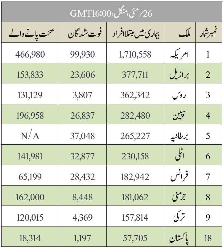 برطانیہ میں اموات میں کمی سپین میں دس روزہ سوگ پاکستان میں پھر لاک ڈاؤن ہوسکتا ہے ووہان میں چھ ملین سے زائد ٹیسٹ قرنطینہ توڑے پر چار ماہ کی سزا آسٹریلیا میں ویکسین کے تجربات افریقہ اور مشرق وسطیٰ کی صورتحال ایک اور فضائی کمپنی دیوالیہ Worldometers.infoکی طرف سے جاری کئےگئے اعداد و شمار کے مطابق تمام دنیا میں اب تک کے کنفرمڈ کیسز کی تعداد 5,632,873؍ہےاور اس وباء کے نتیجہ میں وفات پانے والے349,052؍اور 2,399,258؍افراد Covid-19 میں مبتلا ہو کر صحت یاب ہوچکے ہیں ۔ ذیل میں بعض ممالک کی ایک مختصر فہرست دی جا رہی ہے جو کہ اس وائرس سے زیادہ متاثر ہیں۔ (www.worldometers.info) (ویب سائٹ پر نظر آنے والایہ چارٹ اوپر دئے گئے وقت اور دن کے مطابق آپ کو تازہ ترین اعدادوشمار بتا رہا ہے۔) WHO عالمی ادارۂ صحت کا کہنا ہے کہ وہ حفاظتی نقطہ نگاہ سےHydroxychloroquinکے تجربات وقتی طور پر روک رہا ہے۔ (ڈان) https://twitter.com/AFP/status/1265180870937153537 https://twitter.com/AFP/status/1265180870937153537 یورپ یورپی کمیشن کی صدرUrsula von der Leyen نے بتایا ہے کہ کورونا وائرس کی ویکسین اور علاج کے لئے عطیات کی عالمی اپیل میں امداد کے وعدے 9.5 بلین یورو کے ٹارگٹ سے بڑھ گئے ہیں۔ (بی بی سی) برطانیہ برطانیہ میں اس ہفتے کورونا وائرس سے ہونے والی اموات چھ ہفتے کی کم ترین سطح پر آگئی ہیں۔ (ڈان) https://twitter.com/BBCNews/status/1265263897252167687?s=20 https://twitter.com/BBCNews/status/1265263897252167687?s=20 برطانیہ کے کورونا وائرس کے ٹریکنگ پراجیکٹ میں کام کرنے والے ایک سائنسدان کا کہنا ہے کہ مارچ کے مہینے میں CheltenhamاورLiverpoolمیں ہونے والے کھیلوں کے دو ایونٹس کی وجہ سے اموات میں اضافہ ہوا ہے۔ (بی بی سی) سپین سپین میں کورونا وائرس سے ہلاک ہونے والوں کے سوگ میں ملک بھر میں بدھ سے سرکاری طور پر دس روزہ سوگ کا اعلان کیا گیا ہے۔ (الجزیرہ) سپین نے اپنے ملک میں کورونا وائرس سے ہونے والی اموات پر نظر ثانی کرتے ہوئے 2,000کے قریب کمی کی ہے۔ انتظامیہ کا کہنا ہے کہ بعض اموات دو بار ریکارڈ ہوئی تھیں اور دیگر وجوہات بھی اس کمی کرنے کی وجہ ہیں۔(ڈان) میڈرڈ میں فزیوتھیراپسٹ جلد صحت یابی کے لئے کورونا وائرس کے مریضوں کی مدد کررہے ہیں۔ https://twitter.com/AFPphoto/status/1265160740052353025?s=20 https://twitter.com/AFPphoto/status/1265160740052353025?s=20 شمالی آئرلینڈ میں گذشتہ روز کورونا وائرس سے کوئی ہلاکت نہیں ہوئی۔ (بی بی سی) سویڈن میں کورونا وائرس سے ہونے والی اموات 4,000سے زائد ہوگئی ہیں۔ (ڈان) کوپن ہیگن کا چڑیا گھر ایک ماہ بند رہنے کے بعد لوگوں کے لئے کھول دیا گیا ہے۔ چڑیا گھر کی 151سالہ تاریخ میں یہ پہلا موقع تھا کہ اسے لوگوں کے لئے بند کیا گیا تھا۔ (ڈان) https://twitter.com/AFP/status/1265217361453424641?s=20 https://twitter.com/AFP/status/1265217361453424641?s=20 ڈچ وزیراعظم Mark Rutteکورونا وائرس کی وجہ سے لگائی گئی پابندیوں کے احترام میں کئی ہفتے تک اپنی والدہ سے ملنے نہیں گئے۔ البتہ جب 13مارچ کو ان کی والدہ کا انتقال ہوا تو اس وقت وہ ان کے ساتھ تھے۔ (سی این این) ایشیا بھارت UBERنے اپنے عملہ میں عالمی طور پر کمی کرتے ہوئے بھارت میں قریباً 600ملازمین کو فارغ کردیا ہے۔ کمپنی کا کہنا ہے کہ وہ کورونا وائرس کی وجہ سے معیشت پر ہونے والے اثرات کی وجہ سے اپنے منافع کو برقرار رکھنے کے لئے عالمی طور پراپنے عملہ میں 23فیصد کی کمی کرے گی۔ (ڈان) پاکستان پاکستان کے صحت کے ایک اعلیٰ عہدے دار ڈاکٹر ظفر مرزا کا کہنا ہے کہ اگر لوگوں نے ہدایات پر عمل نہ کیا اور کیسز میں اضافہ ہوتا رہا تو ایک سخت لاک ڈاؤن کیا جاسکتا ہے۔(بی بی سی) پاکستان کی National Disaster Management Authorityکا کہنا ہے کہ پاکستان میں وینٹی لیٹر کی کمی نہیں ہے اور انتہائی نگہداشت کے صفر 20فیصد بستر استعمال ہورہے ہیں۔ (ڈان) فلپائن فلپائن کے صدر Rodrigo Duterte کا کہنا ہے کہ وہ طلباء کے سکول واپس جانے کی اجارت نہیں دیں گے جب تک کورونا وائرس کی کوئی ویکسین میسر نہیں آجاتی۔ (ڈان) چین چین نے ہزاروں کی تعداد میں طبی اور دیگر عملہ استعمال کرتے ہوئے ووہان میں دو ہفتے میں 6.5ملین لوگوں کے کورونا وائرس کے ٹیسٹ کئے ہیں۔ اس کام میں کئی سو ملین ڈالر خرچ ہوئے ہیں۔ (ڈان) https://twitter.com/nytimes/status/1265256401703768067?s=20 h
