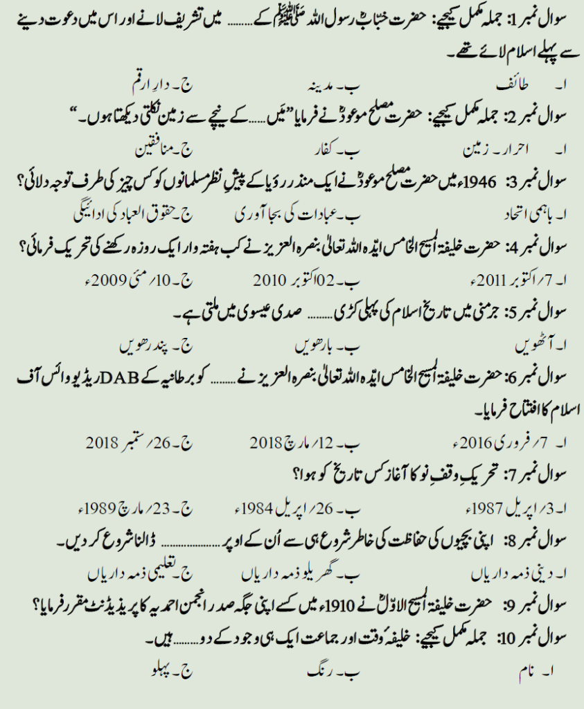 ان سوالات کے جوابات بذریعہ ای میل jawab@alfazl.com یا بذریعہ فیکس 0044-2085447611پر اپنے نام اور پتے کے ساتھ 05؍ جون تک ارسال کیجیے۔ (درست جوابات بتانے والے چند افراد کے اسماء الفضل انٹرنیشنل کے شمارہ 09؍جون 2020ء میں شائع کیے جائیں گے۔ان شاء اللہ) نوٹ: یہ سوالات الفضل انٹرنیشنل کے شمارہ 22؍مئی تا 04؍ جون 2020ء سے اخذ کیے گئے ہیں اب آپ کوئز الفضل انٹرنیشنل آن لائن بھی حل کر سکتے ہیں۔ اس کے لیے ویب سائٹ alfazl.com کے صفحہ اول پر موجود ’کوئز‘ کا بٹن دباکر جوابات سے دفتر الفضل انٹرنیشنل کو مطلع فرمایئے ……………………………………………………………………………… جوابات کوئز الفضل انٹرنیشنل نمبر17، 12؍مئی 2020ء 1۔تقویٰ 2۔ ذکرِ الٰہی 3۔ تفسیرِ صغیر 4۔ استغفار 5۔ خدا +نفس درج ذیل افراد کی جانب سے بروقت درست جوابات موصول ہوئے: امۃ القیوم انجم (کیلگری۔کینیڈا)، حنا طارق(ملہائم روئر۔جرمنی)، لبنیٰ ثاقب مسعود(بادفلبل۔جرمنی)، نعیم احمد عزیز(جماعت لمبرگ۔ جرمنی)،منورہ احمد(فورسھائم،جرمنی)، عابدہ اسلم منصور، اسلم منصور(ایڈیلیڈ۔ساؤتھ آسٹریلیا )، نجم السحر(برمنگھم۔ برطانیہ)، نادیہ خالق(پاکستان)، مبارکہ خالق(بیلجیم )، شاہدہ نسرین ناصر (ناروے)، ھبۃ المنعم(کیلگری کینیڈا)، امتہ السمیع (ٹورانٹو۔ کینیڈا)، روحی اعجاز(مونٹریال ۔کینیڈا)، منصورہ بھٹی (فرانکفرٹ ۔جرمنی)، باسط شیخ (نیوایزن برگ۔ جرمنی)، شیخ نعیم اللہ (نیوایزن برگ۔ جرمنی) ٭…٭…٭
