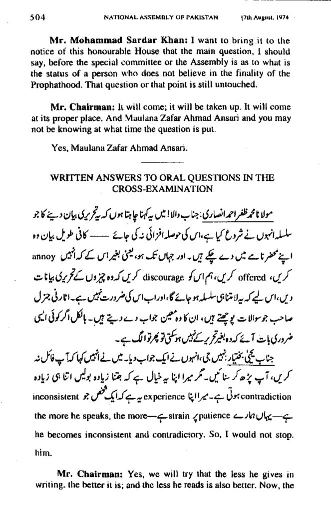 مورخہ 18؍ مئی 2020ء کو اے آر وائی نیوز چینل (ARY News) پر ’دی رپورٹر‘ نام کا پروگرام نشر ہوا۔ اس میں حسب سابق مکرم صابر شاکر صاحب بطور میزبان اور چودھری غلام حسین صاحب بطور مہمان شریک ہوئے۔ پہلے بھی اس پروگرام میں دو مرتبہ جماعت احمدیہ کو موضوع بنایا گیا تھا۔ ان پروگراموں کے چند نکات پیش خدمت ہیں: 1۔ 30؍ اپریل کو صابر شاکر صاحب نے یو ٹیوب پر اپنے چینل پر اور اے آر وائی چینل کے اسی پروگرام میں جماعت احمدیہ پر کچھ اعتراضات اُٹھائے تھے۔ ان میں سے پہلا اعتراض یہ تھا کہ احمدیوں کو آئین پاکستان میں غیر مسلم قرار دیا گیا ہے لیکن وہ یہ زیادتی کر رہے ہیں کہ اپنے آپ کو غیر مسلم تسلیم نہیں کر رہے۔ ظاہر ہے کہ یہ پاکستانی احمدیوں کا ذکر تھا ورنہ جو احمدی پاکستان کے شہری نہیں ہیں ان پر تو پاکستان کے آئین کا اطلاق نہیں ہوتا۔ اور دوسرا اعتراض جو ان دونوں حضرات نے اُٹھایا وہ یہ تھا کہ جب 1974ء کی کارروائی کے دوران حضرت امام جماعت احمدیہ سے یہ سوال کیا گیا کہ آپ دوسرے فرقوں کو کیا سمجھتے ہیں؟ تو انہوں نے جواب دیا کہ ہم تو انہیں غیر مسلم سمجھتے ہیں۔ اور یہ دعویٰ بھی کیا کہ یہ جواب ریکارڈ کا حصہ ہے۔ یہ سن کر خاکسار نے خود اس کارروائی کا جائزہ لیا تو حضرت امام جماعت احمدیہ کا یہ جواب سامنے آیا: ’’جو شخص حضرت مرزا غلام احمد کو نبی نہیں مانتا لیکن وہ نبی ِ اکرمﷺ حضرت خاتم الانبیاء کی طرف خود کو منسوب کرتا ہے اس کو کوئی شخص غیر مسلم کہہ ہی نہیں سکتا۔‘‘ یحییٰ بختیار صاحب نے یہ سوال دہرایا تو امام جماعتِ احمدیہ نے پھر یہ جواب دیا: ’’میں تو یہ کہہ رہا ہوں Categoricallyہر شخص جو محمدﷺ کی طرف خود کو منسوب کرتا ہے وہ مسلمان ہے……اور کسی دوسرے کو اس کا حق نہیں ہے کہ اس کو غیر مسلم قرار دے۔‘‘ [کارروائی سپیشل کمیٹی 1974 ص 406] اس کے علاوہ اس کارروائی کے صفحہ 44؍ اور 45؍ اور 240؍ پر حضرت امام جماعت احمدیہ کے ایسے جوابات موجود ہیں جو کہ صابر شاکر صاحب اور چودھری غلام حسین صاحب کے دعووں کی تردید کر رہے تھے۔ یہ حقائق الفضل انٹرنیشنل پر شائع کرنے کے علاوہ ملک کی ایک معروف سائٹ پر بھی شائع کر دیے گئے۔ اور ان دونوں حضرات کی خدمت میں اس درخواست کے ساتھ بھجوا دیے گئے کہ کیا یہ حوالے درست ہیں یا نہیں ؟ لیکن ان دونوں حضرات کی طرف سے کوئی جواب موصول نہیں ہوا۔ 2۔ 14؍ مئی کے پروگرام میں مکرم صابر شاکر صاحب نے خود ہی اپنے گذشتہ بیان کی تردید کر دی۔ پہلے تو وہ کہہ رہے تھے کہ پاکستان کے احمدی اپنے آپ کو غیر مسلم تسلیم کرنے پر آمادہ نہیں ہیں۔ اس پروگرام میں انہوں نے فرمایا کہ جماعت احمدیہ کا جو پاکستان کا چیپٹر ہے قادیانیوں کا وہ اب یہ ماننے کے لیے تیار ہے۔ ٹھیک ہے ہم اپنے آپ کو اقلیت مانتے ہیں اور ہم سسٹم کا حصہ بنتے ہیں کیونکہ ہمیں اور تو کوئی تکلیف ہے نہیں پاکستان میں ہمیں تمام حقوق حاصل ہیں۔ مذ ہبی آزادی ہمیں حاصل ہے لیکن ان کو جو لنڈن ہیڈ کوارٹر ہے ان کا وہ ابھی تک یہ ماننے کے لیے تیار نہیں اور انہیں اس کی اجازت نہیں دے رہا۔ لیکن قادیانیوں کا پاکستان کا چیپٹر یہ کہہ رہا ہے کہ آپ تو لندن میں اور یورپ میں مزے لوٹ رہے ہیں اور آپ کو یہاں کے مسائل کا ادراک نہیں۔ اس لیے ہم تو سسٹم کا حصہ بننے جا رہے ہیں۔ 3۔ اگر صابر شاکر صاحب کا بیان درست تھا تو یہ ہونا چاہیے تھا کہ کم از کم پاکستان کے احمدی ان کے بیان کی تصدیق کرتے۔ بلکہ ہونا تو یہ چاہیے تھا کہ پاکستان کے احمدی انہیں اپنا ’نجات دہندہ‘سمجھتے اور داد و تحسین اور شکریہ کے پیغامات بھجواتےکیونکہ اگر صابر شاکر صاحب کا بیان صحیح ہے تو پھر وہ پہلے شخص ہیں جنہوں نے ان کے خیالات کو دنیا کے سامنے پیش کیا ہے۔ لیکن جب 18؍مئی کا پروگرام شروع ہوا تو صابر شاکر صاحب نے ایک طویل شکوہ کیا کہ میرے اس پروگرام کے بعد کئی احمدیوں نے تو انکسار سے میرے بیان کی تردید کی لیکن کئی احمدیوں کی طرف سے ملنے والے پیغامات میں اور سوشل میڈیا پرایک نہ ختم ہونے والا دشنام طرازیوں کا سلسلہ شروع ہو گیا ہے۔ اور انہوں نے یہ دعویٰ بھی کیا کہ مجھے اور چودھری صاحب کو تو دھمکی