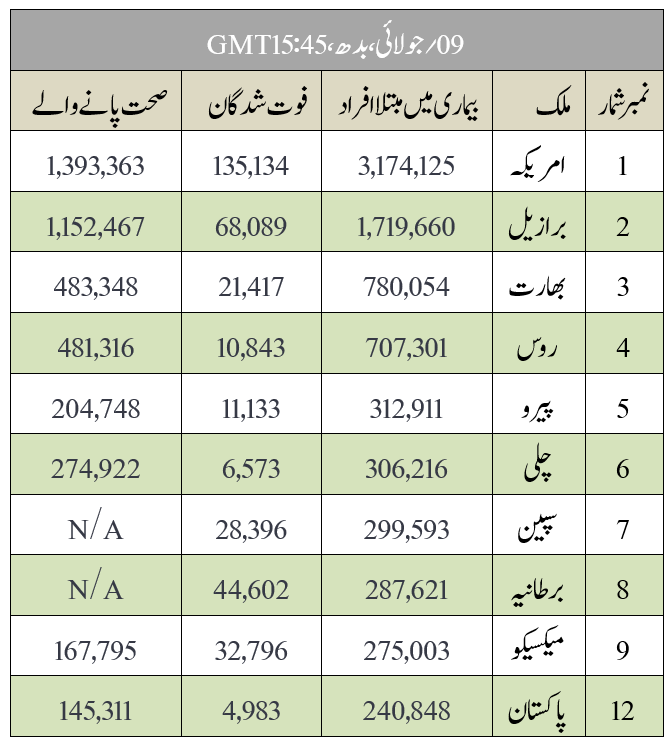 دنیا بھر میں بارہ ملین کیسز پاکستان میں پانچ ہزار اموات سوڈان میں پروازیں شروع WHOکے ردعمل کے جائزہ کے لئے آزاد پینل آئیوری کوسٹ کے وزیراعظم کی وفات چین میں اس سال کھیلوں کے مقابلے نہیں ہوں گے یونائیٹد ایئر لائن کے ہزاروں ملازمین فارغ برطانوی کرکٹ ٹیم مشکلات کا شکار ایشیا کپ ملتوی Worldometers.infoکی طرف سے جاری کئےگئے اعداد و شمار کے مطابق تمام دنیا میں اب تک کے کنفرمڈ کیسز کی تعداد12,239,516؍ہےاور اس وباء کے نتیجہ میں وفات پانے والے 553,676؍اور 7,115,372؍افراد Covid-19 میں مبتلا ہو کر صحت یاب ہوچکے ہیں ۔ ذیل میں بعض ممالک کی ایک مختصر فہرست دی جا رہی ہے جو کہ اس وائرس سے زیادہ متاثر ہیں۔ (www.worldometers.info) (ویب سائٹ پر نظر آنے والایہ چارٹ اوپر دئے گئے وقت اور دن کے مطابق آپ کو تازہ ترین اعدادوشمار بتا رہا ہے۔) WHO عالمی ادارۂ صحت نے Covid-19 کے بارہ میں ادارہ کے ردعمل کا جائزہ لینے کے لئے ایک آزاد پینل مقرر کیا ہے۔ اس پینل کی سربراہی نیوزی لینڈ کی سابقہ وزیراعظم Helen Clark اور لائبیریا کی سابقہ صدر Ellen Johnson Sirleafکریں گی۔ (ڈان) دنیا بھر میں کورونا وائرس کے مصدقہ کیسز کی تعداد 12 ؍ملین سے تجاوز کرگئی ہے۔ ان میں اسے آدھے کیسز امریکہ اور لاطینی امریکہ میں ہوئے ہیں۔ 31؍مئی سے اب تک کیسز میں دوگنا اضافہ ہوا ہے۔ (ڈان) Gilead Sciences فارماسیوٹیکل کمپنی کا کہناہے کہ وہ Remdesivir کی ایسی قسم کے ٹیسٹ کر رہے ہیں جسے سانس کے ساتھ اندر لے جایا جاسکتا ہے۔ (ڈان) https://twitter.com/Reuters/status/1281065548852400128?s=20 https://twitter.com/Reuters/status/1281065548852400128?s=20 Oxfamچیریٹی کا کہنا ہے کے سال کے آخر تک کورونا وائرس کی وجہ سے پیدا ہونے والی بھوک سے روزانہ 12,000 ؍ لوگوں کی ہلاکت ہوسکتی ہے۔ وائرس سے اس سے کم لوگوں کی ہلاکت کا خدشہ ہے۔ (بی بی سی) ایشیا پاکستان پاکستان میں کورونا وائرس سے ہونے والی ہلاکتوں کی تعداد پانچ ہزار سے تجاوز کرکے 5,023؍ ہوگئی ہے دوسری طرف صوبہ سند ھ میں کورونا وائرس کے مصدقہ کیسز کی تعداد ایک لاکھ سے تجاوز کرگئی ہے۔ (ڈان) پاکستان میں 15؍ستمبر سے سکولوں اور یونیورسٹیوں کو سخت طبی حفاظتی اقدامات کے ساتھ دوبارہ کھولا جارہا ہے۔ (ڈان) ایران وزارت صحت کے مطابق ایران میں پھر ایک بار ایک دن میں ریکارڈ 221؍ہلاکتیں ہوئی ہیں۔ مصدقہ کیسز کی تعداد اڑھائی لاکھ سے تجاوز کرگئی ہے۔ (ڈان) امریکہ امریکہ کی دو بڑی یونیورسٹیوں Harvard, and MITکا کہنا ہے کہ وہ طلباء کے ویزے ختم کرنے پر امیگریشن کے حکام پر مقدمہ کریں گیں۔ (بی بی سی) امریکی صدر ڈونلڈ ٹرمپ کا کہنا ہے کہ اگر سکول جلد نہ کھولے گئے تو وہ ان کی فنڈنگ بند کرسکتے ہیں۔ https://twitter.com/realDonaldTrump/status/1280853299600789505?s=20 https://twitter.com/realDonaldTrump/status/1280853299600789505?s=20 گزشتہ ہفتے میں امریکہ میں مزید 1.3 ؍ ملین افراد نے بے روزگاری کی درخواستیں جمع کروائی ہیں۔ (ڈان) افریقہ افریقہ کے بیماریوں کے روک تھام کے ادارے کے مطابق افریقہ میں کورونا وائرس کے مصدقہ کیسز کی تعداد 500,000؍ سے تجاوز کرگئی ہے۔ (ڈان) https://twitter.com/JNkengasong/status/1281043621765156864 https://twitter.com/JNkengasong/status/1281043621765156864 نائیجیریا میں کورونا وائرس کے مصدقہ کیسز کی تعداد 30,000؍سے تجاوز کرگئی ہے۔ (الجزیرہ) ملک کے فضائی ادارے کے مطابق جنوبی سوڈان نے اندرون ملک اور عالمی پروازیں دوبارہ شروع کردی ہیں۔ (بی بی سی افریقہ) جنوبی افریقہ میں Zulu شاہی خاندان کی ایک ملکہ Queen Noloyiso Sandile کی کورونا وائرس سے وفات ہوئی ہے۔ ان کی عمر 56 ؍سال تھی۔ (بی بی سی افریقہ) https://twitter.com/SAgovnews/status/1281151107616534528?s=20 https://twitter.com/SAgovnews/status/1281151107616534528?s=20 اس اطلاع کے بعد کے کچھ ججز کے کورونا وائرس کے ٹیسٹ مثبت آئے ہیں غانا کے چیف جسٹس Kwasi Anin Yeboah بھی قرنطینہ ہوگئے ہیں۔ (بی بی سی افریقہ) آئیوری کوسٹ کے وزیراعظم Amadou Gon Coulibaly ایک کیبنٹ میٹنگ کے بعد بیمار ہوگئے تھے جس پر انھیں ہسپتال لے جایا گیا جہاں گزشتہ روزان کی وفات ہوگئی۔ وہ کچھ عرصہ پہلے ہی فرانس سے دل کا علاج کروا کر واپس آئے تھے۔ (بی بی سی افریقہ) نائیجیریا کی حکومت نے سکول کھولنے کا فیصلہ واپس لے لیا ہے اور کہا ہے کہ تعلیمی ادارے تب کھلیں گےجب ایسا کرن