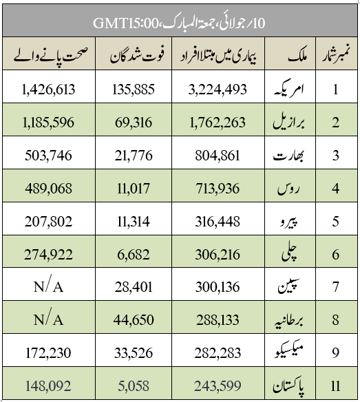 عالمی ادارۂ صحت نے قبول کیا کہ کورونا وائرس ہوا سے بھی پھیلتا ہے برطانیہ کے شہر لیسٹر میں گھر گھر جا کر ٹیسٹنگ اٹلی نے تیرہ ممالک پر پابندی لگائی امریکہ نے پی آئی اے کی اجازت منسوخ کردی ہانگ کانگ میں سکول پھر بند جاپان میں دوائی نے تسلی بخش نتائج نہیں دیے بولیویا کی صدر کو کورونا کینیا میں کورونا سے گائناکالوجسٹ کی ہلاکت سیرالیون میں مساجد کھل رہی ہیں انگلینڈ کے خلاف ویسٹ انڈیز کی پوزیش بہتر فٹبال چیمپئنز لیگ کواٹر فائنل کے draw ہوگئے Worldometers.infoکی طرف سے جاری کئےگئے اعداد و شمار کے مطابق تمام دنیا میں اب تک کے کنفرمڈ کیسز کی تعداد 12,442,037؍ہےاور اس وباء کے نتیجہ میں وفات پانے والے558,544؍اور 7,258,661؍افراد Covid-19 میں مبتلا ہو کر صحت یاب ہوچکے ہیں ۔ ذیل میں بعض ممالک کی ایک مختصر فہرست دی جا رہی ہے جو کہ اس وائرس سے زیادہ متاثر ہیں۔ (www.worldometers.info) (ویب سائٹ پر نظر آنے والایہ چارٹ اوپر دئے گئے وقت اور دن کے مطابق آپ کو تازہ ترین اعدادوشمار بتا رہا ہے۔) WHO عالمی ادارۂ صحت نے محققین کی طرف سے ان رپورٹس کو قبول کرتے ہوئے کہ کورونا وائرس ہوا سے بھی پھیلتا ہے، نئی ہدایات جاری کی ہیں۔ https://twitter.com/Reuters/status/1281534881831333888?s=20 https://twitter.com/Reuters/status/1281534881831333888?s=20 یورپ برطانیہ لیسٹر سٹی میں کورونا وائرس کی Door to Door ٹیسٹنگ شروع کردی گئی ہے۔ یہاں 29 ؍جون سے لاک ڈاؤن ہے۔ (بی بی سی) اٹلی اٹلی نے 13؍ایسے ممالک سے کے جن میں ان کے مطابق کورونا وائرس کے کیس بہت زیادہ ہیں لوگوں کے اپنے ملک میں آنے پر پابندی لگائی ہے۔ یہ پابندی ان مسافروں پر بھی عائد ہوگی جو گزشتہ 14؍دن میں ان ممالک کا سفر کرچکے ہیں یا وہاں سے ہوتے ہوئے آئیں گے۔ (الجزیرہ) ایشیا پاکستان John Hopkins University کے مطابق پاکستان میں کورونا وائرس کے مصدقہ مریضوں کی تعداد اٹلی کے مصدقہ مریضوں کی تعداد سے تجاوز کرگئی ہے۔ اس وقت پاکستان اس فہرست میں گیارہویں نمبر پر ہے۔ (ڈان) امریکہ کی ٹرانسپورٹ اتھارٹی نے پاکستان ایئر لائن کو امریکہ سے سپیشل ڈائریکٹ فلائٹس کی اجازت منسوخ کردی ہے۔ اس کی وجہ پاکستان ایئر لائن کے بعض پائلٹس کے متعلق مشکوک لائسنس رکھنے کی انکشافات ہیں۔ (ڈان) چین چین نے کورونا وائرس کے خدشات کے پیش نظر امریکہ، برازیل، جرمنی اور برطانیہ سے 23؍ قسم کی گوشت کی مصنوعات پر پابندی لگا دی ہے۔ (سی این این) ہانگ کانگ وزارت تعلیم کا کہنا ہے کہ ہانگ کانگ میں کورونا وائرس کے کیسز میں اضافے کے بعد سکولو ں کو سوموار سے دوبارہ بند کیا جارہا ہے۔ (الجزیرہ) https://twitter.com/AJEnglish/status/1281517265586999296?s=20 https://twitter.com/AJEnglish/status/1281517265586999296?s=20 جاپان جاپان میں کورونا وائرس کے لئے Fujifilm Holdings کی دوا Avigan کے طبی ٹرائل میں تسلی بخش نتائج حاصل نہیں ہوئے ہیں۔ یہ تجربات مارچ سے مئی کے درمیان 89؍مریضوں پر کئے گئے۔ روس اور بھارت میں یہ دوا Covid-19 کے علاج کے لئے منظور ہوچکی ہے۔ (الجزیرہ) جنوبی کوریا Seol کے میئر Park Won-soon جو کل لاپتہ ہوگئے تھے ان کی لاش ملی ہے۔ ابتدائی طور پر یہ ایک خودکشی تصور کی جارہی ہے۔ ان پر جنسی ہراسگی کے الزامات تھے۔ (الجزیرہ) قزاقستان حکومت نے ان چینی انتظامیہ کی جانب سے شائع کی گئی ان خبروں کی تردید کی تھی کہ ان کے ملک میں نامعلوم قسم کے ایک نمونیا کی وباء پھوٹ پڑی ہے جو کہ کورونا وائرس سے زیادہ مہلک ہے۔ جمعرات کے روز چینی ایمبسی نے اپنے شہریوں کو اس کے متعلق خبردار کیا تھا۔ جمعہ کے روز قزاقستان کی انتظامیہ نے اس نامعلوم نمونیا کی تصدیق کی ہے لیکن ان کا کہنا ہے کہ یہ نا تو نیا ہے اور نہ ہی نامعلوم۔ (سی این این) ترکی ترکی کی ایک ہائی کورٹ نے استنبول کی مسجد Hagia Sofia کو 1934ء میں ایک میوزیم میں تبدیل کرنے کے فیصلے کو کالعدم قرار دے دیا ہے۔ ترکی انتظامیہ اسے دوبارہ مسجد کا درجہ دینا چاہتی ہے۔ (الجزیرہ) امریکہ John Hopkins Universityکے مطابق امریکہ میں ایک بار پھر ایک دن میں کورونا وائرس کے ریکارڈ کیس رپورٹ ہوئے ہیں۔گزشتہ روز یہ تعداد65,651 ؍ رہی۔ (الجزیرہ) https://twitter.com/realDonaldTrump/status/1281206354334625793?s=20 https://twitter.com/realDonaldTrump/status/1281206354334625793?s=20 امریکی سپریم