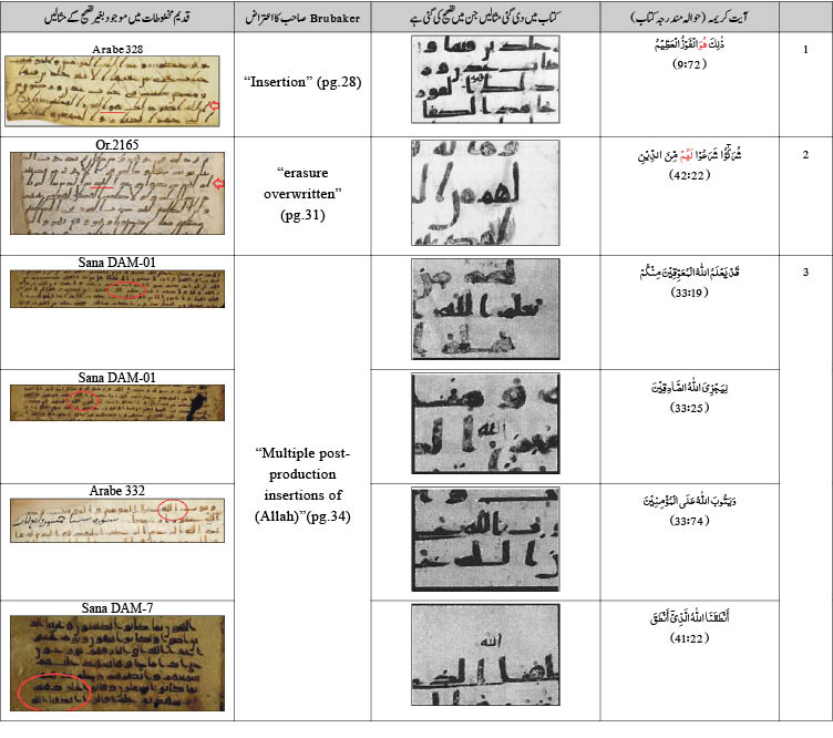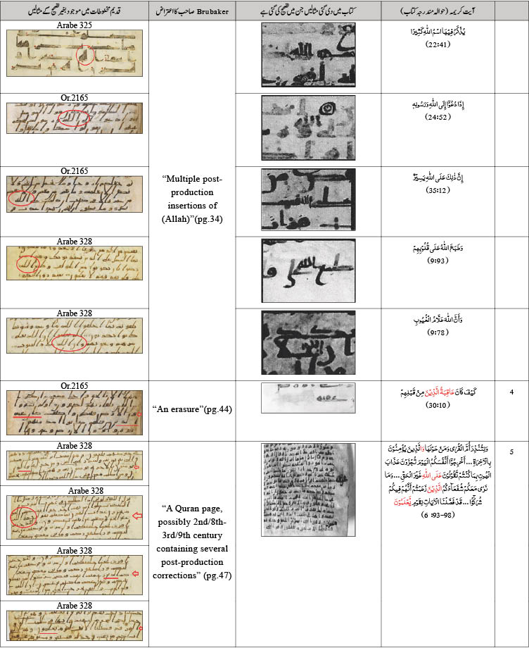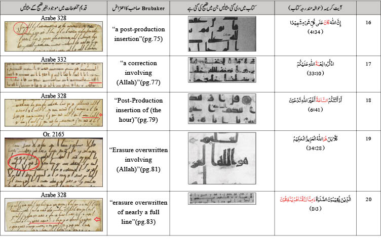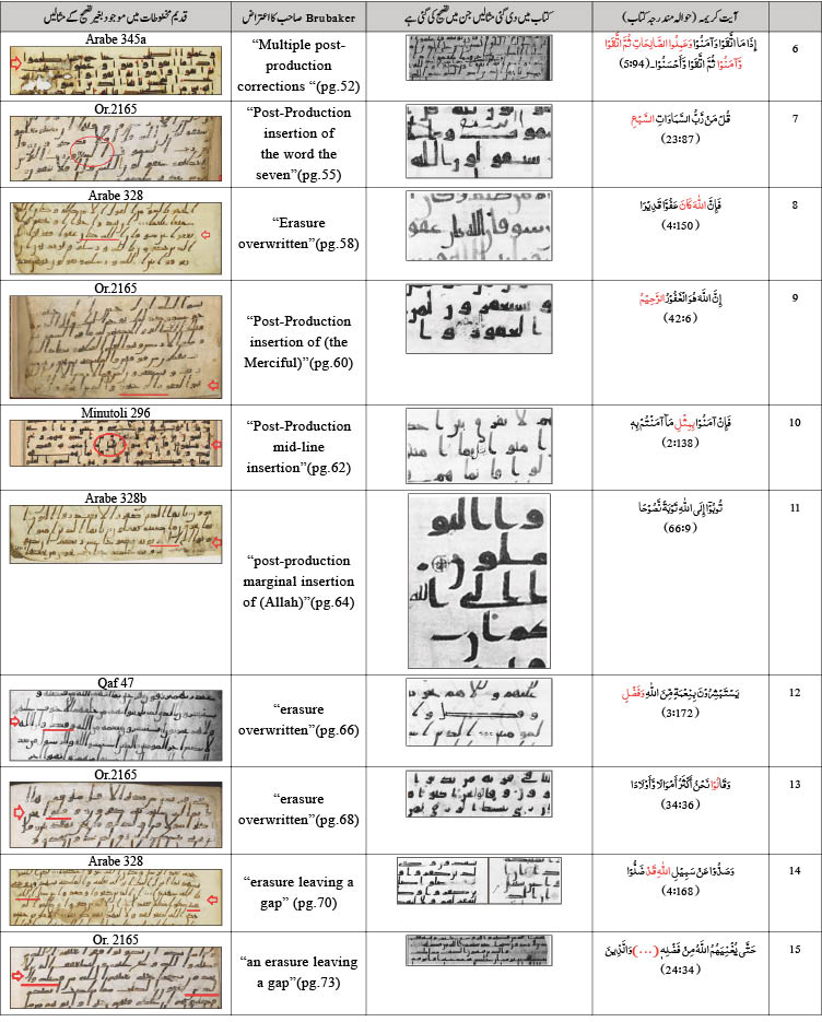 مکرم شہود آصف صاحب نے الفضل انٹرنیشنل کے شمارہ 28؍ جولائی 2020ء میں اپنے ایک مضمون میں اس کتاب پر قراءت کے اختلاف کے سیاق وسباق میں روشنی ڈالی ہے۔ ذیل کے مضمون میں ڈاکٹر Brubaker صاحب کی پیش کردہ مثالوں کو مد نظر رکھ کر تبصرہ کیا گیا ہے۔ ڈاکٹر Brubakerکااپنی کتاب Corrections in Early Quran Manuscripts: Twenty Examples میں تنقید متن (Textual Criticism) کے اصولوں کو بالائے طاق رکھ کرقرآن کریم کے قدیم نسخہ جات کو جدید اشاعتی اصولوں پرپرکھنا نہایت حیران کن ہے۔ موصوف کی ’’تحقیق‘‘ غلطیوں سے پُرہے۔ قدیم نسخہ جات کی تصحیح کا موازنہ قاہرہ ایڈیشن سے کرنا مضحکہ خیز امر ہے۔ موصوف کی تحقیق کا ماحصل یہ ہے کہ متن قرآن آہستہ آہستہ اس شکل میں وجود میں آیا ہے جو ہمارے پاس اب موجود ہے۔ موصوف کا یہ دعویٰ کسی قدر قابل اعتنا ہو سکتا تھا اگر وہ یہ دکھاتے کہ تمام قدیم نسخوں میں لفظ یا آیت یا حرف ایک صورت میں تھا جو بعد کے نسخوں میں تبدیل کر دیا گیا۔ مگر جیسا کہ قارئین آگے دیکھیں گے کہ ایسا ہرگز نہیں بلکہ قرآن کا متن شروع سے آج تک ایک ہی ہے۔ موصوف کا دعویٰ ہے کہ اس نے اس تحقیق کی غرض سے ہزاروں قدیم مخطوطات دیکھے ہیں۔ اگر ان کا یہ دعویٰ ٹھیک ہے تو یہ مانے بغیر چارہ نہیں کہ وہ عمدا ًحق کو چھپا رہے ہیں۔ موصوف نے اپنی کتاب میں مخطوطات قرآنی میں تصحیح کی 20مثالیں دی ہیں۔ اگر ضمنی مثالوں کو بھی ملا لیا جائے تو ان کی تعداد31 بن جاتی ہے۔ ذیل میں خاکسار موصوف کی دی ہوئی ترتیب کے مطابق ہر مثال قرآن کریم کے قدیم ترین نسخہ جات سے دکھائے گا۔ اس سے ثابت ہو گا کہ موصوف نے ہزاروں مخطوطات میں سے صرف اسی کو چنا جس میں تحریر کنندہ سے لکھتے ہوئےغلطی ہوئی اور بعد میں درست کر لی گئی۔ اگر ایسے نہ ہوتا تو ان نسخہ جات کے ہم عصر یا پرانے نسخوں میں وہ آیت اصل شکل میں موجود نہ ہوتی۔ ایسے نسخہ جات بہت زیادہ ہیں۔ خاکسار ذیل میں ہر ایک کی صرف ایک مثال پیش کرے گا۔