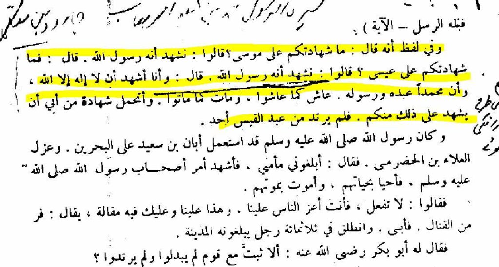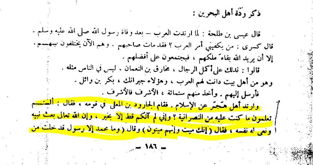 رسول اللہﷺ کے وصال پر ارتداد اختیار کرنےوالے قبائل نے کیا دلیل پکڑی؟ رسول کریمﷺ کے وصال کے بعد عرب کے کئی قبائل نے ارتداد اختیار کر لیا تھا۔ اسلامی تاریخ کی مشہور کتاب تاریخ طبری جلد دوم باب 5میں مرتدین بحرین وعمان اور یمن کا ذکر ہے۔ اہل بحرین کا ذکر کرتے ہوئے لکھا ہے کہ ’’اہل بحرین مرتد ہوگئے ان میں سے عبد القیس پھر اسلام لے آئے البتہ بکر مرتد ہی رہے جس شخص کی کوشش سے عبد القیس دوبارہ اسلام میں داخل ہوئے وہ جارود تھے۔‘‘ (تاریخ طبری از ابو جعفر محمد بن جریر الطبری جلد دوم صفحہ نمبر 99 ترجمہ سید محمد ابراہیم نفیس اکیڈمی اردو بازار کراچی ) اہل بحرین میں سے بنو عبد القیس کے ارتداد اختیار کرنے اور دوبارہ مسلمان ہونے کا واقعہ تفصیل سے درج ہے۔ بنو عبد القیس نے ارتداد اختیار کرتے ہوئے کیا دلیل پکڑی اور پھر واپس اسلام میں داخل کس دلیل سے ہوئے اس کا ذکر تاریخ طبری میں کچھ یوں ہے۔ ’’رسول اللہﷺ نے وفات پائی ۔ان کے قبیلے نے عبد القیس سے کہا اگر محمدنبی ہوتے تو وہ کبھی نہ مرتے اور سب مرتد ہوگئے ۔اس کی اطلاع جارود رضی اللہ عنہ کو ہوئی انہوں نے ان سب کو جمع کیا تقریر کرنے کھڑے ہوئے اور کہا ’’اے گروہ عبد القیس ! میں تم سے ایک بات پوچھتا ہوں اگر تم اسے جانتے ہوتو بتانا او ر اگر نہ جانتے ہو تو نہ بتانا ‘‘انہوں نے کہا جو چاہو سوال ۔کرو جارود رضی اللہ عنہ نے کہا جانتے ہو کہ گذشتہ زمانے میں اللہ کے نبی دنیا میں آچکے ہیں۔ انہوں نے کہا ہاں۔ جارود نے کہا تم ان کو صرف جانتے ہو یا تم نے ان کو دیکھا بھی ہے؟ انہوں نے کہا کہ نہیں ہم نے ان کو دیکھا تو نہیں لیکن ہم ان کو جانتے ہیں۔ جارود رضی اللہ عنہ نے کہا کہ پھر کیا ہوا؟انہوں نے کہا وہ مر گئے ۔جارود رضی اللہ عنہ نے کہا اسی طرح محمدﷺ بھی انتقال فرما گئے جس طرح سابقہ انبیاء دنیا سے اٹھ گئے اور میں اعلان کرتا ہوں لا الہ الا اللّٰہ وان محمدا عبدہ ورسولہ۔ ان کی قوم نے کہا کہ ہم بھی شہادت دیتے ہیں کہ سوائے اللہ کے کوئی حقیقی معبود نہیں ہے اور بےشک محمد اس کے بندے اور رسول ہیں اور ہم تم کو اپنا برگزیدہ اور اپنا سردار تسلیم کرتے ہیں۔ اس طرح وہ اسلام پر ثابت قدم رہے ارتداد کی وبا ان تک نہ پہنچی ‘‘ (تاریخ طبری از ابو جعفر محمد بن جریر الطبری جلد دوم صفحہ نمبر 99 ترجمہ سید محمد ابراہیم نفیس اکیڈمی اردو بازار کراچی ) اہل حدیث مکتبہ فکر اور سعودی عرب کے حکمران خاندان آل سعود کے امام شیخ الاسلام محمد بن عبد الوھاب اپنی کتاب میں لکھتے ہیں کہ ’’وارتد اھل ھجر عن الاسلام فقام الجارود بن المعلی فی قومہ فقال: الستم تعلمون ما کنت علیہ من النصرانیۃ ؟ و انی لم آتکم قط الا بخیر و ان اللّٰہ تعالیٰ بعث نبیہ و نعی لہ نفسہ فقال (انک میت و انھم میتون)وقال (وما محمد الا رسول قد خلت من قبلہ الرسل۔الآیۃ ) وفی لفظ انہ قال ماشھادتکم علی موسیٰ ؟ قالوا نشھد انہ رسول اللّٰہ قال: فما شھادتھکم علی عیسیٰ؟ قالو ا نشھد انہ رسول اللّٰہ قال وانا اشھد ان لا الہ الا اللّٰہ وان محمدا عبدہ رسولہ عاش کاما عاشوا ومات کما ماتوا واتحمل شھادۃ من ابی ان یشھد علی ذٰلک منکم فلم یرتد من عبد القیس احد ‘‘ (مختصر سیرۃ الرسولﷺ از محمد بن عبد الوھاب صفحہ نمبر 186، 187 ناشر دار العربیہ بیروت لبنان ) ترجمہ: جب اہل حجر نے اسلام سے ارتداداختیارکیا توحضرت جارود بن معلی رضی اللہ عنہ اپنی قوم میں کھڑے ہوئے، پس آپ نے فرمایا: کیا تم نہیں جانتے کہ جو (عرصہ)میں عیسائیت کے مذہب پر تھا؟اورمیں کبھی بھی تمہارے پا س خیر کی خبر کے سوا کچھ نہیں لایا۔ اوریقیناً اللہ تعالیٰ نے اپنے نبی کو مبعوث فرمایا اور اس کی موت پر خود (اللہ تعالیٰ)سوگوارہوا۔ پس آپ نے یہ آیت تلاوت کی(إنك ميت وإنهم ميتون)اوریہ آیت بھی تلاوت فرمائی کہ (وما محمدالارسول قد خلت من قبله الرسل) اوران الفاظ میں بھی ہے کہ آپ نے فرمایا: حضرت موسیٰؑ کے بارہ میں تمہاری کیاگواہی ہے؟انہوں نے کہا: ہم گواہی دیتے ہیں کہ وہ اللہ کا رسول ہے۔ آپ نے فرمایا: حضرت عیسیٰؑ کے بارہ میں تمہاری کیا گواہی ہے؟انہوں نے کہا: ہم 