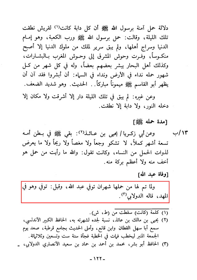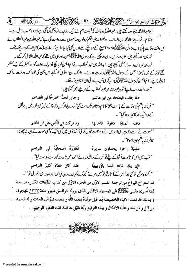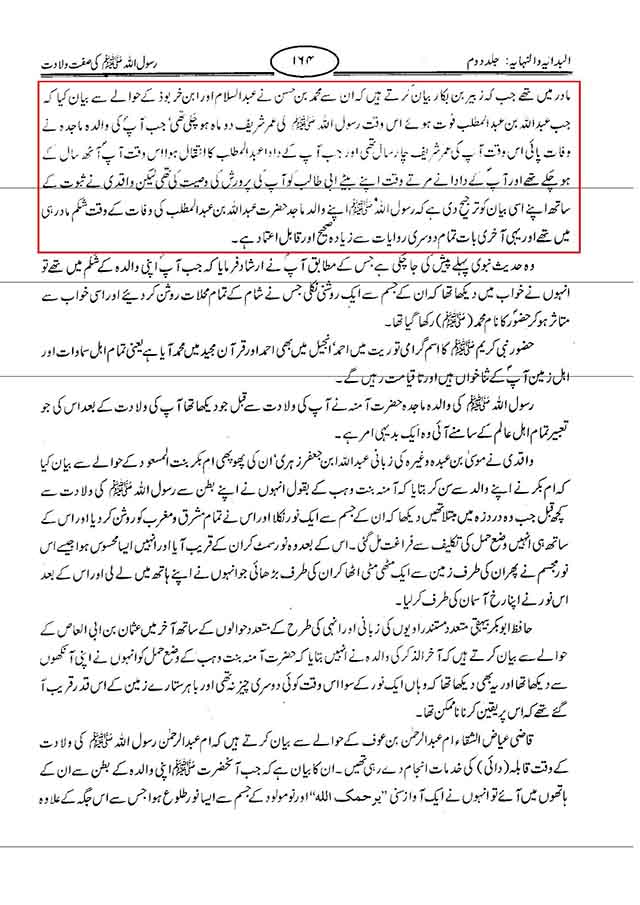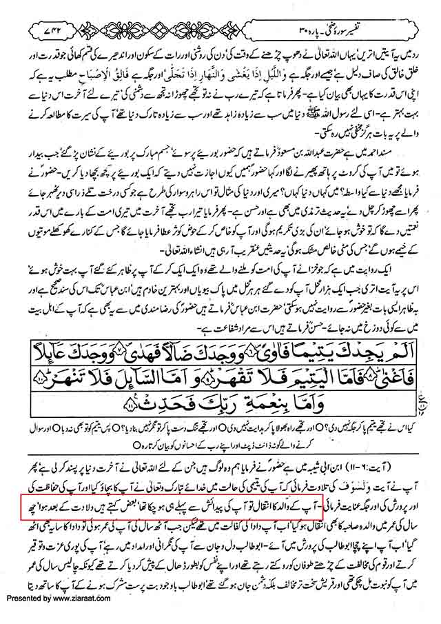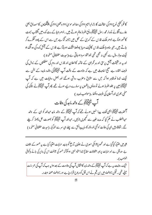 سیّدنا حضرت اقدس مسیح موعود علیہ الصلوٰۃ والسلام پر ایک اعتراض یہ بھی کیا جاتا ہے کہ آپؑ نے یہ لکھا ہے کہ نبی اکرمﷺ کے والد آپؐ کی پیدائش کے بعد فوت ہوئے تھے جبکہ یہ ایک مشہور تاریخی حقیقت ہے کہ آپؐ کے والد آپؐ کی پیدائش سے پہلے ہی فوت ہوچکے تھے۔ ذیل میں سنی اور شیعہ کتب سیرت کے وہ حوالہ جات درج کیے جا رہے ہیںجن میں لکھا ہے کہ ایسی روایات بھی پائی جاتی ہیں کہ نبی اکرمﷺ کے والد آپؐ کی پیدائش کے بعد فوت ہوئے تھے۔ ٭…المواہب اللدنیۃ ولما تم لھا من حملھا شھران توفي عبداللّٰہ، و قیل: توفي و ھو في المھد (الجزء الاول صفحہ 122) ٭…تاریخ ابن کثیر (البدایہ و النّھایہ) اردو ترجمہ ’’جب عبداللہ بن عبدالمطلب فوت ہوئے اس وقت رسول اللہﷺ کی عمر شریف دو ماہ ہوچکی تھی‘‘۔ (حصہ اول۔دوم صفحہ164) ٭…طبقات ابن سعد اردو ترجمہ ’’ہشام نے اپنے والد محمد بن السائب اور عنوانہ بن الحکم، دونوں صاحبوں سے روایت کی ہے کہ عبداللہ بن عبدالمطلب نے اس وقت وفات پائی جب رسول اللہﷺ 29,28مہینے کے ہوچکے تھے اور یہ بھی کہا جاتا ہے کہ سات(7) مہینے کے ہوچکے تھے۔‘‘ ( جلد اول صفحہ120) ٭…سیرت خاتم الانبیاء از مفتی محمد شفیع عثمانی ’’ایک روایت یہ ہے کہ آپﷺ کے والد ماجد کا انتقال آپ کی ولادت کے بعد ہوا جب کہ آپ کی عمر سات مہینے تھی‘‘ (صفحہ13) ٭…مدارج النبوۃ از شیخ عبدالحق محدث دہلوی ’’محمد بن اسحاق کہتے ہیں کہ حضور اکرمﷺ ابھی شکم مادر ہی میں تھے کہ حضرت عبداللہ رضی اللہ عنہ کی وفات ہوگئی تھی۔ بعض کہتے ہیں کہ آٹھ ماہ یا سات ماہ یا دو ماہ کے تھے کہ وفات پائی۔اور یہ قول اصح اقوال ہے۔‘‘ ( اردو ترجمہ صفحہ29) ٭…الرحیق المختوم از صفی الرحمٰن مبارکپوری اردو ترجمہ ’’اکثر مؤرخین کے بقول ابھی رسول اللہﷺ پیدا نہیں ہوئے تھے۔البتہ بعض اہل سیر کہتے ہیں کہ آپﷺ کی پیدائش ان کی وفات سے دو ماہ پہلے ہوچکی تھی۔‘‘ (صفحہ82) ٭…تفسیر ابن کثیر ’’آپ کے والد کا انتقال تو آپ کی پیدائش سے پہلے ہی ہوچکا تھا، بعض کہتے ہیں ولادت کے بعد ہوا۔‘‘ ( تفسیر سورۃالضحیٰ آیت 6-11) ٭…حیات القلوب اردو ترجمہ ’’کہتے ہیں کہ جب حضرت عبداللہ نے سوئے بہشت رحلت فرمائی جناب رسالت مآب صلعم کی عمر مبارک دو ماہ کی تھی۔ ایک روایت میں ہے کہ آنحضرتؐ سات مہینے کے تھے۔‘‘ ( جلد دوم صفحہ91باب اول) ٭…کتاب الشافی اردو ترجمہ اصول کافی ’’اور آپؐ کے والد حضرت عبداللہ نے مدینہ میں اپنے ماموؤں کے پاس انتقال کیا جبکہ آپؐ صرف دو ماہ کے تھے۔‘‘ ( جلد سوم کتاب الحجۃ صفحہ6) ٭…٭…٭