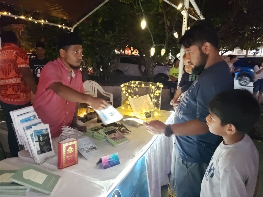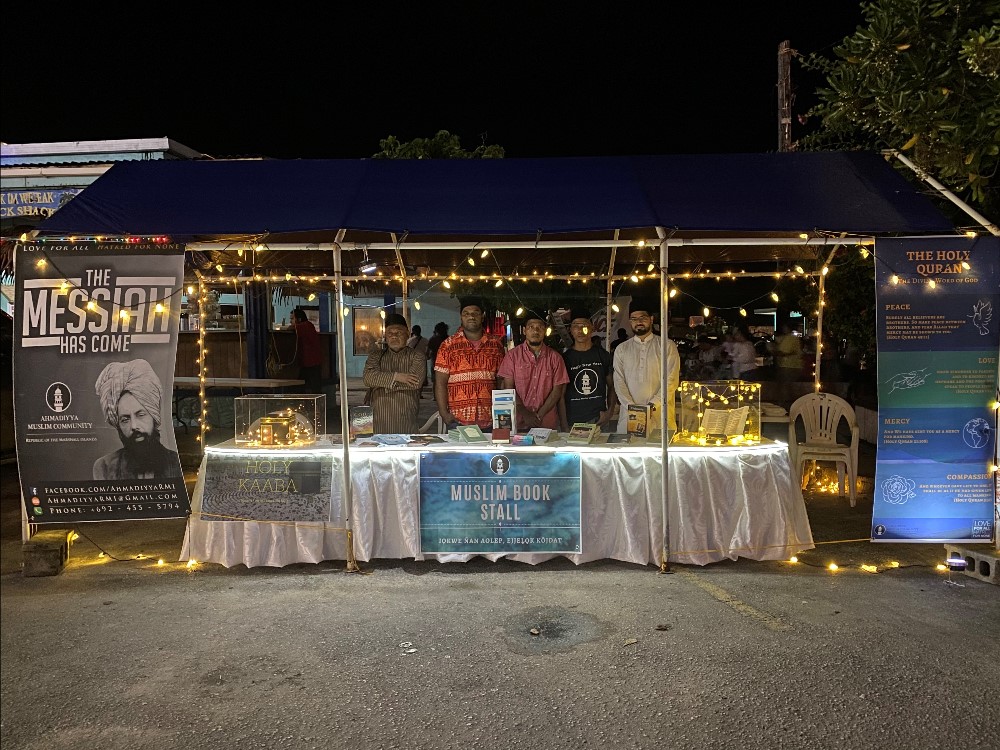 12؍دسمبر 2020ء کو گورنمنٹ مارشل آئی لینڈز نے ایک نیشنل مارکیٹ لگائی جس میں مختلف تنظیموں کو اپنی اپنی مصنوعات بیچنے کا موقع ملا۔ اللہ تعالیٰ کے فضل سے جماعت احمدیہ مارشل آئی لینڈز کو بھی اس میں شرکت کرنے کا موقع ملا۔ جماعت کی طرف سے کتابوں کا سٹال لگا یا گیا جس میں قرآن کریم کی نمائش بھی شامل تھی۔ اسی طرح کتب حضرت مسیح موعودؑ، جماعت کا مقامی نیوز لیٹر Meram Eo، خانہ کعبہ کا ماڈل اور حضرت مسیح موعودؑ کی تصویر اس نمائش میں شامل تھی۔ مارشل آئی لینڈز کی لجنہ نے بھی اس سٹال میں حصہ لیا اور سٹال میں بیچنے کے لیے بٹر چکن اور چناچاٹ تیار کی۔ اس مارکیٹ کو سینکڑوں لوگ دیکھنے آئے اور جماعت کے سٹال میں خانہ کعبہ کا ماڈل اور قرآن کریم کی نمائش خصوصی توجہ کا مرکز بنی۔ اسی طرح بہت سے لوگوں کے ساتھ بات کرنے اور ان کے سوالوں کے جواب دینے کا موقع بھی ملا۔ اللہ تعالیٰ کے فضل سے 12کتب فروخت ہوئیں جبکہ 164 نیوز لیٹر بھی تقسیم کیے گئے۔ اسی طرح کھانے کی بھی 47 پلیٹیں بھی فروخت ہوئیں۔ نیشنل اخبار اور نیشنل ٹی وی کے نمائندوں نے بھی سٹال کا وزٹ کیا۔ (رپورٹ: ساجد اقبال۔ مربی سلسلہ و نمائندہ الفضل انٹرنیشنل)
