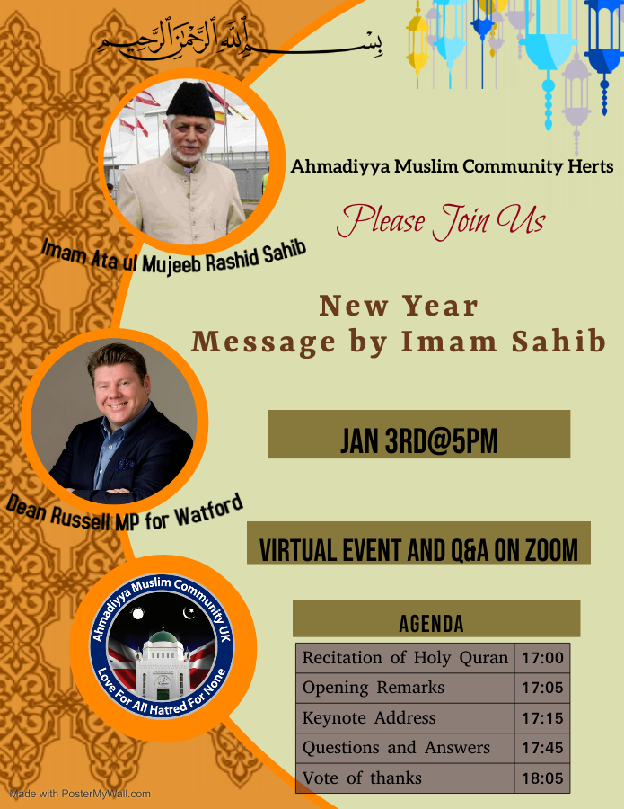 مورخہ 3جنوری 2021ء شام پانچ بجے جماعت احمدیہ ہاٹفورڈ شائریوکے کے زیر اہتمام ’’امام صاحب کا نئے سال کا پیغام‘‘ کے عنوان کے تحت پہلا ریجنل آن لائن پروگرام منعقدکیا گیا۔ جس میں پورے ریجن سے قریب ایک ہزار افراد جماعت نے شرکت کی۔ اس اجلاس میں محترم عطاءالمجیب صاحب راشد امام مسجد فضل لندن مقرر خصوصی تھے جبکہ واٹفورڈ کے ممبر آف پارلیمنٹ ڈین رسل نے تقریب میں خصوصی شرکت کی۔ پروگرام کا آغاز تلاوت قرآن کریم سے ہوا۔ محترم شاہزیب اطہر صاحب مربی سلسلہ ہارٹفورڈشائر نے خوش الحانی سے سورت النساء کی منتخب آیات مع ترجمہ پڑھیں ۔ جس کے بعد مکرم محمد رفیع الدین صاحب (ریجنل امیر)نے مہمانوں کو خوش آمدید کہا اور تقریب میں شامل ہونے پر شکریہ ادا کیا۔ بعد ازاں شرکاءکی خدمت میں ایک ویڈیو پیش کئی گئی جس میں تمام ریجن میں ہونے والے سماجی کاموں کی جھلکیاں پیش کی گئیںجن میں جماعت کی تمام تنظیموں نے امدادی کاموں میں بڑھ چڑھ کر حصہ لیا تھا۔ اس کے بعد خاکسار نے تقریب کے پہلے مقرر اور مہما ن خصوصی ڈین رسل ایم پی ( Dean Russell MP)برائے واٹفورڈ کا تعارف پیش کیا۔ ڈین رسل کا خاندان 130سال سے زائد عرصہ سے یہاں مقیم ہے۔موصوف ممبر آف پارلیمنٹ منتخب ہونے کے بعد ہی پارلیمنٹ کی ہیلتھ اینڈ سوشل کیئر سیلیکٹ کمیٹی اور انسانی حقوق کی مشترکہ کمیٹی کے ممبر بن گئے۔ڈین نے آل پارٹی پارلیمانی گروپ برائے انٹرپرینیورشپ ، دماغی صحت اور احمدیہ مسلم کمیونٹی میں بھی شمولیت اختیار کی ہے۔ بعد ازاں موصوف نے تقریر کی جس میں جماعت احمدیہ کے سماجی کاموں کو سراہتے ہوئے کہا کہ جماعت احمدیہ موجودہ اندھیروں میں امید کی کرن کی مانند ہے اور ان سب کا شکریہ ادا کیا جو بے لوث خدمتِ خلق میں مصروف ہیں۔ انہوں نے جماعت احمدیہ کے ساتھ مل کر کام کرنے کی خواہش کا اظہار بھی کیا۔ اس کے بعد اس تقریب کے مقرر خصوصی محترم عطاءالمجیب صاحب راشد مبلغ انچارج و نائب امیر یوکے کا تعارف محترم شاہزیب اطہر صاحب مربی سلسلہ نے پیش کیا۔ محترم امام صاحب نے اپنی تقریر کا آغاز حضرت خلیفۃ المسیح الخامس ایّدہ اللہ تعالیٰ بنصرہ العزیز کے ارشادات و رہنمائی کی روشنی میں نئے سال کی مبارک باد اور دعائیہ کلمات سے کیا اور کہا کہ ہمیں سال کے آغاز میں اپنے نفسوں کا محاسبہ کرنا چاہیے کہ کون سی نیکیاں ہم نے گزشتہ سال کیں اور کیا کمزوریاں ہم سے سرزد ہوئیں نیز یہ کہ ان کو آنے والے سال میں ختم کرنے کا عزم کیا جائے۔امام صاحب نے نہایت خوبصورتی کے ساتھ ایک احمدی کی ذمہ داریوں کی طرف توجہ دلائی۔ انہوں نے بتایا کہ ایک احمدی کو معاشرے کی خدمت اور اس کی بہتری میں اہم کردار ادا کرنا چاہیے، اپنے ہمسایوں کا خیال کرنا چاہیے، خلافت کی کماحقہ اطاعت، دعا میں باقاعدگی ،نمازوں اور قرآن کریم کی تلاوت کو اپنا دستور العمل بنانے کی پوری کوشش کرنی چاہیے، اسی طرح آج کل لوگ گھروں میں کورونا کی وجہ سے زیادہ وقت اپنے اہل خانہ کے ساتھ گزار رہے ہیں چنانچہ ہمیں اسوۂ کاملؐ پر عمل کرتے ہوئے میاں بیوی، والدین اور بچوں کے ساتھ عزت و احترام کا رشتہ روا رکھنا چاہیے۔ مزید یہ کہ وبا سے متعلق حکومتی اقدامات کا احترام کرنا اور تمام احتیاطی تدابیر کو اختیار کرنا چاہیے۔ تقریر پر ڈین رسل نے بھی خوشنودی کا اظہار کیا اور کہا کہ میں نے امام صاحب کی تقریر کو بہت غور سے سنا ہے ان کا خطاب بہت پر اثر اور دانائی سے پر تھا۔ تقریر کے بعد سوال و جواب کا سلسلہ شروع ہوا جس میں امام صاحب اور ڈین صاحب سے احباب جماعت نے سوالات کیے۔ ایک سوال کے جواب میں امام صاحب نے آج کے دور میں منصب خلافت کی اہمیت واضح کی اور حضور انور کے مختلف سربراہان مملکت کو لکھےجانے والے خطوط کا ذکر کیا۔ ڈین صاحب نے ذہنی صحت اور کورونا کی دیکسین لگوانے کے حوالے سے سوالات کے جوابات دیے۔ اجلاس کے اختتام پر ریجنل امیر صاحب نے منتظمین ، مقررین اور شاملین کا شکریہ ادا کیا۔ تقریب کا اختتام اجتماعی دعا سے ہوا جو محترم عطاء المجیب راشد صاحب نے کروائی۔ ممبر آف پارلیمنٹ ڈین رسل نے بھی اسلامی طرز پر ہاتھ اٹھ