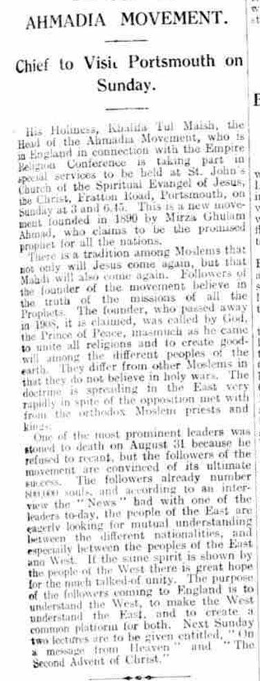 حضرت مصلح موعود رضی اللہ تعالیٰ عنہ نے Conference of the Living Religions of the Empire میں شمولیت اختیار فرمانے کی خاطر 21؍ اگست 1924ء کو لندن میں ورود فرمایا۔ آپ مشرقِ وسطیٰ سے ہوتے ہوئے، روم اور پیرس میں قیام فرماتے ہوئے لندن تشریف لائے تھے۔ سفر کے اس حصے کا آغاز 20؍اگست کی شام روم سے بذریعہ ریل ہوا جو اگلی صبح قریب 9بجے پیرس پہنچی۔ یہاں سے ایک دوسری ریل کے ذریعہ فرانس کی بندرگاہ Calais پر حضورؓ نے مع رفقائے قافلہ ورود فرمایا۔ یہاں سے بذریعہ بحری جہاز رودبارِ انگلستان کو عبور کیا گیا اور انگلستان کی بندرگاہ Doverپہنچ کر ایک مرتبہ پھر ریل کا سفر اختیار کیا گیا۔ ڈوور سے شام چار بجے روانہ ہونے والی یہ ریل گاڑی شام چھ بجے کے قریب لندن کے وکٹوریہ سٹیشن پر پہنچی۔ اخبارات کی رپورٹ سے معلوم ہوتا ہے کہ یہ انگلستان کی مشہور ریلوے کمپنی Continental Expressکی ریل گاڑی تھی جوحضرت مصلح موعودؓ اور آپ کے اصحاب کو لے کر وکٹوریہ سٹیشن پر پہنچی۔ پلیٹ فارم پر قدم رنجا فرماتے ہی اذان دی گئی اور حضرت مصلح موعودؓ نے اپنے رفقاء سمیت پلیٹ فارم پر ہی نماز ادا کی۔ یہ منظرسٹیشن پر موجود ہر خاص و عام کے لیے ایک انوکھا اور دلچسپ نظارہ تھا۔ وہاں موجود پریس کے نمائندگان نے بھی حضورؓ کی تشریف آوری اور پلیٹ فارم پر ادا کی گئی اس نماز کا ذکر کیا۔ مثلاً لندن کے مشہور اخبار The Evening News نے 23؍اگست کے شمارے میں لکھا: “Travellers at Victoria Station got a surprise when a party of green-turbaned foreigners, headed by an imposing figure, stepped straight from the Continental Express and opened prayer on the platform”. یہاں سے حضورؓ اپنے قافلہ سمیت لندن کے مشہور مقام Ludgateپر تشریف لے گئے اور دعا کی۔ ایک انگریزی اخبار Illustrated London News نے اس مقام کے نام کی اسلامی نسبت بیان کرتے ہوئے 30؍اگست کو اس خبر کو یوں شائع کیا: “On the day of his arrival he offered prayer at Ludgate Circus, in accordance with an Islamic tradition regarding prayer at Bab-ul-lud, an Arabic name resembling our Gate of Lud”. اخبار مذکور نے حضرت مصلح موعودؓ کاپورٹریٹ فوٹو بھی شائع کیا۔ Illustrated London Newsمیں شائع ہونے والا حضرت مصلح موعودؓ کا پورٹریٹ فوٹو حضرت مصلح موعودؓ کے اس قافلہ کے سفر کے تمام انتظامات مشہور سفری کمپنی Thomas Cook کے ذریعہ کیے گئے تھے۔ ان کا دفتر بھی Ludgate Circusپر ہی تھا۔ چونکہ حضور کی تمام ڈاک انہی کے پتہ پر آنی تھی، لہٰذا حضورؓ ان کے دفتر بھی اسی وقت تشریف لے گئے۔ قیامِ لندن کے باقی عرصہ میں بھی حضورؓ سفر کے بعض انتظامات وغیرہ کی غرض سے اس دفتر تشریف لے جاتے رہے۔ یہاں سے حضور St Paul‘s Cathedral تشریف لے گئے اور اس کی داخلی سیڑھیوں پر کھڑے ہوکر لمبی اور پرسوز دعا کی۔ یہ گرجا قریب 1400 سال سے سینٹ پال کے نام سے موسوم لندن کے بلند ترین مقام Ludgate Circusکے قریب ہے۔ ان صدیوں میں اس کی عمارت کی ظاہری ہیئت تبدیل ہوتی رہی۔ جب لندن کی مشہور آتش زدگی (The Great Fire of London) میں اس کی عمارت منہدم ہوگئی تو موجود ہ عمارت کی تعمیر شروع ہوئی۔ موجودہ عمارت چرچ آف انگلینڈ کے پاپائے روم کی عملداری کے بعد انگلستان میں تعمیر ہونے والا پہلا گرجا ہے۔ یوں اس گرجا کو مغربی عیسائی دنیا بالخصوص انگلستان میں خاص مقام حاصل ہے۔ دوسری جنگِ عظیم کے دوران برطانوی وزیر اعظم نے ایک صبح لندن فائر بریگیڈ کے مرکز میں فون کیا اور وہاں موجود ذمہ دار افسر Mrs Morris کو کہاکہ’’کچھ بھی ہوجائے، سینٹ پال کیتھڈرل کو ہرگز کوئی نقصان نہیں پہنچنا چاہیے۔ یہ بات لندن فائربریگیڈ کے ہر کارکن کو اچھی طرح باور کروادی جائے۔ ‘‘ پس مرکزِ تثلیث میں پہنچتے ساتھ، تثلیث کی سب سے بڑی علامت کے سامنے حضرت کاسرِ صلیبؑ کے جانشین نے فتح اسلام کے لیے دعا کی اور پھر اپنی دیگر مصروفیات کی طرف رخ کیا۔ سب سے پہلے آپؓ اپنی رہائش گاہ واقع 6 Chesham Place تشریف لے گئے۔ یہ مکان حضور اور اصحابِ قافلہ کی رہائش کے لیے ماہوار کرایہ پر حاصل کیا گیا تھا۔ یہ Chesham Square کے ایک طرف مکانات کے سلسلہ میں ایک چارمنزلہ مکان تھا۔ بھائی عبدالرحمٰن قادیانی صاحبؓ کی تحریرات اور اس دور میں ان مکانات کے نقشوں کو دیکھنے سے معلوم ہوتا ہے کہ زمینی منزل پر باورچی خانہ اور کھانے کا کمرہ تھا۔ پہلی من