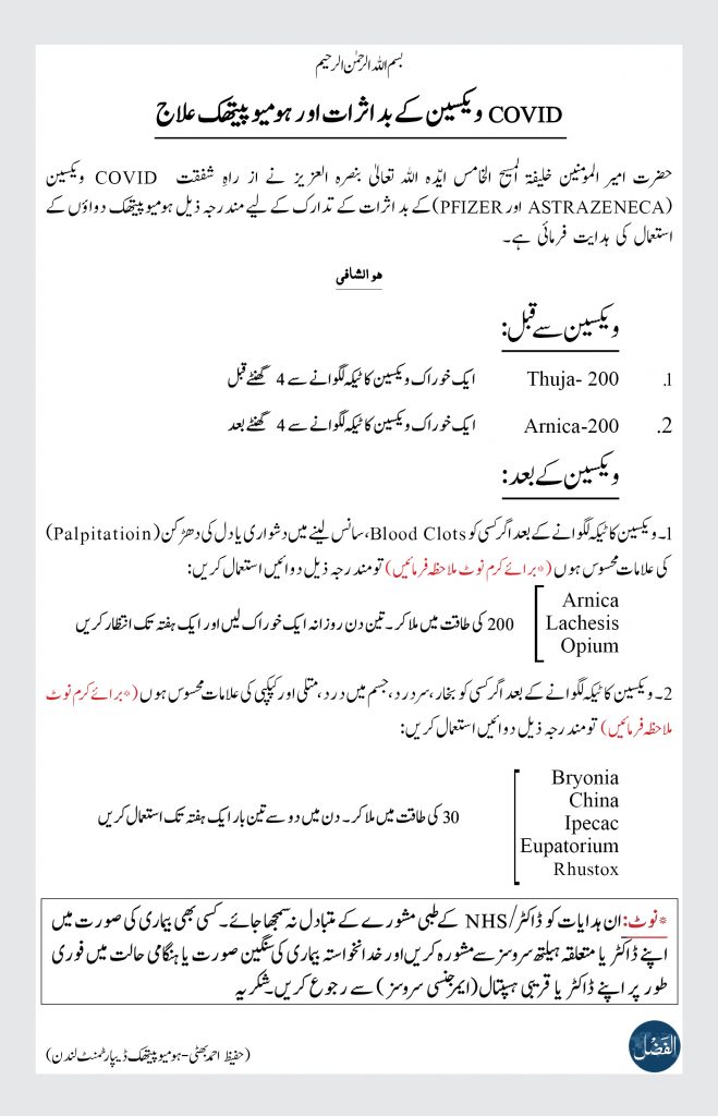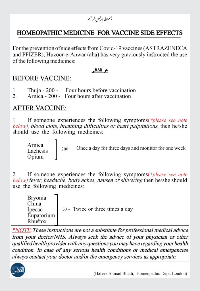 حضرت امیر المومنین خلیفۃ المسیح الخامس ایّدہ اللہ تعالیٰ بنصرہ العزیز نے از راہِ شفقت COVID ویکسین (ASTRAZENECA اور PFIZER) کے بد اثرات کے تدارک کے لیے مندرجہ ذیل ہومیوپیتھک دواؤں کے استعمال کی ہدایت فرمائی ہے۔ HOMEOPATHIC MEDICINE FOR VACCINE SIDE EFFECTS For the prevention of side effects from Covid-19 vaccines (ASTRAZENECA and PFIZER), Huzoor-e-Anwar (aba) has very graciously instructed the use of the following medicines: (حفیظ احمد بھٹی -ہومیوپیتھک ڈیپارٹمنٹ لندن)