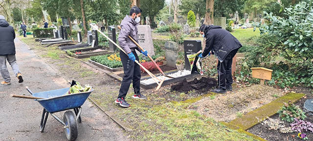سرزمین جرمنی حضرت مسیح موعود علیہ السلام کے زمانے میں احمدیت سے متعارف ہوگئی تھی اور حضورؑ کی زندگی میں جرمن خاتون کیرولائن نے 1907ء میں حضور کو خط لکھ کر اپنی عقیدت کا اظہار کر دیا تھا لیکن جماعت کے پہلے مبلغ مکرم مولانا مبارک علی صاحب نے ستمبر 1922ء میں سرزمین جرمنی پر قدم رکھے۔ اسی سرزمین پر پہلا احمدی بچہ حضرت ملک غلام فرید صاحب کے ہاں 22؍جنوری 1924ء کو برلن میں پیدا ہوا جس کا نام ملک منصور احمد رکھا گیا ۔ جرمنی سے سفر آخرت پر روانہ ہونے والے پہلے احمدی ڈاکٹر عبدالہادی کیوسی تھے جنہوں نے 8؍ جون 1973ء کو وفات پائی اور جن کو رائج الوقت قانون کے مطابق نور مسجد سے قریب ترین قبرستان Südfriedhof میں سپرد خاک کیا گیا۔ 16 سال بعد 7 نومبر1989ء کو جب ایک اور احمدی مکرم سلمان احمد خان کی وفات ہوئی تو مرحوم کے والد مکرم مسعود احمدصاحب دہلوی ایڈیٹر الفضل نے اس خواہش کا اظہار کیا کہ مرحوم کی قبر ڈاکٹر عبدالہادی کیوسی کی قبر سے قریب ترین جگہ پر بنائی جائے۔ لیکن رائج الوقت قانون سلمان احمد کی تدفین اس قبرستان میں کرنے میں حائل تھا۔ جرمنی میں اس وقت یہ قانون تھا کہ جس شخص کی رجسٹریشن جس علاقے میں ہو وہ اسی علاقے کے قبرستان میں دفن ہوگا۔ چنانچہ دعا اور کوشش کا سلسلہ شروع ہوا۔ انتظامیہ کے لیے یہ اچنبھے کی بات تھی کہ مردہ اس قبرستان میں نہیں اُس قبرستان میں دفن ہوگا ۔ درخواست گزار پُر امید تھے کہ میرے بیٹے کو ڈاکٹر کیوسی کے پہلو میں دفن کرنے کی اجازت مل جائے گی۔ چنانچہ عرش پر دعا سنی گئی اور خصوصی اجازت نامہ جاری ہوا۔ بعد کے آنے والے وقت میں یہ پابندی صوبوں تک محدود کر دی گئی اور پھر جلد یہ پابندی مکمل طور پر اٹھا لی گئی۔ اب تدفین کے لیے قبرستان کے چناؤ میں لواحقین کی خواہش کو مقدم جانا جاتا ہے اور اس سہولت سے فائدہ اٹھاتے ہوئے فرانکفرٹ سے باہر بھی احمدی لواحقین اپنے عزیزوں کی تدفین فرانکفرٹ کے اس قبرستان میں کر رہے ہیں۔ اس وقت یہاں 160 احمدی دفن ہیں جن میں سلسلہ کے خادمین مکرم مسعود احمد جہلمی صاحب، مکرم ہدایت اللہ ہبش صاحب، مکرم چودھری عبدالعزیز ڈوگرصاحب، مولانا فضل الہی انوری صاحب اور دیگر موصیان بھی شامل ہیں۔ جرمنی میں قبروں کی دیکھ بھال اور نگہداشت کا قانون بڑا سخت ہے۔ متعلقہ ادارہ قبروں کی حالت درست رکھنے پر نگاہ رکھتا ہے اور جہاں ضرورت محسوس کرے لواحقین کو خط لکھ کر توجہ دلانے سے نہیں چوکتا۔ تدفین کے بعد ایک مخصوص عرصہ میں قبر پر کتبہ لگانا بھی ضروری ہے۔ بعض احباب اور متعلقہ محکمہ کی طرف سے توجہ دلانے پر مکرم نیشنل امیر صاحب نے فرانکفرٹ جماعت کے لوکل امیر مکرم خواجہ مبشر احمد صاحب کو اس کی طرف توجہ دلائی۔ چنانچہ سیکرٹری امور عامہ لوکل امارت فرانکفرٹ مکرم احسن قدیر بھٹی صاحب نے قبرستان کا جائزہ لیا اور قابل توجہ قبروں کی تصاویر اتاری گئیں۔ دوسرے مرحلہ میں اکتوبر 2020ء میں انتظامیہ سے وقار عمل کی صورت میں قبروں کی درستگی کرنے کے لیے اجازت طلب کی گئی جو Covid- 19 کی وجہ سے نہ مل سکی۔ البتہ فروری 2021ء میں ایک بار پھر اجازت طلب کرنے پر انتظامیہ نے وقار عمل کی اجازت دے دی۔ چنانچہ تین خدام اور دو انصار بھائیوں نے مل کر وقار عمل کیا اور بیس قبروں کی حالت درست کی ۔ 13؍مارچ 2021ء کو ایک بڑا وقار عمل کیا گیا جس میں 19 خدام اور انصار نے حصہ لیا۔ وقار عمل کی پلاننگ مکرم احسن قدیر بھٹی صاحب سیکرٹری امور عامہ لوکل امارت فرانکفرٹ نے کی۔ بیس بیس کلو وزن کی چالیس عدد بوریاں مٹی و دیگر ضرورت کا سامان خریدا گیا۔ وقار عمل کے لیے مقررہ دن 13؍مارچ کو شدید سردی اور ہلکی پھوار کے باوجود 19 احباب جماعت بر وقت قبرستان پہنچ گئے۔ پہلے اجتماعی دعا ہوئی اور اس کے بعد پہلے سے تیار شدہ پلان کے مطابق وقار عمل کا کام شروع ہوگیا۔ تین تین افراد پر مشتمل ٹیمیں بنائی گئی تھیں اور ہر ٹیم کے ذمہ ایک لائن میں موجود قبروں کی درستگی کا کام سپرد تھا ۔ چنانچہ پچیس قبروں پر مٹی ڈال کر ان کو درست کیاگیا۔ اس کے بعد ناشتہ کے لیےوقفہ ہوا۔ ناشتہ نور مسجد سے خادم مسجد مکرم محمد ایوب صاح