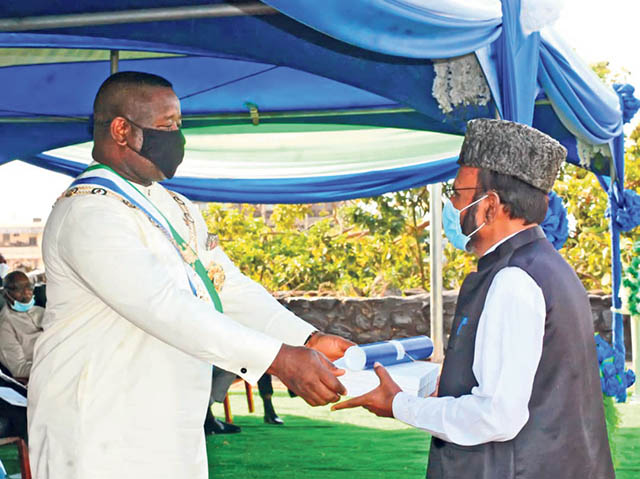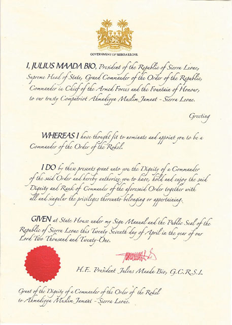 محترم امیر صاحب جماعت احمدیہ سیرالیون صدر مملکت سے اعزاز وصول کر رہے ہیں حکومتِ سیرالیون کی طرف سے احمدیہ مسلم جماعت کو ملک میں سو سالہ خدمات پر سیرالیون کے سب سے بڑے سِول اعزاز سے نوازا گیا۔ 27؍اپریل 1961ء کو مغربی افریقہ کے ملک سیرالیون کو برطانیہ کے قبضہ سے آزادی حاصل ہوئی اور یہ ایک مکمل خود مختار ریاست بن گیا۔ چنانچہ ہر سال سیرالیون میں 27؍اپریل یوم ِآزادی کے طور پر منا یا جاتا ہے اور سرکاری، نیم سرکاری اور نجی طور پر ملک بھر میں جشنِ آزادی کی تقریبات کا انعقاد کیا جاتا ہے۔ جشنِ آزادی کی وفاقی تقریبات کے انعقاد کے ساتھ حکومتِ سیرالیون اس دن ملک و قوم کی خاطر نمایاں خدمات سر انجام دینے والے افراد، محکموں، تنظیموں اور جماعتوں کو اعزازات سے نوازتی ہے۔ یہ سال سیرالیون کی آزادی کا 60 واں سال ہے اور اسی سال جماعتِ احمدیہ کو سیرالیون میں 100سال مکمل ہوئے ہیں۔ حکومت سیرالیون اور صدر مملکت عزت مآب ریٹائرڈ بریگیڈیر جولیئس مادا بیئو (H.E. Rtd. Brg. Julius Maada Bio) نے جماعت کی سو سالہ خدمات کے اعتراف میں اس سال نوازے گئے اعزازات میں احمدیہ مسلم جماعت سیرالیون کو ملک کے سب سے بڑے سِول اعزاز Commander of the Order of the Rokel سے نوازا۔ 27؍اپریل 2021ء کو ایوانِ صدر میں ہونے والی اس تقریب میں امیر و مشنری انچارج سیرالیون مولانا سعید الرحمٰن صاحب نے احمدیہ مسلم جماعت سیرالیون کی طرف سے یہ اعزاز وصول کیا۔ سیرالیون میں جماعت کی خدمات کا مختصر تذکرہ پیشِ خدمت ہے۔ جماعت احمدیہ کو یہ اعزاز حاصل ہے کہ اس نے 1938ء میں ملک کے پہلے مسلم پرائمری سکول روکوپر اور 1960ء میں پہلے مسلم سیکنڈری سکول بو کا اجرا کیا جس کے نتیجہ میں ملک کے مسلمانوں کو رائج الوقت تعلیم کے حصول میں آسانی ہوئی۔ اب تک سیرالیون میں جماعت احمدیہ 300 سے زائد سکولوں کا قیام کرچکی ہے جو کسی بھی مسلمان تنظیم کی طرف سے ملک بھر میں قائم کیے جانے والے سکولوں کی سب سے بڑی تعداد ہے۔ اس کے علاوہ ایک لمبے عرصہ سے جماعتی ہسپتال اور کلینک ملک میں ضرورت مند مریضوں کو معیاری اور سستے علاج کی سہولت مہیا کررہے ہیں۔ خدمتِ خلق کے میدان میں جماعت احمدیہ نے ملک کے دور دراز پسماندہ علاقوں میں کنویں کھدواکر اور نلکے لگوا کر لوگوں کو بسہولت صاف پانی مہیا کرنے میں کردار ادا کیاہے۔ خانہ جنگی، مٹی کے تودے گرنے، سیلابوں، ایبولا اور اب کورونا وائرس کی وبا میں جماعت احمدیہ ضرورت مند اور مستحق لوگوں کی خوراک، کپڑوں، ادویات اور رہائش میں مدد کررہی ہے۔ اس میں ایبولا میں یتیم ہونے والے پچاس بچوں کی مکمل ذمہ داری بھی شامل ہے۔ ملک بھر میں جماعت کی 1400 سے زائد مساجد خدائے واحد کی عبادت کے ساتھ ساتھ لوگوں کی علمی، عملی اور روحانی تربیت میں مصروف ہیں اور ملک میں مذہبی رواداری اور امن کے قیام میں اہم کردار ادا کررہی ہیں۔ احمدیہ جماعت کے تین ریڈیو ملک بھر میں لوگوں کی روحانی، عملی، اخلاقی تعلیم وتربیت میں ہمہ وقت مصروف ہیں۔ جماعت احمدیہ کی ملکی ترقی میں کاوشوں کا اندازہ اس بات سے بھی لگایا جا سکتا ہے کہ 2005ء سے اب تک ہونے والے سالانہ جلسہ جات میں ملک کے تین صدور اپنے دورِ صدارت میں باقاعدہ شرکت کرتے رہے ہیں۔ اور اس کے علاوہ نائب صدور، سابقہ نائب صدور، وزراء، سفارت کار، پیراماؤنٹ چیفس اور ملک کے اعلیٰ سطح کے عہدےدار جماعتی تقریبات میں شامل ہونے کو اپنے لیے باعثِ افتخار سمجھتے ہیں۔ 2019ء کے جلسہ سالانہ میں جماعتی خدمات کے اعتراف میں صدرِ مملکت نے اپنی تقریر میں امیر جماعت سیرالیون کو ملک میں ’انسانی بہبودو ترقی کا اعزازی سفیر’ قرار دیا تھا۔ اسی طرح 2020ء کے جلسہ سالانہ سیرالیون میں نائب صدر مملکت سیرالیون نے جلسہ سالانہ سیرالیون میں اپنی تقریر کے دوران جماعت احمدیہ کی تعلیمی خدمات کا ذکر کرتے ہوئے امیر جماعت احمدیہ کو وزیر تعلیم قرار دیا اور بارہا اس بیان کو دہرایا۔ اس سے قبل بھی 2014ء میں اس وقت کی حکومت نے جماعت احمدیہ کو ملک میں جماعتی خدمات کے اعتراف میں صدارتی گولڈ میڈل، نیشنل ایوارڈ سے نوازا تھا۔ دعا ہے کہ اللہ تعالی