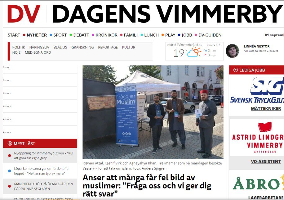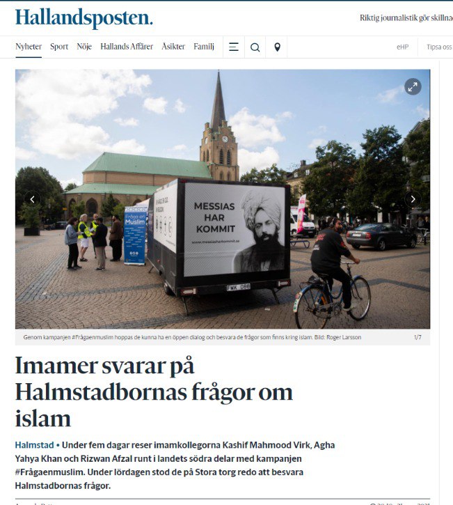 Listen to 20210921_sweden report byAl Fazl International on hearthis.at اللہ تعالیٰ کے فضل سے جماعت احمدیہ سویڈن کو ایک مرتبہ پھر ایک ہفت روزہ تبلیغی دورے کی توفیق ملی۔ الحمد للہ۔ مکرم آغا یحییٰ خان صاحب مبلغ انچارج سویڈن نے مکرم وسیم ظفر صاحب امیر جماعت سویڈن کے مشورے سے جنوب مشرقی سویڈن کے بعض شہروں میں تبلیغی سٹال لگانے کا پروگرام ترتیب دیا۔ اس دورے کا موضوع Ask a Muslim رکھا گیا اور اس موضوع پر ایک ٹینٹ تیار کیا گیا جس پر جلی حروف میں Ask a Muslim لکھا ہوا تھا اور ساتھ ہی بعض عناوین بھی لکھے گئے جو کہ عموماً میڈیا میں آتے رہتے ہیں۔ تاکہ لوگ ان موضوعات پر سوالات کر سکیں۔ اس تبلیغی دورے میں محترم مبلغ انچارج صاحب کے ہمراہ مکرم کاشف ورک صاحب مبلغ سلسلہ اور خاکسار (مبلغ سلسلہ) بھی تھے۔ یہ دورہ مورخہ 21؍ اگست تا 27 اگست 2021ء ہوا۔ سفرکا باقاعدہ آغاز 21؍اگست کی صبح گاتھن برگ سے ہوا۔ مکرم امیر صاحب نے سفر کے آغاز میں دعا کروائی۔ اس دورہ کے دوران کُل 2600 کلومیٹر کا سفر طے کیا گیا۔ اس سفر میں گاڑی کے پیچھے جماعتی کاروان نصب کیا گیاتھا جس پر حضرت مسیح موعود علیہ الصلوٰۃ والسلام کی بڑی تصویر، ’مسیح آگیا‘ کی سویڈش میں تحریر نیز جماعتی ویب سائٹ اور ماٹو ‘محبت سب کےلیے نفرت کسی سے نہیں’ نمایاں طور پر لکھا گیا ہے۔ اس سارے سفر کے دوران ہزاروں گاڑیاں اس کاروان کے پاس سے گزریں اور اس طرح ہزاروں لوگوں تک یہ پیغام پہنچا کہ جس موعود مسیح کا وہ انتظار کر رہے ہیں وہ آچکا ہے۔ لوکل پولیس کی اجازت سے اس کاروان کو 6 مختلف شہروں کی مرکزی شاہراہوں پر 5۔5 گھنٹوں کےلیے کھڑا کیا گیا اور زائرین سے گفتگو ہوئی۔ سٹالز پر اللہ کے فضل سے ایک بڑی تعداد میں مقامی لوگوں نے آکر اسلام کے بارے میں اپنے سوالات کے تسلی بخش جوابات پائے۔ بہت سے لوگوں نے اس بات کا اظہار کیا کہ ہمارے سے گفتگو کے بعد ان کا اسلام کے بارے میں جو نظریہ تھا وہ مثبت ہو گیا ہے اور ان کے خدشات دور ہو گئے ہیں۔ اکثر لوگوں نے جماعت کے اس اقدام اور مہم کو بہت اچھے الفاظ میں سراہا اور اس قسم کی مزید کوششوں کو جاری رکھنے کی درخواست کی۔ ان شہروں کے نام جہاں ہمارا تبلیغ سٹال لگا Halmstad، Växjö، Västervik، Nybro، Kalmar اور Karlskrona ہیں۔ اس دورے کے متعلق اطلاع متعلقہ علاقوں کےمیڈیا کے علاوہ لوکل سیاستدانوں اور عیسائی چرچوں کے سربراہان کو بھی دی گئی۔ دورے کے آغاز سےچند دن قبل خاکسار نےجنوب مشرقی سویڈن کے ایک شہر Sölvesborg میں تبلیغی سٹال لگایا۔ یہ شہر اسلام مخالف سب سے بڑی جماعت کا گڑھ ہے اور ان کاپارٹی لیڈر بھی اسی شہر سے ہے۔ اللہ کے فضل سے یہاں دو اخبارات نے خاکسار کا انٹرویو شائع کیا اور اس میں ہمارے تبلیغی دورے کے بارے میں بھی تفصیلات لکھیں۔ اسی طرح اس علاقے کے اسلام مخالف ایک پارلیمنٹ ممبر نے اخبار میں اپنا ایک مضمون شائع کیا جس میں اس نے اسلام مخالفت کا اظہار کیا تھا جس پر اسی اخبار میں مکرم مبلغ انچارج صاحب کا انٹرویو اس کے جواب میں شائع ہوا۔ جبکہ مکرم کاشف ورک صاحب کا جواباً مضمون بھی اس اخبار نے شائع کیا۔ اس اخبار کے ذریعہ بھی ہمارے دورے کی بات میڈیا میں آئی اور اس ممبر آف پارلیمنٹ کو ہم نےاس کے شہر میں دورے کے دوران منعقد ہونے والے اپنے تبلیغی سٹال Ask a Muslim پر آنے کی بھی دعوت دی تاکہ وہ ہم سے اپنے خدشات کے بارے میں سوالات کر سکے۔ اللہ تعالیٰ کے فضل سےدورہ کے دوران بھی لوکل میڈیا میں اس کی خوب تشہیر ہوئی۔ اس طرح کُل 11 اخباروں، دو ریڈیو سٹیشنز اور ایک ٹی وی چینل کے ذریعہ جماعت کا پیغام سارے علاقے میں پھیلا۔ اخبارات نے اپنے آن لائن شماروں میں بھی انٹرویوز شائع کیے اور پرنٹڈ (printed)اخبارا ت میں بھی تصاویر کے ساتھ انٹرویوز کو شائع کیا۔ بہت سے لوگ جماعت کے سٹال کی میڈیا پر خبر پڑھ کریا سن کر آئے تھے۔ Växjöکی لوکل اخبار میں آدھے صفحے کا ایک اشتہار بھی دورے کے دوران شائع کروایا گیا۔ اس میں حضرت مسیح موعودؑ کی ایک بڑی تصویر کے ساتھ جماعت کا ماٹو ’محبت سب کےلیے نفرت کسی سے نہیں‘ لکھا گیا۔ اس کے علاوہ اس شہر میں ہمارے سٹال کی جگہ اور وقت بھی درج کیے گئ