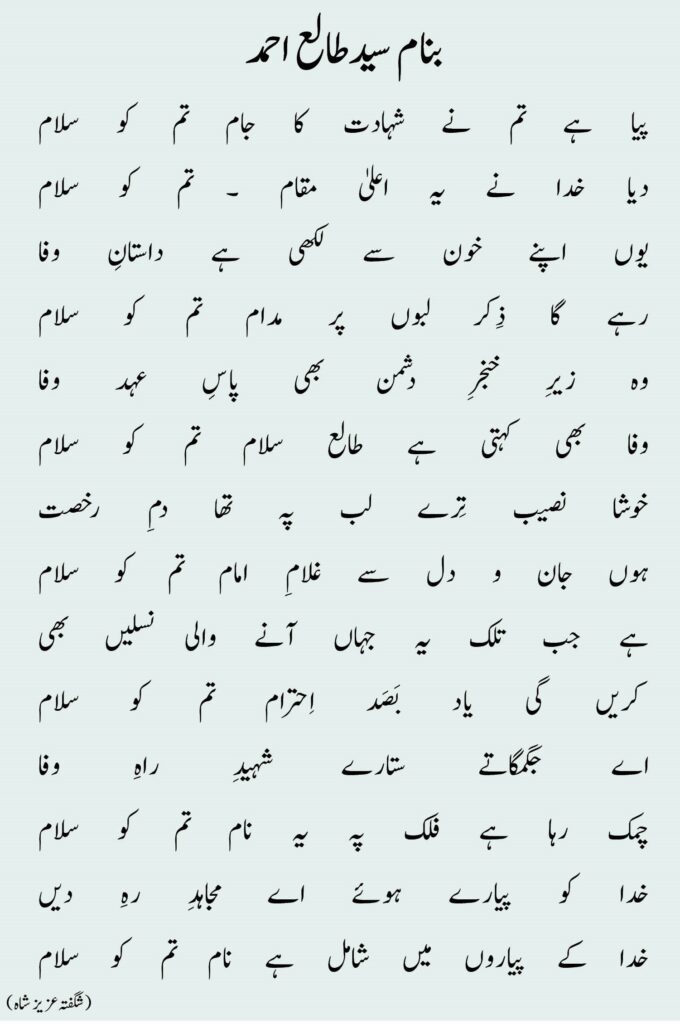 بنام سید طالع احمد Listen to 20211005_gazal binam syed tale ahmed byAl Fazl International on hearthis.at پیا ہے تم نے شہادت کا جام تم کو سلام دیا خدا نے یہ اعلیٰ مقام ۔ تم کو سلام یوں اپنے خون سے لکھی ہے داستانِ وفا رہے گا ذِکر لبوں پر مدام تم کو سلام وہ زیرِ خنجرِ دشمن بھی پاسِ عہد وفا وفا بھی کہتی ہے طالع سلام تم کو سلام خوشا نصیب تِرے لب پہ تھا دمِ رخصت ہوں جان و دل سے غلامِ امام تم کو سلام ہے جب تلک یہ جہاں آنے والی نسلیں بھی کریں گی یاد بَصَد اِحترام تم کو سلام اے جگمگاتے ستارے شہیدِ راہِ وفا چمک رہا ہے فلک پہ یہ نام تم کو سلام خدا کو پیارے ہوئے اے مجاہدِ رہِ دیں خدا کے پیاروں میں شامل ہے نام تم کو سلام (شگفتہ عزیز شاہ)