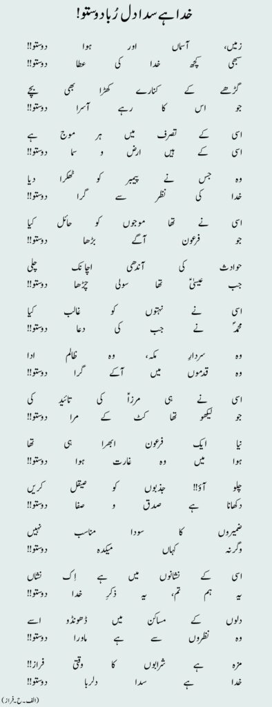 Listen to 20211012_GAZAL KHUDA HE SADA DILRUBA DOSTO byAl Fazl International on hearthis.at خدا ہے سدا دل رُبا دوستو! زمیں، آسماں اور ہوا دوستو!! سبھی کچھ خدا کی عطا دوستو!! گڑھے کے کنارے کھڑا بھی بچے جو اس کا رہے آسرا دوستو!! اسی کے تصرف میں ہر موج ہے اسی کے ہیں ارض و سما دوستو!! وہ جس نے پیمبر کو ٹھکرا دیا خدا کی نظر سے گرا دوستو!! اسی نے تھا موجوں کو حائل کیا جو فرعون آگے بڑھا دوستو!! حوادث کی آندھی اچانک چلی جب عیسیٰؑ تھا سولی چڑھا دوستو!! اسی نے نہتوں کو غالب کیا محمدؐ نے جب کی دعا دوستو!! وہ سردارِ مکہ، وہ ظالم ادا وہ قدموں میں آکے گرا دوستو!! اسی نے ہی مرزاؑ کی تائید کی جو لیکھو تھا کٹ کے مرا دوستو!! نیا ایک فرعون ابھرا ہی تھا ہوا میں وہ غارت ہوا دوستو!! چلو آؤ!! جذبوں کو صیقل کریں دکھانا ہے صدق و صفا دوستو!! ضمیروں کا سودا مناسب نہیں وگرنہ کہاں میکدہ دوستو!! اسی کے نشانوں میں ہے اِک نشاں یہ ہم تم، یہ ذکرِ خدا دوستو!! دلوں کے مساکن میں ڈھونڈو اسے وہ نظروں سے ہے ماورا دوستو!! مزہ ہے شرابوں کا وقتی فراز!! خدا ہے سدا دلربا دوستو!!