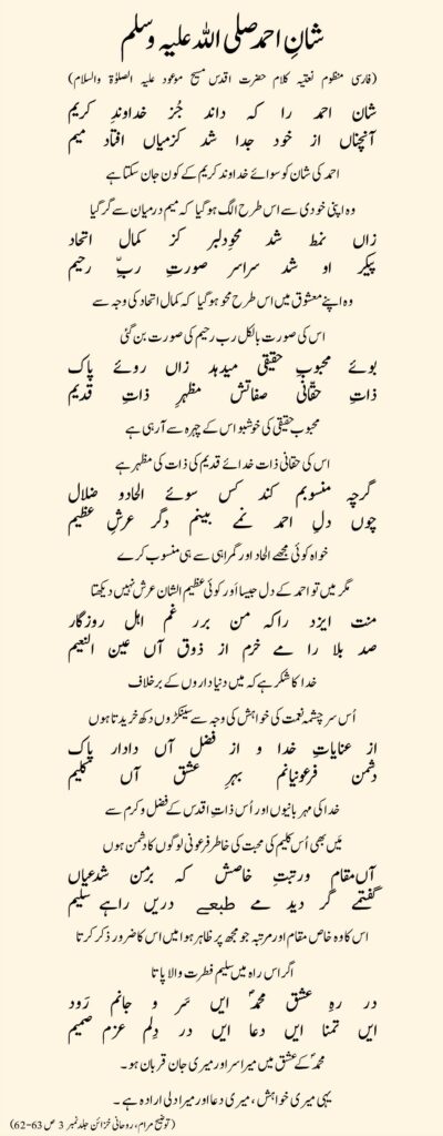 (فارسی منظوم نعتیہ کلام حضرت اقدس مسیح موعود علیہ الصلوٰۃ والسلام) شان احمد را کہ داند جُز خداوندِ کریم آنچناں از خود جدا شد کزمیاں افتاد میم احمد کی شان کو سوائے خداوند کریم کے کون جان سکتا ہے وہ اپنی خودی سے اس طرح الگ ہو گیا کہ میم درمیان سے گر گیا زاں نمط شد محوِدلبر کز کمال اتحاد پیکر او شد سراسر صورتِ ربِّ رحیم وہ اپنے معشوق میں اس طرح محو ہو گیا کہ کمال اتحاد کی وجہ سے اس کی صورت بالکل رب رحیم کی صورت بن گئی بوئے محبوبِ حقیقی میدہد زاں روئے پاک ذاتِ حقّانی صفاتش مظہرِ ذاتِ قدیم محبوب حقیقی کی خوشبو اس کے چہرہ سے آرہی ہے اس کی حقانی ذات خدائے قدیم کی ذات کی مظہر ہے گرچہ منسوبم کند کس سوئے الحادو ضلال چوں دلِ احمد نمے بینم دگر عرشِ عظیم خواہ کوئی مجھے الحاد اور گمراہی سے ہی منسوب کرے مگر میں تو احمد کے دل جیسا اَور کوئی عظیم الشان عرش نہیں دیکھتا منت ایزد راکہ من برر غم اہل روزگارصد بلا را مے خرم ازذوق آں عین النعیم خدا کا شکرہے کہ میں دنیا داروں کے برخلاف اُس سر چشمہ نعمت کی خواہش کی وجہ سے سینکڑوں دکھ خریدتا ہوں از عنایاتِ خدا و از فضل آں دادار پاک دشمن فرعونیانم بہرِ عشق آں کلیم خدا کی مہربانیوں اور اُس ذاتِ اقدس کے فضل و کرم سے مَیں بھی اُس کلیم کی محبت کی خاطر فرعونی لوگوں کا دشمن ہوں آںمقام ورتبتِ خاصش کہ برمن شدعیاں گفتمے گر دید مے طبعے دریں راہے سلیم اس کا وہ خاص مقام اور مرتبہ جو مجھ پر ظاہر ہوا میں اس کا ضرور ذکر کرتا اگراس راہ میں سلیم فطرت والا پاتا در رہِ عشق محمدؐ ایں سَر و جانم رَود ایں تمنا ایں دعا ایں در دِلم عزم صمیم محمدؐ کے عشق میں میرا سر اور میری جان قربان ہو۔ یہی میری خواہش ، میری دعا اور میرا دلی ارادہ ہے ۔ (توضیح مرام، روحانی خزائن جلد نمبر 3 ص 63-62)