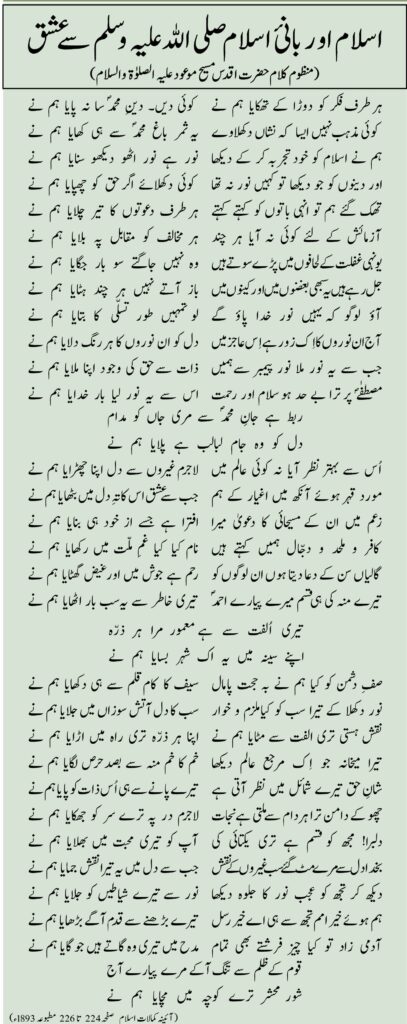 (منظوم کلام حضرت اقدس مسیح موعود علیہ الصلوٰۃ والسلام) ہر طرف فکر کو دوڑا کے تھکایا ہم نے کوئی دیں۔ دینِ محمدؐ سا نہ پایا ہم نے کوئی مذہب نہیں ایسا کہ نشاں دکھلاوے یہ ثمر باغ محمدؐ سے ہی کھایا ہم نے ہم نے اسلام کو خود تجربہ کر کے دیکھا نور ہے نور اٹھو دیکھو سنایا ہم نے اور دینوں کو جو دیکھا تو کہیں نور نہ تھا کوئی دکھلائے اگر حق کو چھپایا ہم نے تھک گئے ہم تو انہی باتوں کو کہتے کہتے ہر طرف دعوتوں کا تیر چلایا ہم نے آزمائش کے لئے کوئی نہ آیا ہر چند ہر مخالف کو مقابل پہ بلایا ہم نے یونہی غفلت کے لحافوں میں پڑے سوتے ہیں وہ نہیں جاگتے سو بار جگایا ہم نے جل رہے ہیں یہ سبھی بغضوں میں اورکینوں میں باز آتے نہیں ہر چند ہٹایا ہم نے آؤ لوگو کہ یہیں نور خدا پاؤ گے لو تمہیں طور تسلّی کا بتایا ہم نے آج ان نوروں کا اِک زور ہے اِس عاجز میں دل کو ان نوروں کا ہر رنگ دلایا ہم نے جب سے یہ نور ملا نور پیمبر سے ہمیں ذات سے حق کی وجود اپنا ملایا ہم نے مصطفٰےؐ پر ترا بے حد ہو سلام اور رحمت اس سے یہ نور لیا بار خدایا ہم نے ربط ہے جانِ محمدؐ سے مری جاں کو مدام دل کو وہ جام لبالب ہے پلایا ہم نے اُس سے بہتر نظر آیا نہ کوئی عالم میں لاجرم غیروں سے دل اپنا چھڑایا ہم نے مورد قہر ہوئے آنکھ میں اغیار کے ہم جب سے عشق اس کاتہِ دل میں بٹھایا ہم نے زعم میں ان کے مسیحائی کا دعویٰ میرا افترا ہے جسے از خود ہی بنایا ہم نے کافر و ملحد و دجّال ہمیں کہتے ہیں نام کیا کیا غمِ ملّت میں رکھایا ہم نے گالیاں سن کے دعا دیتا ہوں ان لوگوں کو رحم ہے جوش میں اور غیض گھٹایا ہم نے تیرے منہ کی ہی قسم میرے پیارے احمدؐ تیری خاطر سے یہ سب بار اٹھایا ہم نے تیری اُلفت سے ہے معمور مرا ہر ذرّہ اپنے سینہ میں یہ اک شہر بسایا ہم نے صفِ دشمن کو کیا ہم نے بہ حجت پامال سیف کا کام قلم سے ہی دکھایا ہم نے نور دکھلا کے تیرا سب کو کیاملزم و خوار سب کا دل آتش سوزاں میں جلایا ہم نے نقش ہستی تری الفت سے مٹایا ہم نے اپنا ہر ذرّہ تری راہ میں اڑایا ہم نے تیرا میخانہ جو اِک مرجع عالم دیکھا خم کا خم منہ سے بصد حرص لگایا ہم نے شانِ حق تیرے شمائل میں نظر آتی ہے تیرے پانے سے ہی اُس ذات کو پایا ہم نے چھو کے دامن ترا ہر دام سے ملتی ہے نجات لاجرم در پہ ترے سر کو جھکایا ہم نے دلبرا! مجھ کو قسم ہے تری یکتائی کی آپ کو تیری محبت میں بھلایا ہم نے بخدادل سے مرے مٹ گئے سب غیروں کے نقش جب سے دل میں یہ تیرا نقش جمایا ہم نے دیکھ کر تجھ کو عجب نور کا جلوہ دیکھا نور سے تیرے شیاطیں کو جلایا ہم نے ہم ہوئے خیر امم تجھ سے ہی اے خیر رسل تیرے بڑھنے سے قدم آگے بڑھایا ہم نے آدمی زاد تو کیا چیز فرشتے بھی تمام مدح میں تیری وہ گاتے ہیں جو گایا ہم نے قوم کے ظلم سے تنگ آکے مرے پیارے آج شور محشر ترے کوچہ میں مچایا ہم نے (آئینہ کمالات اسلام صفحہ224 تا 226 مطبوعہ 1893ء)