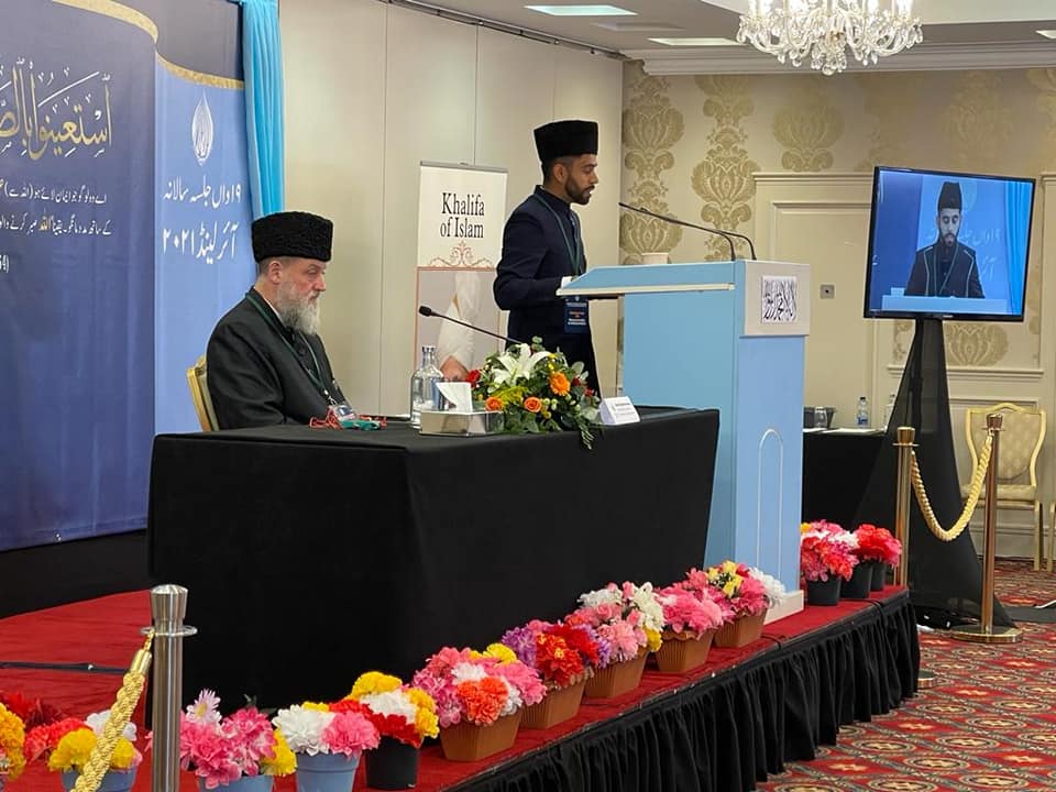 ٭…حضرت خلیفۃ المسیح الخامس ایّدہ اللہ تعالیٰ بنصرہ العزیز کا خصوصی پیغام ٭…با جماعت نماز تہجد، علما کرام کی ایمان افروز تقاریر، اسلامی اخوت کا نمونہ محض اللہ تعالیٰ کے فضل اور حضور انور کی دعاؤں سے جماعت احمدیہ آئرلینڈ کو اپنا انیسویں جلسہ سالانہ مورخہ 3اکتوبر 2021ء بروز اتوار Glen Royal Hotel، Maynooth میں منعقد کرنے کی توفیق ملی۔ گزشتہ سال کورونا وائرس کی وجہ سے جلسہ سالانہ کا انعقاد نہیں ہو سکا اور امسال حضور انور ایدہ اللہ تعالیٰ کی اجازت سےحکومتی پابندیوں کو ملحوظ خاطر رکھ کر چھوٹے پیمانے پر جلسہ کا اہتمام کیا گیا۔ نیز وہ افرادِ جماعت جو پابندیوں کے باعث جلسہ میں شرکت نہیں کرسکتے تھے ان کے لئے اردو اور انگریزی زبان میں live stream کی سہولت مہیا کی گئی تھی۔ معائنہ انتظامات جلسہ سالانہ جلسہ سے ایک دن قبل مورخہ 2اکتوبر 2021ء بروز ہفتہ صبح 10 بجے جلسہ سائٹ پر وقار عمل کا اہتمام کیا گیا جس میں 35کارکنان نے حصہ لیا۔ دوران وقار عمل دوپہر دو بجے خاکسار نے ظہر و عصر کی نماز پڑھائی جس کے معاً بعد سب کارکنان کی خدمت میں دوپہر کا کھانا پیش کیا گیا۔ شام 5 بجے افسر جلسہ سالانہ،مکرم فضل بٹ صاحب نے نیشنل صدر جماعت آئرلینڈ مکرم ڈاکٹر محمد انور ملک صاحب کو جلسہ سالانہ کے انتظامات کا معائنہ کروایا اور ناظمین و معاونین کا تعارف کروایا۔ تمام انتظامات کا جائزہ لیتے ہوئے نیشنل صدر صاحب نے نائب افسران اور ناظمین کو ہدایات دیں۔ انتظامات کے معائنہ کے بعد نیشنل صدر صاحب کی صدارت میں ایک مختصر تقریب ہوئی جس میں حافظ اختر رشید صاحب نے تلاوت ِقرآن کریم مع ترجمہ پیش کیا اور عزیزم روحان ملک صاحب نے ایک اردو نظم پیش کی۔ بعد ازاں نیشنل صدر صاحب نے اپنے مختصر خطاب میں جہاں شاملین جلسہ کا ہر طرح سے خیال رکھنے کی تلقین کی وہاں کورونا وائرس کے بداثرات کا ذکر کرتے ہوئے بتایا کہ خدا تعالیٰ کے فضل سے افراد جماعت کافی حد تک ان بد اثرات سے محفوظ رہے۔ جماعت کے پروگرام آن لائن جاری رہے اور افراد جماعت آن لائن ملاقاتوں کی صورت میں حضرت خلیفۃ المسیح ایدہ اللہ تعالیٰ بنصرہ العزیز کے دیدار اور آپ کی زرّیں ہدایات سے مستفید ہوتے رہے۔ الحمد للہ۔ اس کے بعد آپ نے دعا کروائی۔ بعد ازاں سب نے مشنری انچارج آئرلینڈ،مکرم ابرہیم نونن صاحب کی اقتداء میں نماز مغرب اور عشاء ادا کیں جس کے بعد سب کارکنان کی خدمت میں شام کا کھانا پیش کیا گیا۔ جلسہ کا آغاز مورخہ 3 اکتوبر بروز اتوار بیت الاحدمشن ہاؤس ڈبلن میں تہجد کی نماز کا اہتمام کیا گیا جو حافظ اختر رشید صاحب نے پڑھائی۔ نماز فجر کی آدائیگی کے بعد درس القرآن دیا گیا۔ اور دوسرے علاقوں سے آئے ہوئے کارکنان کی خدمت میں ناشتہ پیش کیا گیا۔ جلسہ سالانہ کا باقاعدہ آغاز صبح 9:45 پرچم کشائی کی تقریب سے ہوا۔ ہوٹل کے بیرون حصہ میں اس تقریب کا اہتمام کیا گیا۔ نیشنل صدر صاحب نے لوائے احمدیت جبکہ مشنری انچارج صاحب نے آئرلینڈ کا جھنڈا لہرایا۔ بعد ازاں صدر صاحب نے دُعا کروائی۔ ان پرچموں کے چاروں اطراف آئرلینڈ کے چار صوبوں کے جھنڈے بھی نصب کئے گئے تھے جو سارے صوبوں سے نمائندگی کی عکاسی کرتے ہیں۔ افتتاحی اجلاس افتتاحی اجلاس کی صدارت مکرم مشنری انچارج صاحب نے کی جو صبح دس بجے شروع ہوا۔ اس اجلاس کی کارروائی کا آغاز تلاوتِ قرآن کریم سے ہوا جو کہ حافظ اختر رشید صاحب نے پیش کی۔ بعد ازاں مکرم فراز طاہر صاحب نے دُرِ ثمین سے حضرت مسیح موعود علیہ الصلوٰ ۃ و السلام کے چند منتخب اشعار خوش الحانی سے پڑھ کر سنائے۔ سب سے پہلی تقریر ’’حضرت مسیح موعودؑ کی بعثت کی غرض‘‘ کے عنوان پر نیشنل سیکرٹری نومبائعین، مکرم یوسف پینڈر صاحب نے انگریزی زبان میں کی۔ اس کے بعد ’’مالی قربانی عصرِحاضر کا جہاد‘‘ کے عنوان پر مکرم ڈاکٹر حامد خان صاحب صدر مجلس خدام الاحمدیہ آئرلینڈ نے اردو زبان میں تقریر کی۔ اس اجلاس کی آخری تقریر خاکسار نے ’’میرے صحابہ ستاروں کی طرح ہیں اُن میں سے جس کی بھی تم پیروی کرو گے ہدایت پاؤ گے‘‘ کے عنوان سے انگریزی زبان میں کی جس کے ساتھ پہلا