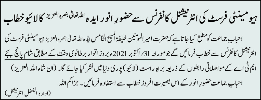 احبابِ جماعت کو مطلع کیا جاتا ہے کہ حضرت امیر المومنین خلیفۃ المسیح الخامس ایّدہ اللہ تعالیٰ بنصرہ العزیز ہیومینٹی فرسٹ کی انٹرنیشنل کانفرنس سے خطاب فرمائیں گےجو مورخہ 31؍ اکتوبر 2021ء بروز اتوار برطانوی وقت کے مطابق شام پانچ بجے ایم ٹی اے کے مواصلاتی رابطوں کے ذریعہ براہِ راست (لائیو)پوری دنیا میں نشر کیا جائے گا۔ (ان شاء اللہ العزیز) احبابِ جماعت حضورِ انور کے اس بصیرت افروز خطاب سے استفادہ فرمائیں۔ جزاکم اللہ ٭…٭…٭