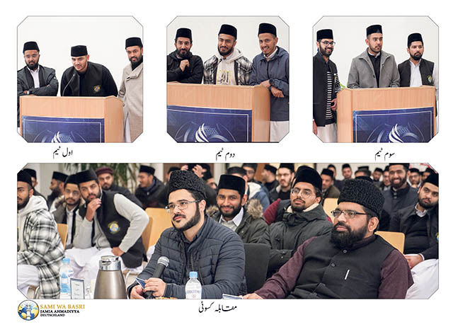 اللہ تعالیٰ کے فضل سے جامعہ احمدیہ جرمنی کے سال 22-2021ء کا ستمبر سے آغاز ہو چکا ہے۔ مجلسی علمی، مجلس ارشاد اور مجلس العاب کے تحت مختلف پروگراموں کا انعقاد جاری ہے۔ مورخہ20 اکتوبر 2021ء کو مجلس علمی کے تحت ’’مقابلہ کسوٹی‘‘ کا انعقاد ہوا۔ مقابلہ کا آغاز تلاوت قرآن کریم سے ہوا جو عزیزم سید اعتزاز شاہ نے کی۔ بعد ازاں عزیزم رضوان اللہ سندھو نے مقابلہ کے قواعد پڑھ کر سنائے۔ آج کے اس مقابلہ میں کل 10ٹیموں نے حصہ لیا۔ ہر ٹیم تین طلبہ پر مشتمل تھی۔ مطلوبہ جواب تک پہنچنے کے لیے ہر ٹیم کو 20سوالات 4منٹ کے اندر اندر کرنے کی اجازت تھی۔ اس مقابلہ میں جو ٹیم جتنے کم وقت اور کم سوالات میں منصفین کے سوچے ہوئے جواب کو صحیح بوجھ لے پوزیشن کی حق دار ہوتی ہے ۔ بہت اچھا مقابلہ ہوا۔ اس مقابلہ میں اول ٹیم عزیزان رانا توصیف، عدنان بشارت جنجوعہ اور معین احمد کی قرار پائی۔ دوسری پوزیشن عزیزان عمر رشید ،فرخ خرم اور ماہد حسین کی ٹیم نے جبکہ تیسری پوزیشن عزیزان ادیب بٹ، عبدالباری سمیع اور سلطان سمیع کی ٹیم نے حاصل کی۔ مقابلہ کے اختتام پر مکرم شمس اقبال صاحب نے نتائج کا اعلان کیا اور دعا کے ساتھ اس مقابلہ کا اختتام ہوا۔