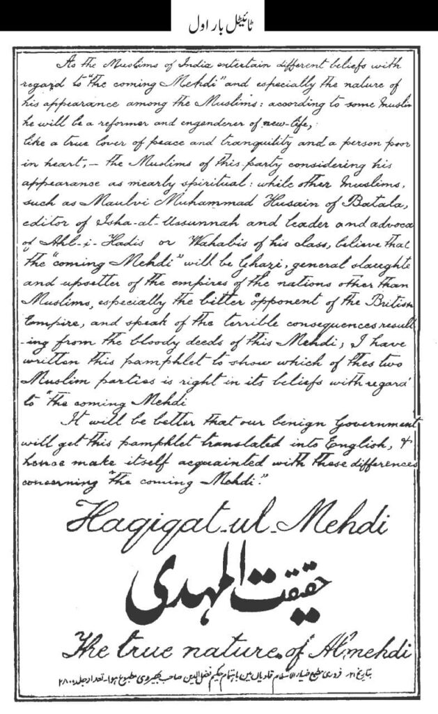 اس میں انگریزی حکومت کی مذہبی رواداری اور مذہبی آزادی جو سب مذاہب کو یکساں طور پر مہیا تھی ، کا ذکر کرکے صلیبی عقیدےکی نہایت احسن رنگ میں تردید فرمائی Listen to 20211203_haqeeqatul mahdi byAl Fazl International on hearthis.at تعارف یہ رسالہ 24؍اگست 1899ء کو شائع ہوا ۔اس رسالے میں حضرت اقدس مسیح موعود علیہ السلام نے اسی مضمون کا اعادہ کیاہے جو تحفہ قیصریہ میں لکھا تھا اور یہ اسی رسالے کی یاددہانی ہے۔اس میں انگریزی حکومت کی مذہبی رواداری اور مذہبی آزادی جو سب مذاہب کو یکساں طور پر مہیا تھی ، کا ذکر کرکے صلیبی عقیدےکی نہایت احسن رنگ میں تردید فرمائی گئی ہے اور حضرت اقدسؑ نے اپنا دعویٰ مسیح موعود پیش فرمایا ہے۔ مضامین کا خلاصہ اس کتاب کا ٹائیٹل پیج انگریزی زبان میں ہے جس میں اس رسالے کو جلد انگریزی زبان میں ترجمہ کرنے کا وعدہ کیا گیاہے تاکہ حکومت برطانیہ آنے والے مہدی کے متعلق عقائد کو خوب اچھی طرح سمجھ سکے۔ فرمایا: ’’سب سے پہلے یہ دعا ہے کہ خدائے قادر مطلق اس ہماری عالیجاہ قیصرہ ہند کی عمر میں بہت برکت بخشے اور اقبال اور جاہ جلال میں ترقی دے…اس عاجز کو بوجہ اس معرفت اور علم کے جو اس گورنمنٹ عالیہ کے حقوق کی نسبت مجھے حاصل ہے …وہ اعلیٰ درجہ کا اخلاص اور محبت اور جوش اطاعت حضور ملکہ معظمہ اور اس کے معزز افسروں کی نسبت حاصل ہے …اسی محبت اور سچی اخلاص کی تحریک سے جشن شصت سالہ جوبلی کی تقریب پر میں نے ایک رسالہ تالیف کرکے تحفہ قیصریہ کے نام سے موسوم کرکے ممدوحہ کی خدمت میں بطور تحفہ ارسال کیا تھا…مگر مجھے نہایت تعجب ہے کہ ایک کلمہ شاہانہ سے بھی ممنون نہیں کیا گیا۔لہٰذا اس حسن ظن نے جو میں ملکہ معظمہ کی خدمت میں رکھتا ہوں دوبارہ مجھے مجبور کیا کہ میں اس تحفہ یعنی تحفہ قیصریہ کی طرف ممدوحہ کو توجہ دلاؤں۔ اسی غرض سے یہ عریضہ روانہ کرتا ہوں۔‘‘ بعد ازاں حضور علیہ السلام نے اپنا خاندانی تعارف مفصل پیش فرمایا۔ جس میں آپ کا معزز خاندان مغلیہ میں سے ہونا، آپ کے بزرگوں کا ایک خود مختار ریاست کا ولی ہونا، پھر حضورؑ کے پر دادا صاحب مرزا گل محمد صاحب کے متعلق دہلی کے چغتائی بادشاہوں کی سلطنت کی کمزوری کے وقت بعض وزراء نے کوشش کی کہ انہیں دہلی کے تخت پر بٹھایا جائے، بعد ازاں سکھوں نے اس خاندان پر سختیاں کیں، ان کے بزرگ تمام دیہات ریاست سے بے دخل کر دیے گئے، پھر انگریز حکومت کے آنے پر ایک نعمت حاصل ہوئی اور گویا جواہرات کا خزانہ ہاتھ لگ گیا۔ اس لیے انہوں نے ایام غدر 1857ء میں پچاس گھوڑے مع سواران بہم پہنچا کر سرکار انگریز ی کو بطور مدد دیے۔پھر اس عاجز کے حق میں یہ خدمت آئی کہ میں نے پچاس ہزار کے قریب کتابیں اور رسائل اور اشتہارات چھپو اکر اس ملک اور نیز دوسرے بلاد اسلامیہ میں اس مضمون کے شائع کیے کہ گورنمنٹ انگریزی ہم مسلمانوں کی محسن ہے ۔ اور یہ کتابیں میں نے مختلف زبانوں یعنی اردو، فارسی اور عربی میں تالیف کرکے اسلامی ممالک میں پھیلا دیں۔ جس کا نتیجہ یہ ہوا کہ لاکھوں انسانوں نے جہاد کے غلط خیالات چھوڑ دیے۔ میرے خیال میں یہ غیر ممکن ہے کہ میرے جیسے دعا گو کا عاجزانہ تحفہ حضور ملکہ معظمہ کی خدمت میں پیش ہوتا اور جواب نہ آتا بلکہ ضرور آتا ۔ اس لئے مجھے بطور یاددہانی کے عریضہ لکھنا پڑا۔ پھر فرمایا: ’’میں اپنی عالی شان جناب ملکہ معظمہ قیصرہ ہند کی عالی خدمت میں اس خوشخبری کو بھی پہنچانے کے لئے مامور ہوں کہ جیساکہ زمین پر …اللہ تعالیٰ نے کمال رحمت اور کمال مصلحت سے ہماری قیصرہ کی سلطنت کو اس ملک اور دیگر ممالک میں قائم کیا ہے تاکہ زمین کو عدل اور امن سے بھرے ایسا ہی آسمان سے ارادہ فرمایا ہے کہ اپنی طرف سے اور غیب سے اور آسمان سے کوئی ایسا روحانی انتظام قائم کرے جو حضور ملکہ معظمہ کے دلی اغراض کو مدد دے۔ سو اس نے اپنے قدیم وعدہ کے موافق جو مسیح موعود کے آنے کی نسبت تھا آسمان سے مجھے بھیجا ہے۔‘‘ پھر فرمایا: ’’اے قیصرہ مبارکہ خدا تجھے سلامت رکھے۔ …تیرے عہد سلطنت میں جو نیک نیتی کے نور سے بھرا ہوا ہے مسیح موعود کا آنا خدا کی طرف سے یہ گواہی ہے کہ تمام سلاطین 