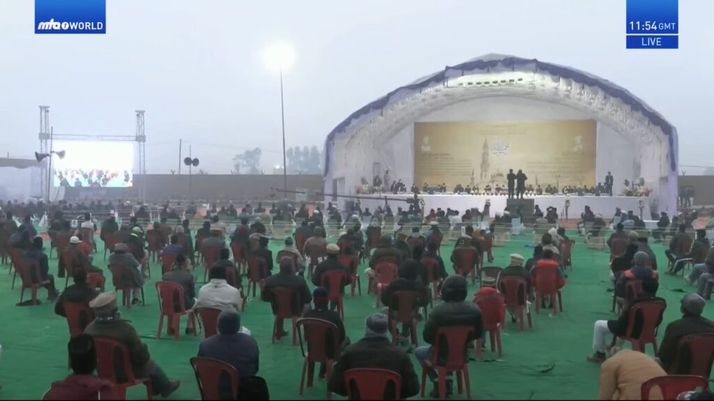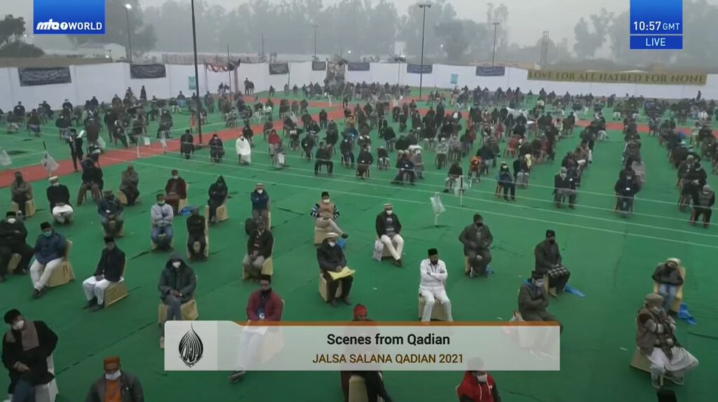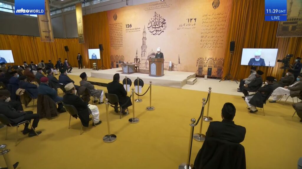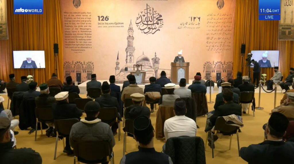 (اسلام آباد، ٹلفورڈ، یوکے، 26؍دسمبر 2021ء، نمائندہ الفضل انٹرنیشنل) جماعت احمدیہ مسلمہ عالمگیر کا 126واں جلسہ سالانہ بانی جماعت احمدیہ حضرت اقدس مرزا غلام احمد قادیانی مسیح موعود علیہ الصلوٰۃ والسلام کی مقدس بستی قادیان دارالامان میں 24، 25و 26دسمبر 2021ء کو اپنی تمام تر عظیم الشان اسلامی روایات کے ساتھ بخیروخوبی منعقد ہوا جس میں 6 ہزار کے قریب افراد نے شمولیت کی سعادت پائی۔ قادیان دارالامان میں منعقد ہونے والا یہ جلسہ اُس وقت ایک عالمگیرصورت اختیار کر گیا جب امیرالمومنین حضرت خلیفۃالمسیح الخامس ایدہ اللہ تعالیٰ بنصرہ العزیز کی بابرکت صدارت میں ایوان مسرور، اسلام آباد سے ایم ٹی اے کے مواصلاتی رابطوں کے ذریعہ اس جلسہ کی اختتامی کارروائی تمام عالم میں براہ راست نشر ہوئی۔ اختتامی اجلاس کی کارروائی کے لیے حضورِ انور ایّدہ اللہ تعالیٰ بنصرہ العزیز 10بج کر 31منٹ پر ایوان مسرور، اسلام آباد میں رونق افروز ہوئے۔حضور انور ایدہ اللہ تعالیٰ بنصرہ العزیز نے تمام شاملین کو السلام علیکم و رحمۃ اللہ کا تحفہ پیش فرمایا۔ اجلاس کا باقاعدہ آغاز تلاوتِ قرآن کریم سے ہوا جس کی سعادت مکرم محمود احمد وردی صاحب کو حاصل ہوئی۔ آپ نے سورت آل عمران کی آیات 20تا 23کی تلاوت کی اور ان آیات کا اردو ترجمہ از تفسیر صغیر پیش کیا۔ بعد ازاں مکرم عمر شریف صاحب نے حضرت اقدس مسیح موعود علیہ الصلوٰۃ والسلام کی نظم اسلام سے نہ بھاگو راہِ ہدیٰ یہی ہے اے سونے والو جاگو شمس الضّحیٰ یہی ہے کے چند اشعار مترنّم آواز میں پڑھے۔ 10 بج کر 48 منٹ پر اس جلسہ سالانہ کا وہ مبارک لمحہ آیا جب قادیان اور اسلام آباد یوکے سے بلند ہونے والے پُر جوش نعروں کے بعد امیرالمومنین حضرت خلیفۃالمسیح الخامس ایدہ اللہ تعالیٰ بنصرہ العزیز نے اپنے خطاب کا آغاز فرمایا۔ تشہد، تعوذ اور سورت فاتحہ کی تلاوت کے بعد حضور انور ایدہ اللہ تعالیٰ بنصرہ العزیز نے فرمایا: آج قادیان کے جلسہ سالانہ کا آخری سیشن ہے۔ اسی طرح افریقہ کے ایک ملک گنی بساؤ میں بھی جلسہ ہو رہا ہے۔ انہوں نے بھی درخواست کی تھی کہ ہمیں بھی شامل کر لیں۔ اللہ تعالیٰ کے فضل سے ان جلسے کے دنوں میں اور بھی ملک ہیں جہاں جلسے ہوں گے اور ہو رہے ہیں۔ بہر حال قادیان کے جلسے کے ساتھ کیونکہ ان کا جلسہ بھی تھا اس لیے ان کا ذکر ہو گیا ہے۔ اس کے بعد اپنےخطاب کے مضمون کو بیان کرتے ہوئے حضور انور نے فرمایا کہ ہم یہ دعویٰ کر تے ہیں کہ اسلام کی تعلیم ہی اپنی اصلی حالت میں ہونے کی وجہ سےوہ تعلیم ہے جو خوبصورت معاشرہ قائم کرنے کے لیےاعلیٰ ترین تعلیم ہے۔ یہی وہ تعلیم ہے کہ اگر اس پر عمل کیا جائےتو خدا تعالیٰ کے قریب بھی کرتی ہے اور پھر اس قرب کی وجہ سےاور خدا تعالیٰ کی رضا حاصل کرنے کی خواہش اور کوشش کی وجہ سےایک حقیقی مسلمان کوایک دوسرے کے حقوق ادا کرنے کی طرف ایسی راہنمائی کرتی ہے جو بے مثال ہے۔یہ حقوق کی ادائیگی ہےجو معاشرے کے امن و سلامتی کی بھی ضمانت ہے۔ آج کل امن و سلامتی کی باتیں ہوتی ہیں کہ کس طرح امن و سلامتی پیدا کی جائے۔ حالیہ وبا کے حوالہ سے حضور انور نے فرمایا کہ اس نے دلوں کی کدورتیں دور نہیں کیں۔ اللہ تعالیٰ کی اس وارننگ سے انسان کوئی سبق حاصل نہیں کر رہا۔ اگر یہی رویہ رہا تو بڑے خطر ناک نتائج پیدا ہوں گے۔ آج میں اسلام کی امن کی تعلیم کے چند پہلو بیان کروں گا۔ اگر ان پر عمل ہو تو دنیا امن و سلامتی کا گہوارا بن سکتی ہے۔ حضور انور نے مذہبی رواداری کو قائم رکھنے کے بارے میں فرمایا کہ گو دنیا مذہب سے دور ہو رہی ہے لیکن پھر بھی ایک ایسا طبقہ ہے جو مذہب کے حوالے سے دوسرے مذہب کو اعتراض کا نشانہ بناتا ہے۔ اسلام کہتا ہے کہ ایک دوسرے مذہب کے بانی کو غلط کہہ کر اس پر الزام نہ لگاؤ۔ اسلام یہ کہتا ہے کہ وہ آخری مذہب ہے لیکن یہ نہیں کہتا ہے کہ باقی مذہب جھوٹے تھے۔ اسلام کہتا ہے کہ ہر قوم میں نبی آئے۔ قرآن کریم کی آیت وَ اِنۡ مِّنۡ اُمَّۃٍ اِلَّا خَلَا فِیۡہَا نَذِیۡرٌ (فاطر:25) کی روشنی میں حضور انور نے فرمایا کہ ایک مسلمان حضرت عیسیٰ کو حضرت موسی