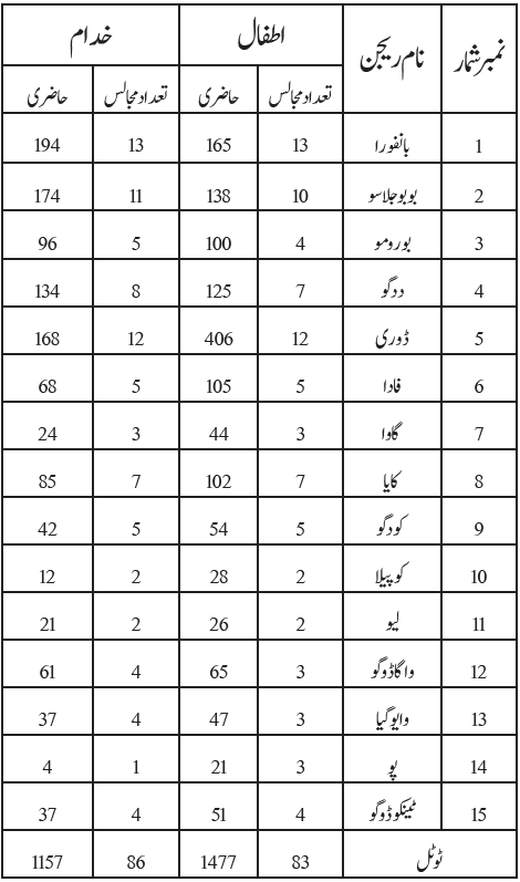 Listen to 20220211_Burkina Faso report byAl Fazl International on hearthis.at ہر سال دنیا بھر میں ماہ دسمبر کا آخری عشرہ کرسمس اور نئے سال کی تقریبات وغیرہ میں گزرتا ہے اور عید کا سا ساماں ہوتا ہے اور طلباء کو بھی چھٹیاں ہوتی ہیں اس موقع سے فائدہ اٹھاتے ہوئے برکینافاسو میں ماہ دسمبر کا آخر ہر سال ذیلی تنظیموں کے سالانہ اجتماعات کے لیے مختص ہوتا ہے لیکن اس سہ روزہ سالانہ اجتماع کی تیاری بہت پہلے شروع ہو جاتی ہے۔ ریجنل لیول پر خدام اور اطفال کی تربیتی کلاسزز بھی اس سلسلہ کی ایک کڑی ہے۔ امسال مجلس خدام الاحمدیہ اوراطفال الاحمدیہ برکینافاسو نے ملک بھر کے تمام ریجنز میں ریجنل تربیتی کلاسزز برائے خدام و اطفال ایک ہی تاریخ پر شروع اور ختم کرنے کا انعقاد کیا جس کا دورانیہ ایک ہفتہ رہا۔ ریجن میں جہاں جہاں جماعتی مساجد ہیں وہاں مسجد میں تربیتی کلاسز منعقد کی گئیں اور درس و تدریس کے لیے وہاں موجود مبلغین اور لوکل مشنریز کی مدد حاصل کی گئی۔ محض خدا کے فضل و کرم اور حضرت خلیفة المسیح ایدہ اللہ تعالیٰ بنصرہ العزیز کی دعا کی بدولت جب اس پلان پر عمل کیا گیا تو خدا تعالیٰ نے اس میں برکت عطا فرمائی اور امسال کی یہ تربیتی کلاس ہر لحاظ سے کامیاب ثابت ہوئی۔ اطفال الاحمدیہ کی ریجنل تربیتی کلاسز 15 تا 22اگستء2021 ملک کے15ریجنزکی 83 جماعتوں میں منعقدکی گئی جس میں کل 1477 اطفال شامل ہوئے۔ اسی طرح یکم تا آٹھ ستمبر 2021ء خدام الاحمدیہ کی ریجنل تربیتی کلاسزز کا انعقاد کیا گیا۔ چنانچہ ملک کے 15ریجنز کی 86 جماعتوں میں یہ تربیتی کلاسز منعقدکی گئیں جن میں کل حاضری 1157 رہی۔ الحمدللہ اس کی تفصیل ذیل میں پیش ہے۔ اللہ کرے کہ یہ تربیت کا سلسلہ ہمیشہ جاری رہے اور شاملین کو خدا تعالیٰ حقیقی رنگ میں اس تربیت کو عملی زندگی میں ڈھالنے کی توفیق عطا فرمائے۔ آمین (رپورٹ: محمد اظہار احمد راجہ۔ معاون صدر مجلس خدام الاحمدیہ برکینافاسو و نمائندہ الفضل انٹرنیشنل) ٭…٭…٭