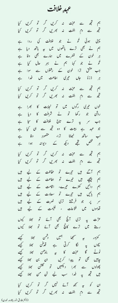 عہدِ خلافت Listen to 20220211-poem ehd e khilafat byAl Fazl International on hearthis.at ہم تجھ سے محبّت نہ کریں گر تو کریں کیا تجھ سے دمِ الفت نہ بھریں گر تو کریں کیا پہنی ہوئی تُو نے جو خلافت کی ردا ہے ہم نے بھی ترے ہاتھوں میں یہ ہاتھ دیا ہے ہر خون کے قطرے میں ہمارے بھی وفا ہے تُو نے جو کہا ہم نے بہر حال کیا ہے جب عشق تِرا خون کے رشتوں سے سوا ہے ہر ذرّۂ جاں تیری اطاعت میں فدا ہے ہم تجھ سے محبّت نہ کریں گر تو کریں کیا تجھ سے دمِ الفت نہ بھریں گر تو کریں کیا خوں تیری رگوں میں تو نجابت کا بھرا ہے روشن جو رکھا تو نے شرافت کا دیا ہے جب سر پہ ترے تاج خلافت کا سجا ہے جو عہد ہے بیعت کا وہ تجھ سے ہی کیا ہے اب ساتھ نبھانا تِرا، مقصودِ وفا ہے ہر شخص تجھے دیکھ کے دیوانہ ہوا ہے ہم تجھ سے محبّت نہ کریں گر تو کریں کیا تجھ سے دمِ الفت نہ بھریں گر تو کریں کیا ہم آگے ہیں تیرے تو حفاظت کے لیے ہیں ہم پیچھے ہیں تیرے تو اطاعت کے لیے ہیں ہم دائیں کھڑے تیرے، اقامت کے لیے ہیں ہم بائیں ہیں تیرے تو سعادت کے لیے ہیں سر پر جو فرشتے تری نصرت کے لیے ہیں قدموں میں فتوحات ، غنیمت کے لیے ہیں عزّت پہ تری آنچ بھی آئے تو بھلا کیوں رستے میں ترے کانچ بھی آئے تو بھلا کیوں کمزور یہ سمجھا ہمیں دشمن بھلا کیسے سچوں پہ لگا کرتی ہے قدغن بھلا کیسے ٹوٹے گا محبّت کا یہ بندھن بھلا کیسے چاہیں بھی تو پیدا کریں ان بن بھلا کیسے پھولوں سے بھرا دیکھیں تو گلشن بھلا کیسے ہیں تجھ پہ فدا سب لیے تن من بھلا کیسے ان کو یہ سمجھ آئے نہیں گر تو کریں کیا تجھ سے دمِ الفت نہ بھریں گر تو کریں کیا (ڈاکٹر طارق انور باجوہ۔ لندن)