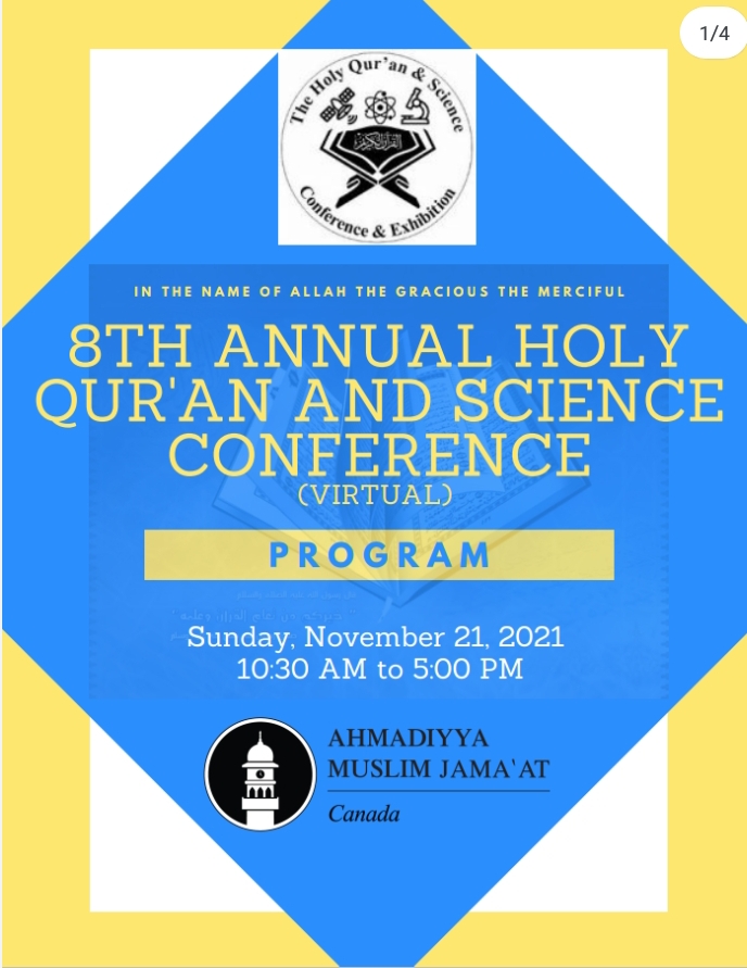 جماعت احمدیہ کینیڈا کے نیشنل سیکرٹری تعلیم مکرم مرزا حمید احمد صاحب نے بتایا کہ اللہ تعالیٰ کے فضل سے نیشنل شعبہ تعلیم کے زیرانتظام مورخہ 21؍نومبر2021ء کو ’’آٹھویں قرآن الحکیم و سائنس کانفرنس‘‘ کا انعقاد کیا گیا ۔ Listen to 20220211-canada conference byAl Fazl International on hearthis.at Covid-19کی وجہ سے مذکورہ کانفرنس کاآن لائن انعقاد ہوا۔ امسال یہ کانفرنس قرآن حکیم میں بیان شدہ سائنسی علامات و نشانات کی روشنی میں منعقد ہوئی۔ بائیس ممتاز اسکالرز اور سائنسدانوں نے میڈیسن اور موسمی تغیرات سے متعلق اپنے اپنے خیالات اور حالیہ جدید ترین ریسرچ کی روشنی میں مقالے پیش کئے۔ کانفرنس کا آغاز تلاوت قرآن کریم اور اس کے ترجمہ کے ساتھ کیا گیا۔ بعد ازاں کانفرنس کے رابطہ کار کی حیثیت سے مکرم جمیل احمد صاحب نے استقبالیہ کلمات کہے۔ جبکہ نیشنل سیکرٹری تعلیم جماعت احمدیہ کینیڈا، مکرم ڈاکٹر مرزا حمید احمد صاحب نے کانفرنس کے صدر کی حیثیت سے اس نوعیت کی کانفرس کے آغاز و مقاصد پر روشنی ڈالی۔ کانفرنس میں دنیا کے مختلف حصوں سے اسکالرز اور سائنسدانوں نے حصہ لیا۔ یہ اسکالرز آئرلینڈ، انگلینڈ، ناروے، امریکہ اور کینیڈا سے شامل ہوئے۔ ہر سیشن میں پندرہ منٹ سپیکر کو دیے گئے۔ جبکہ سوالات کے جوابات دینے کے لیے بھی ایک ایک پینل مقرر کیا گیا تھا۔ کل 22 سپیکرز نے اس علمی و سائنسی کانفرنس میں حصہ لیا۔ ہر سپیکر نے قرآن حکیم میں بیان شدہ حقائق کی روشنی میں جدید ریسرچ پر مبنی اپنے اپنے گراں قدر و بیش قیمت علمی مقالہ جات پیش کئے۔ آخر میں نیشنل سیکرٹری صاحب تعلیم نے جملہ مقالہ جات پیش کرنے والے تمام سپیکر صاحبان کا دلی شکریہ ادا کیا۔ جبکہ محترم ملک لال خان صاحب، امیر جماعت احمدیہ کینیڈا نے اختتامی خطاب کے علاوہ آخر میں دعا کروائی ۔ اس خصوصی سائنس کانفرنس کی آفیشل ویب سائٹ (www.quranandscience.org) پر تین ہزار سے زائد ناظرین نے بھی شمولیت اختیارکی ۔ ٭…٭…٭