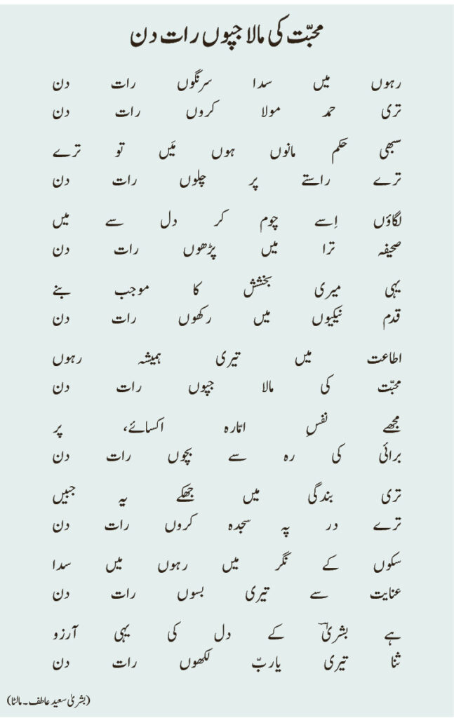 Listen to 20220225- poem muhabbat ki mala byAl Fazl International on hearthis.at رہوں میں سدا سرنگوں رات دن تری حمد مولا کروں رات دن سبھی حکم مانوں ہوں مَیں تو ترے ترے راستے پر چلوں رات دن لگاؤں اِسے چوم کر دل سے میں صحیفہ ترا میں پڑھوں رات دن یہی میری بخشش کا موجب بنے قدم نیکیوں میں رکھوں رات دن اطاعت میں تیری ہمیشہ رہوں محبّت کی مالا جپوں رات دن مجھے نفسِ امّارہ اکسائے، پر برائی کی رہ سے بچوں رات دن تری بندگی میں جھکے یہ جبیں ترے در پہ سجدہ کروں رات دن سکوں کے نگر میں رہوں میں سدا عنایت سے تیری بسوں رات دن ہے بشریٰؔ کے دل کی یہی آرزو ثنا تیری یاربّ لکھوں رات دن (بشریٰ سعید عاطف ۔ مالٹا)