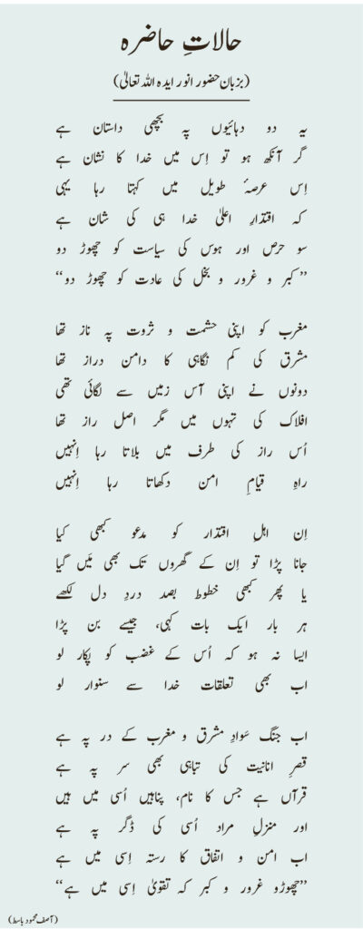 Listen to 20220301-halaat e hazira ....poem byAl Fazl International on hearthis.at یہ دو دہائیوں پہ بچھی داستان ہے گر آنکھ ہو تو اِس میں خدا کا نشان ہے اِس عرصۂ طویل میں کہتا رہا یہی کہ اقتدارِ اعلیٰ خدا ہی کی شان ہے سو حرص اور ہوس کی سیاست کو چھوڑ دو ’’کبر و غرور و بخل کی عادت کو چھوڑ دو‘‘ مغرب کو اپنی حشمت و ثروت پہ ناز تھا مشرق کی کم نگاہی کا دامن دراز تھا دونوں نے اپنی آس زمیں سے لگائی تھی افلاک کی تہوں میں مگر اصل راز تھا اُس راز کی طرف میں بلاتا رہا اِنہیں راہِ قیامِ امن دکھاتا رہا اِنہیں اِن اہلِ اقتدار کو مدعو کبھی کیا جانا پڑا تو اِن کے گھروں تک بھی مَیں گیا یا پھر کبھی خطوط بصد دردِ دل لکھے ہر بار ایک بات کہی، جیسے بن پڑا ایسا نہ ہو کہ اُس کے غضب کو پکار لو اب بھی تعلقات خدا سے سنوار لو اب جنگ سَوادِ مشرق و مغرب کے در پہ ہے قصرِِ انانیت کی تباہی بھی سر پہ ہے قرآں ہے جس کا نام، پناہیں اُسی میں ہیں اور منزلِ مراد اُسی کی ڈگر پہ ہے اب امن و اتفاق کا رستہ اِسی میں ہے ’’چھوڑو غرور و کبر کہ تقویٰ اِسی میں ہے‘‘ (آصف محمود باسط)