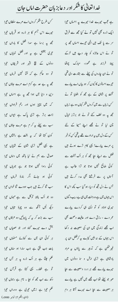 ہے عجب میرے خدا میرے پہ احساں تیرا کس طرح شکر کروں اے مرے سلطاں تیرا ایک ذرہ بھی نہیں تو نے کیا مجھ سے فرق میرے اس جسم کا ہر ذرہ ہو قرباں تیرا سر سے پا تک ہیں الٰہی تیرے احساں مجھ پر مجھ پہ برسا ہے سدا فضل کا باراں تیرا تو نے اس عاجزہ کو چار دیے ہیں لڑکے تیری بخشش ہے یہ اور فضل نمایاں تیرا پہلا فرزند ہے محمود، مبارک چوتھا دونوں کے بیچ بشیر اور شریفاں تیرا تو نے ان چاروں کی پہلے سے بشارت دی تھی تو وہ حاکم ہے کہ ٹلتا نہیں فرماں تیرا تیرے احسانوں کا کیوں کر ہو بیاں اے پیارے مجھ پہ بے حد ہے کرم اے مرے جاناں تیرا تخت پر شاہی کے ہے مجھ کو بٹھایا تو نے دین و دنیا میں ہوا مجھ پہ ہے احساں تیرا کس زباں سے میں کروں شکر کہاں وہ ہے زباں کہ میں ناچیز ہوں اور رحم فراواں تیرا مجھ پہ وہ لطف کئے تو نے جو برترزِ خیال ذات برتر ہے تری پاک ہے ایواں تیرا چن لیا تو نے مجھے اپنے مسیحا کے لئے سب سے پہلے یہ کر م ہے مرے جاناں تیرا کس کے دل میں یہ ارادے تھے یہ تھی کس کو خبر کون کہتا تھا کہ یہ بخت ہے رخشاں تیرا پر مرے پیارے! یہی کام ترے ہوتے ہیں ہے یہی فضل تری شان کے شایاں تیرا فضل سے اپنے بچا مجھ کو ہر اک آفت سے صدق سے ہم نے لیا ہاتھ میں داماں تیرا کوئی ضائع نہیں ہوتا جو ترا طالب ہے کوئی رسوا نہیں ہوتا جو ہے جویاں تیرا آسماں پر سے فرشتے بھی مدد کرتے ہیں کوئی ہو جائے اگر بندۂ فرماں تیرا جس نے دل تجھ کو دیا، ہو گیا سب کچھ اس کا سب ثنا کرتے ہیں جب ہووے ثنا خواں تیرا اس جہاں میں ہے وہ جنت میں ہی بے ریب و گماں وہ جو اک پختہ توکل سے ہے مہماں تیرا میری اولاد کو تو ایسی ہی کردے پیارے دیکھ لیں آنکھ سے وہ چہرۂ تاباں تیرا عمر دے ، رزق دے اور عافیت و صحت بھی سب سے بڑھ کر یہ کہ پاجائیں وہ عرفاں تیرا اب مجھے زندگی میں ان کی مصیبت نہ دکھا بخش دے میرے گناہ اور جو عصیاں تیرا اس جہاں کے نہ بنیں کیڑے یہ کر فضل ان پر ہر کوئی ان میں سے کہلائے مسلماں تیرا غیر ممکن ہے کہ تدبیر سے پاؤں یہ مراد بات جب بنتی ہے جب سارا ہو ساماں تیرا بادشاہی ہے تری ارض و سما دونوں میں حکم چلتا ہے ہر اک ذرہ پہ ہر آں تیرا میرے پیارے مجھے ہر درد و مصیبت سے بچا تو ہے غفار۔ یہی کہتا ہے قرآں تیرا صبر جو پہلے تھا اب مجھے میں نہیں ہے پیارے دکھ سے اب مجھ کو بچا ۔ نام ہے رحماں تیرا ہر مصیبت سے بچا اے میرے آقا ہر دم حکم تیرا ہے زمیں تیری ہے دوراں تیرا (اخبار الحکم 17 نومبر 1900ء)
